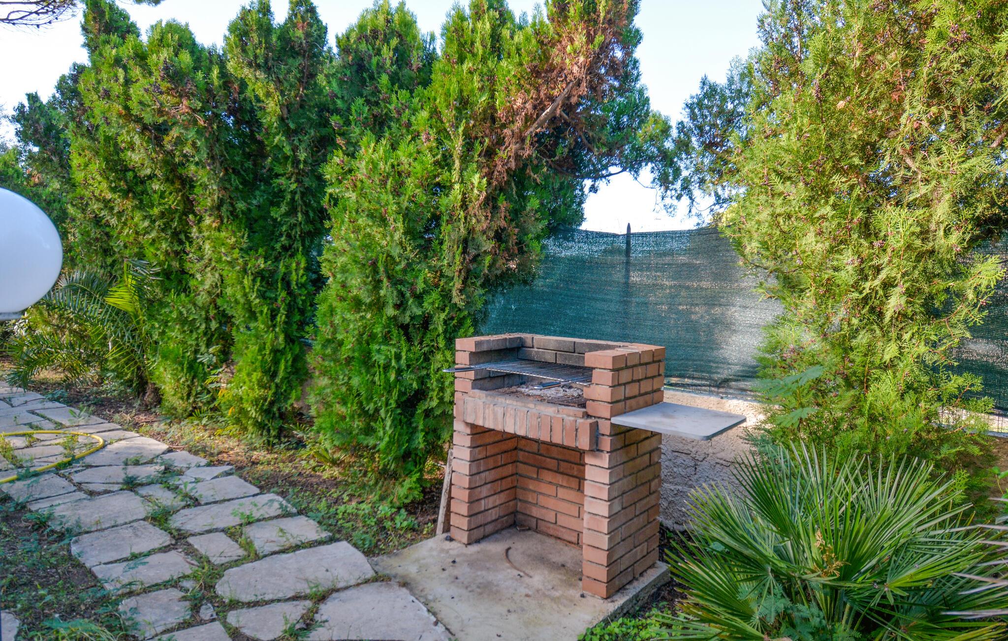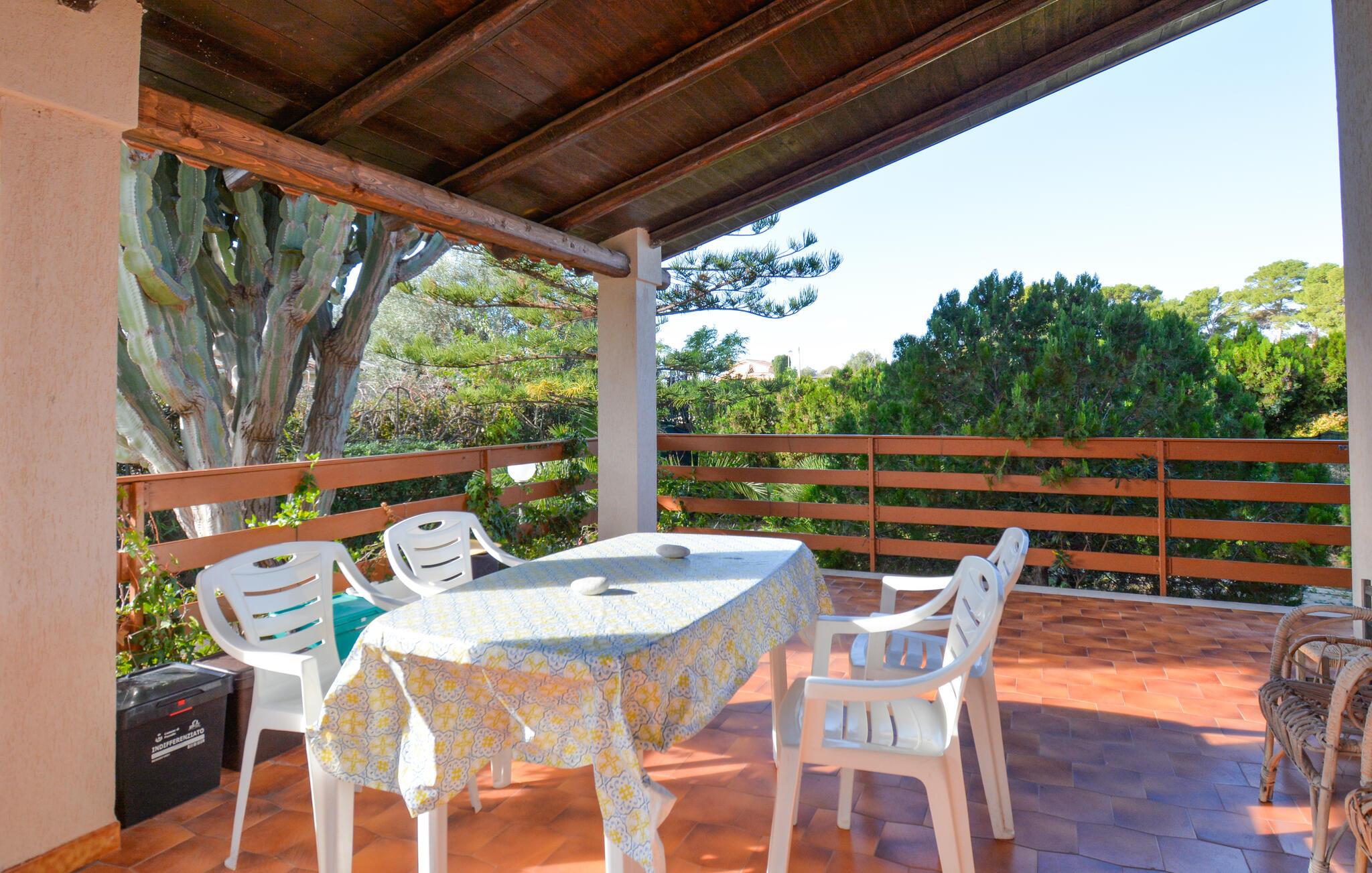 Udenfor er der en stor overdækket terrasse, ideel til udendørs spisning eller hyggelige aftener med lyden af ??havet i baggrunden. Arranger grillfester eller tag plads i haven, som danner et grønt paradis med middelhavsplanter og palmer.