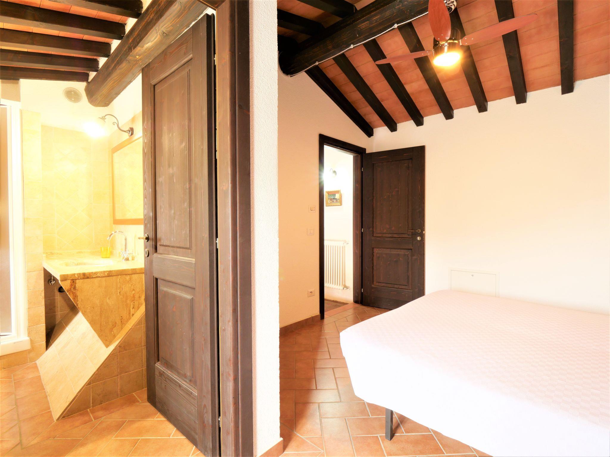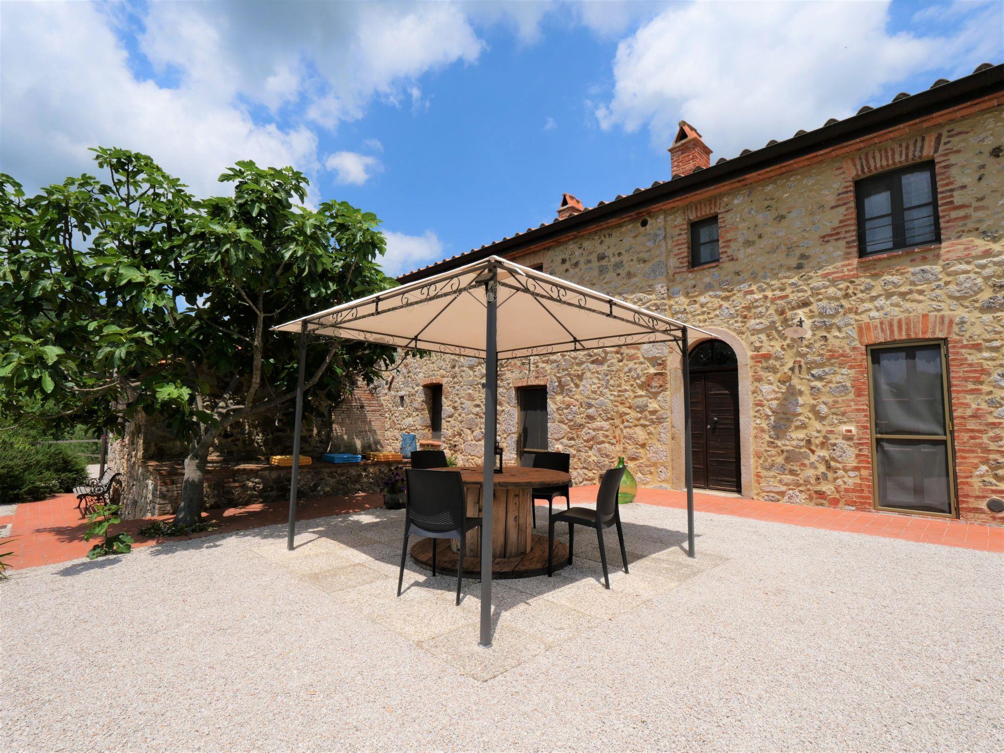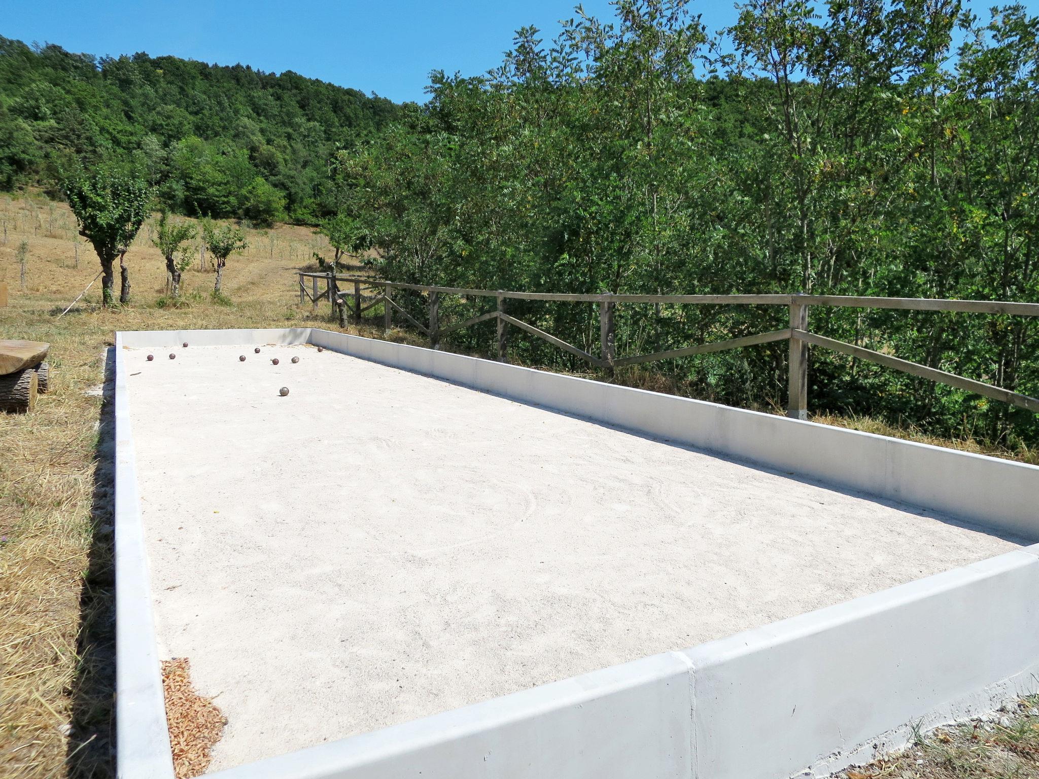 Country house "Podere Pian dei Carpini", 435 m a.s.l., detached, surrounded by trees and fields. 4 apartments in the residence. Below Prata 2.6 km from the centre of Prata, 10 km from the centre of Massa Marittima, in a secluded, quiet position, 30 km from the sea, in the countryside. For shared use: natural state property 2'000 m2 (fenced), garden with flowers and trees, meadow, swimming pool fenced (6 x 4 m, depth 120 - 130 cm, seasonal availability: 28.May. - 30.Sep.) with salt-electrolysis pool-cleaning system. Unconventional pool shape. Outdoor shower, boccia, garden furniture, barbecue. Steep motor access (700 m via unmade road). Parking (for 3 cars) on the premises. Shop 2.6 km, supermarket 10 km, restaurant 2.6 km, bicycle rental 11 km, bus stop 2 km, sandy beach 30 km. Walking paths from the house 50 m. Nearby attractions: San Galgano Abbey 22 km, Giardino dei suoni 11 km, Siena 60 km. Well-known lakes can easily be reached: Accesa 20 km. Hiking paths: Mountain-bike 7 km. Please note: the owner lives in the same residence. The owner has a dog. Small house for children and swing. The pool can be reached via an external staircase.