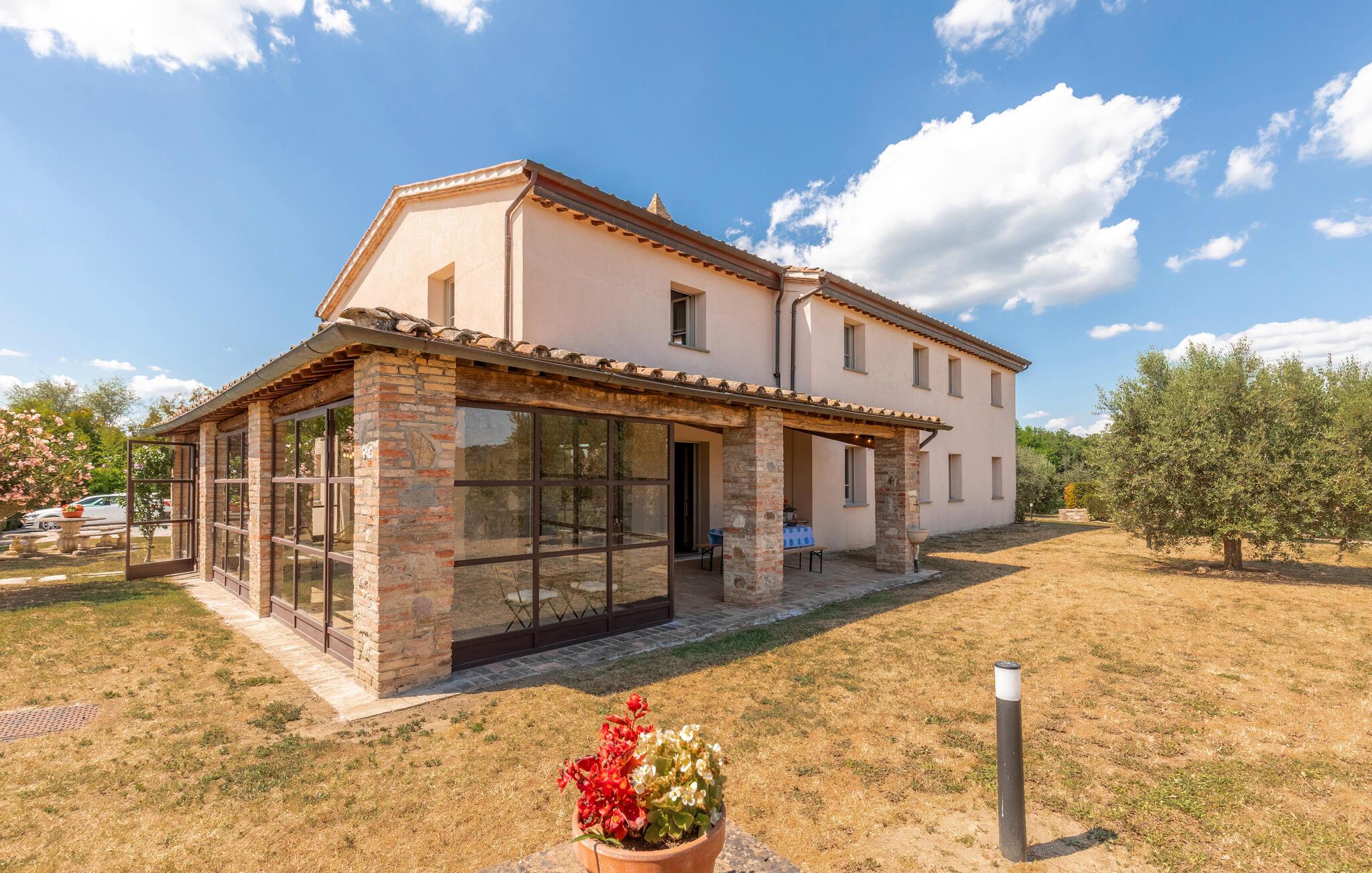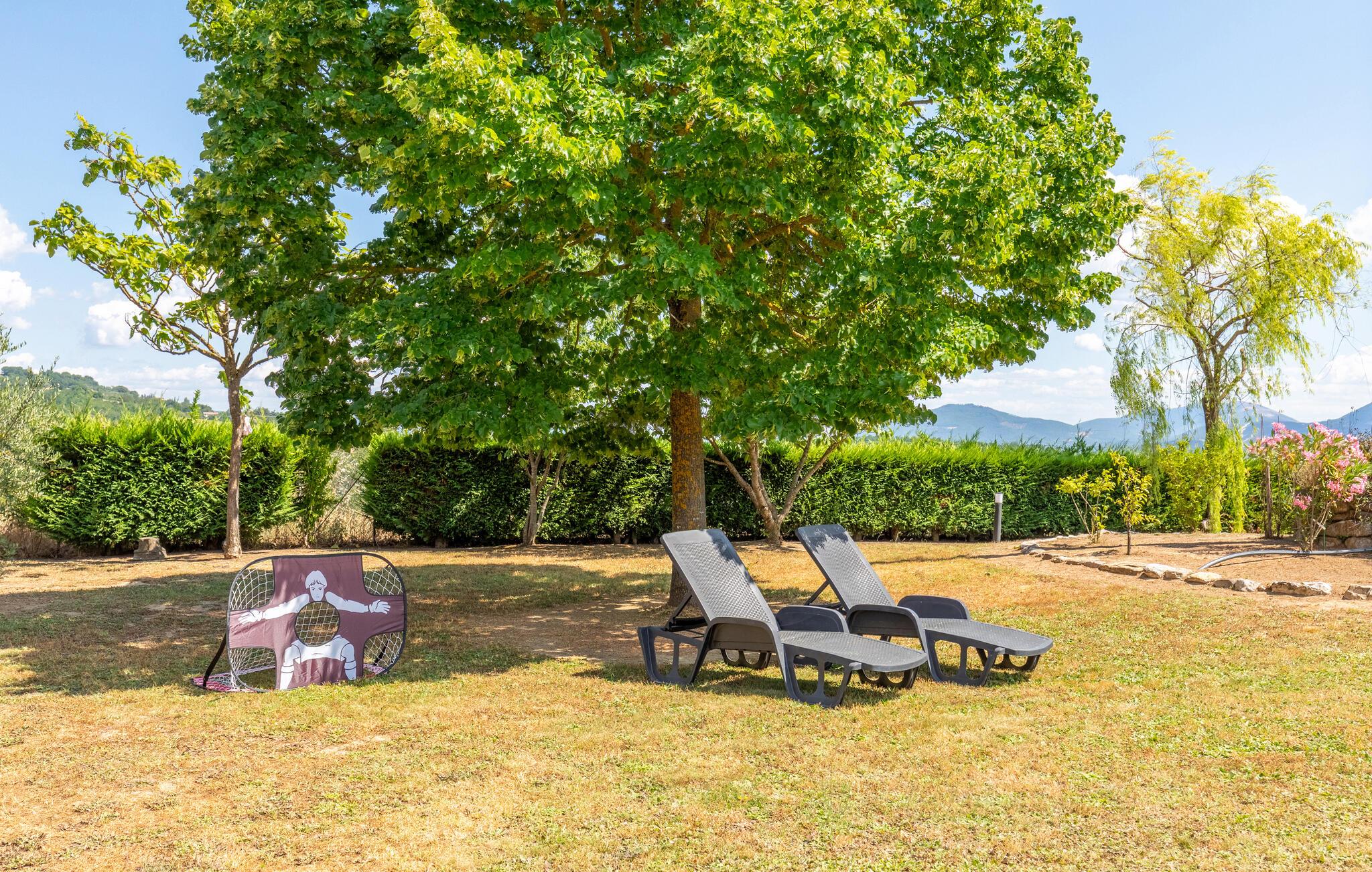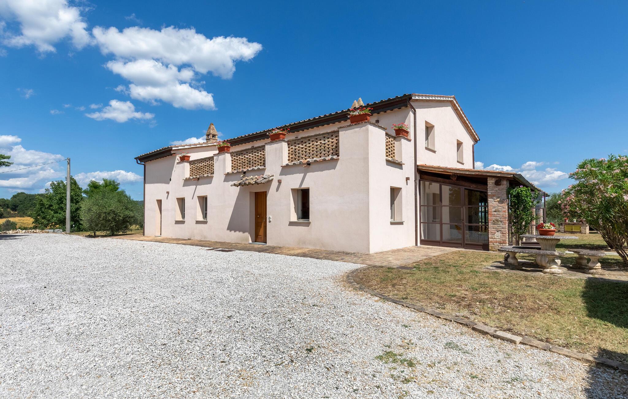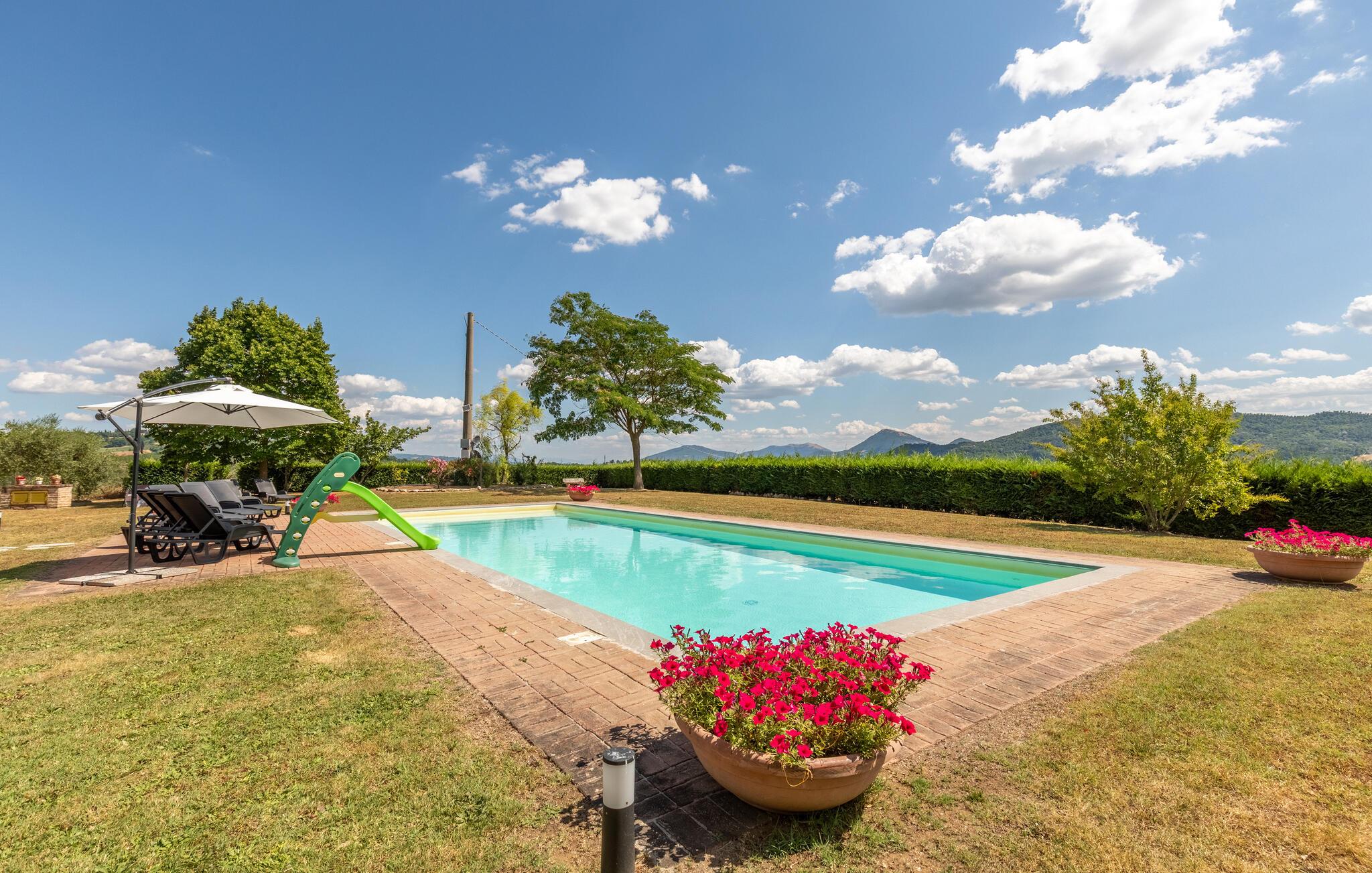 Nyd Umbriens skønhed i denne charmerende ferielejlighed i stueetagen af et tofamiliershus. Den fredelige beliggenhed giver jer en betagende udsigt over den vidtstrakte dal, mens den private veranda er perfekt til måltider under åben himmel. De lyse rum er enkelt, men hyggeligt indrettet og indbyder til afslapning efter en oplevelsesrig dag. Den fælles pool giver mulighed for en forfriskende dukkert, og det velholdte udendørsområde med sit mediterrane præg skaber en idyllisk atmosfære – ideelt til at koble helt af.