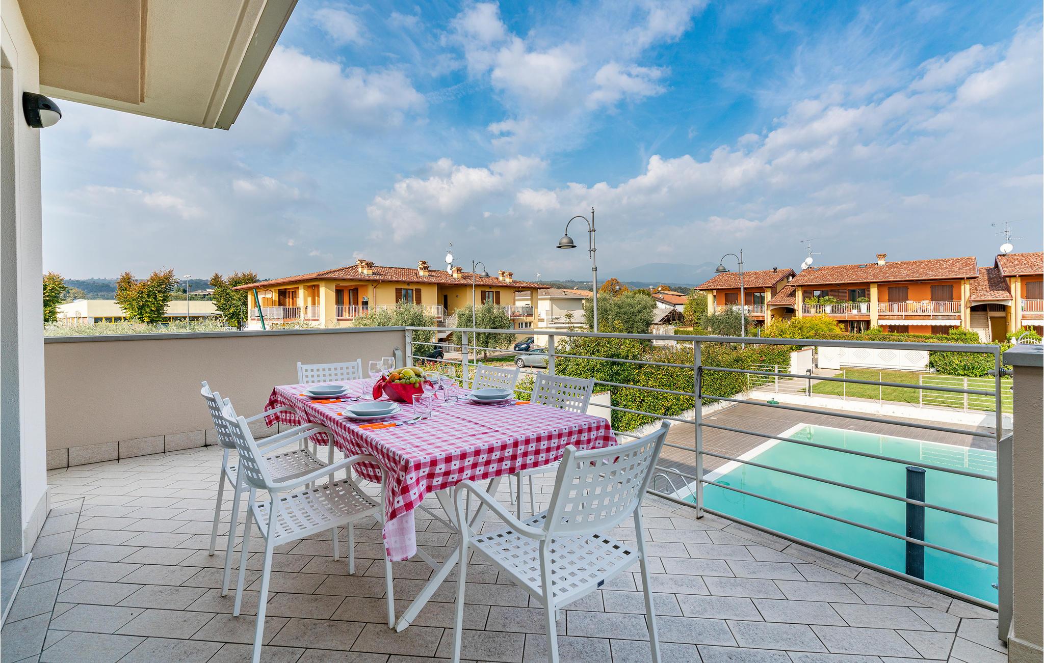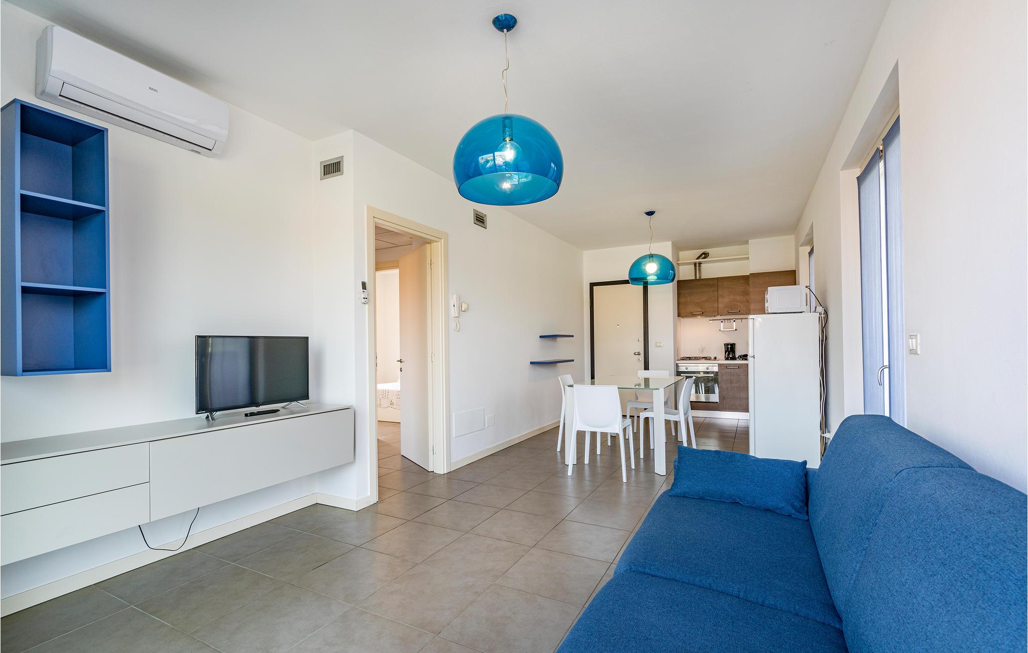 Hvis I drømmer om en afslappende ferie i Norditalien, er denne feriebolig lige noget for jer. Lejligheden ligger tæt på Gardasøens sydvestbred og byder på nogle optimale rammer, hvor familien virkelig kan stresse af. I kan se frem til lyse og blå farver i indretningen, og fra stuen er der udgang til terrassen, hvor I kan samles om måltiderne, mens bjergene troner i baggrunden.
