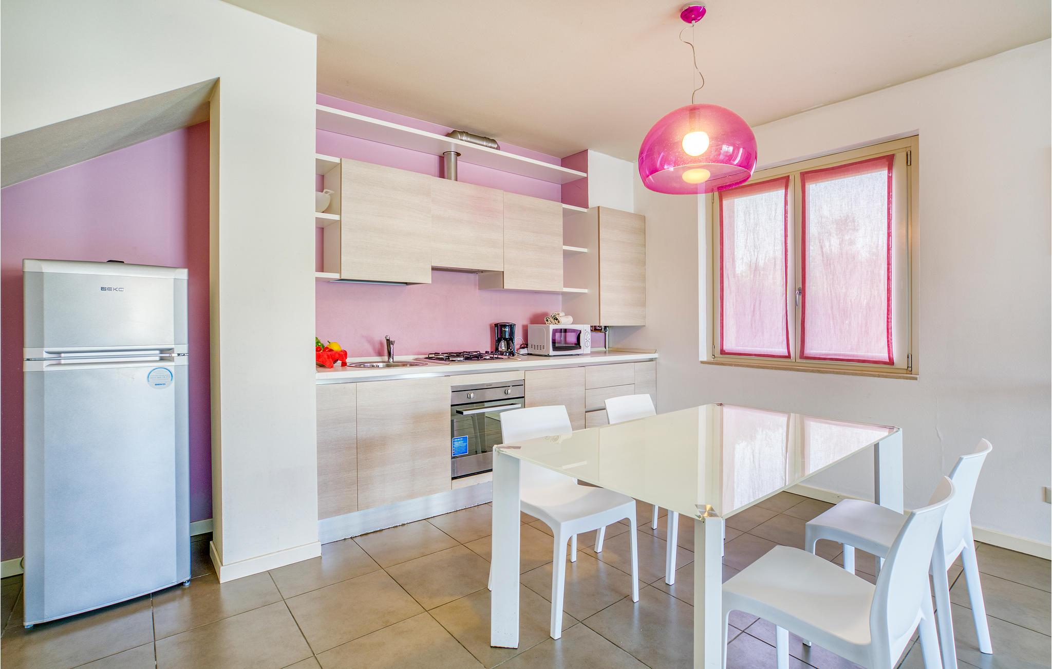 Hvis I drømmer om en afslappende ferie i Norditalien, er denne feriebolig lige noget for jer. Lejligheden ligger tæt på Gardasøens sydvestbred og byder på nogle optimale rammer, hvor familien virkelig kan stresse af. I kan se frem til lyse og blå farver i indretningen, og fra stuen er der udgang til terrassen, hvor I kan samles om måltiderne. Trapperne fører til en stor, fælles terrasse, hvor I kan hoppe en tur i poolen eller slænge jer i liggestolene.
