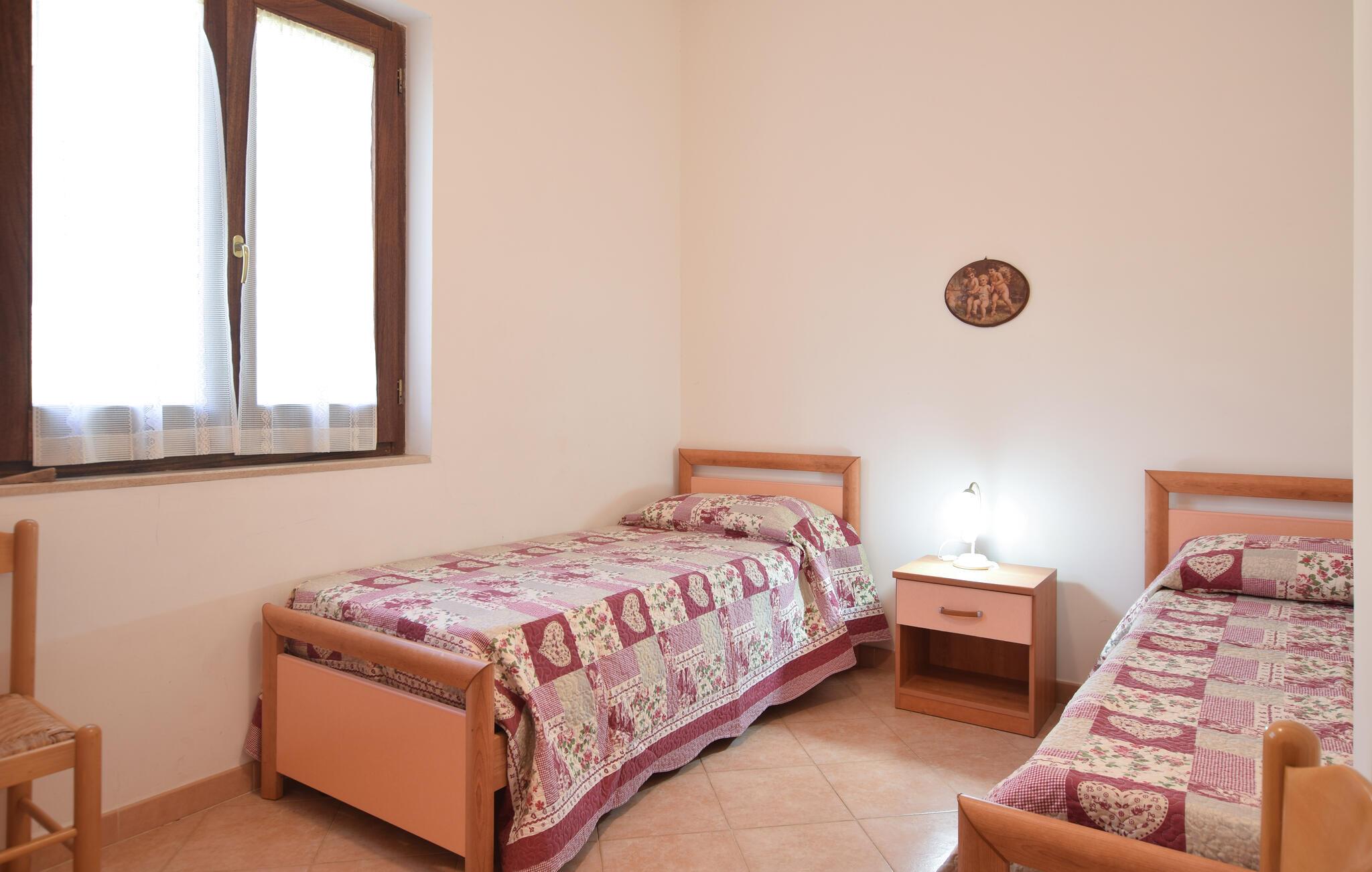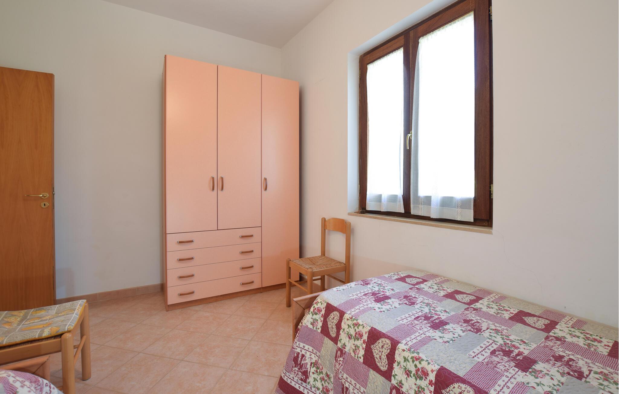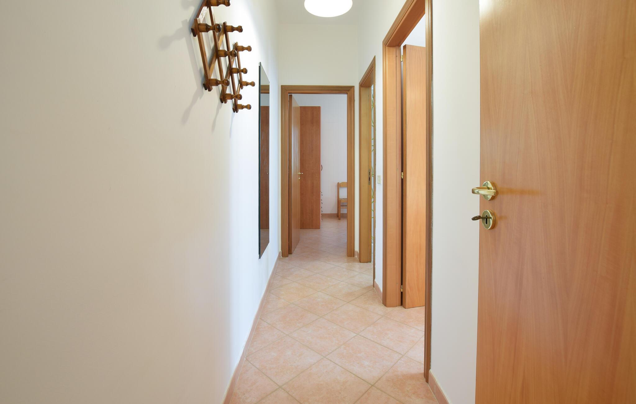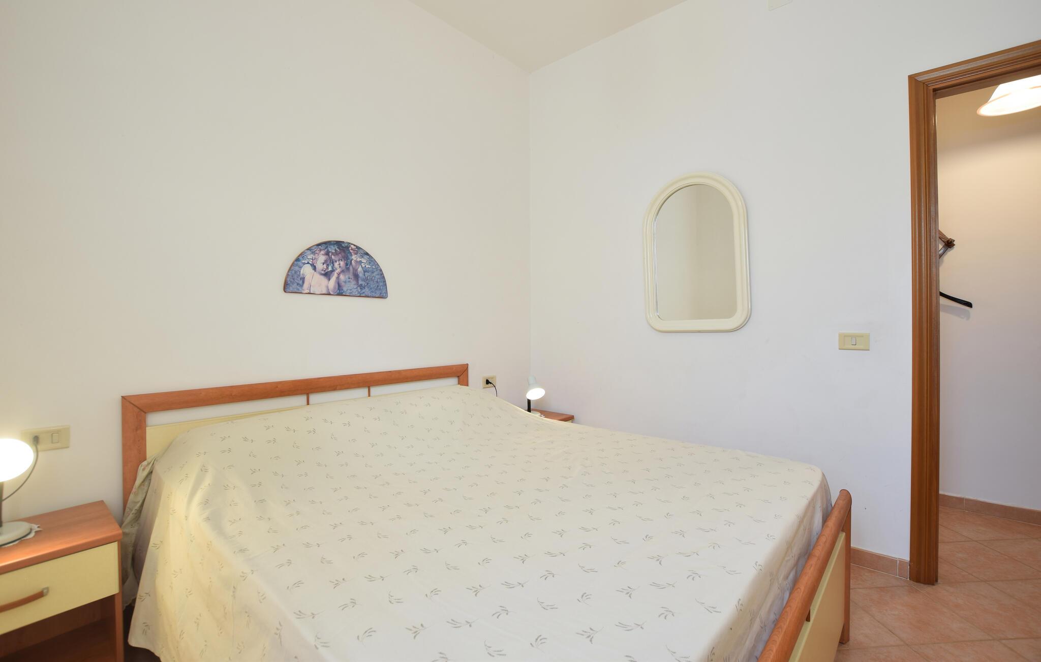 Tilbring jeres ferie i dette feriehus, omgivet af frodige grønne områder. Sæt jer til rette i den lyse, enkelt og funktionelt indrettede opholds- og spisestue. Tilbered middelhavsretter i det åbne køkken, og dæk derefter det tilstødende bord til et fælles måltid. Lad terrassedørene stå åbne og nyd det naturlige lys. Slap af i sofaen med en bog eller planlæg jeres næste udflugter.