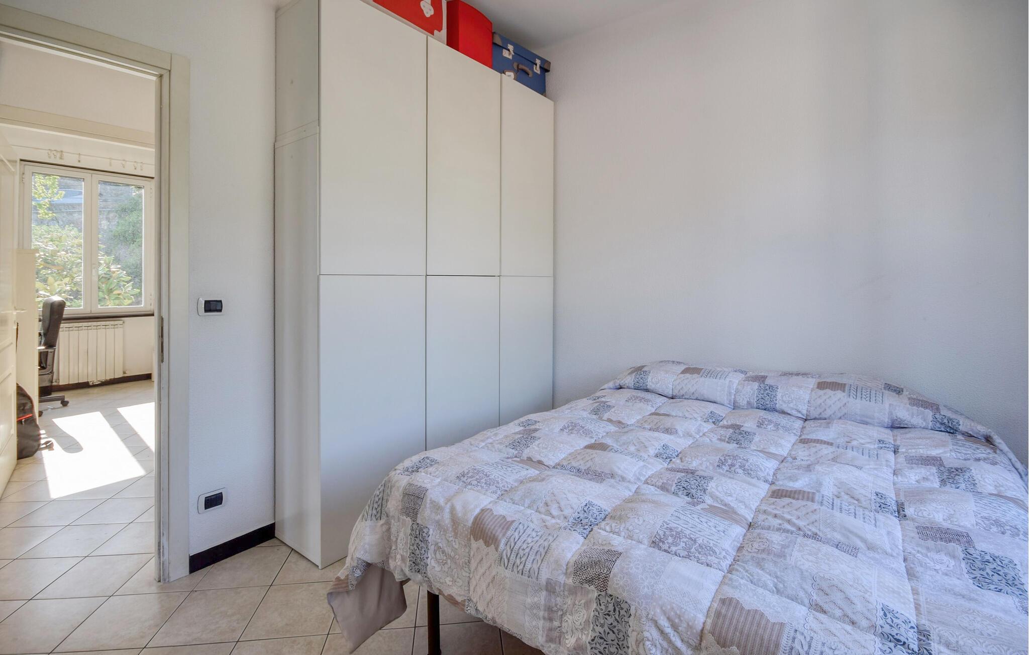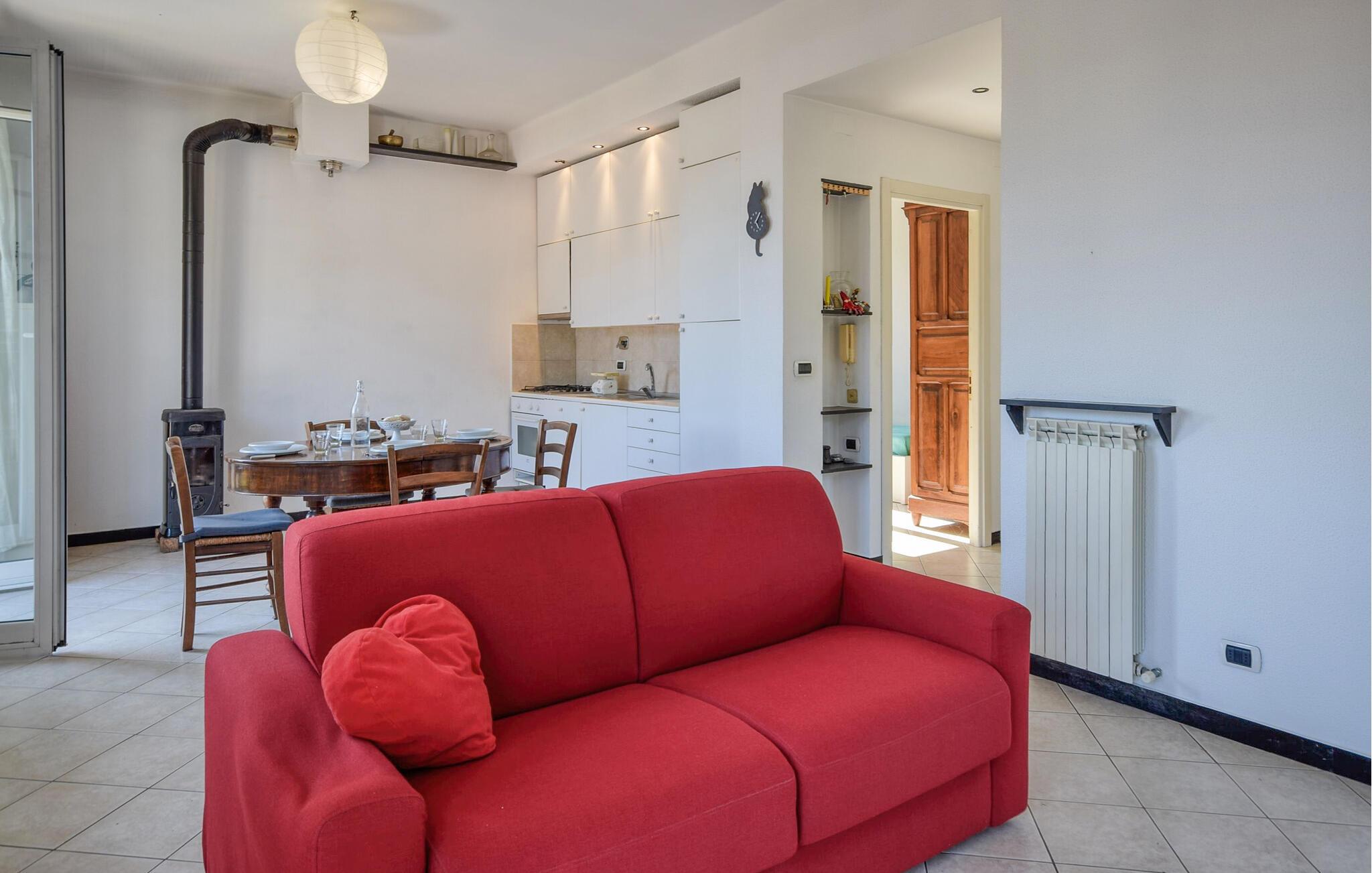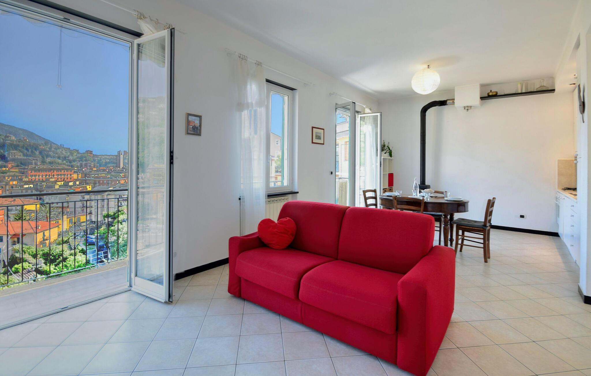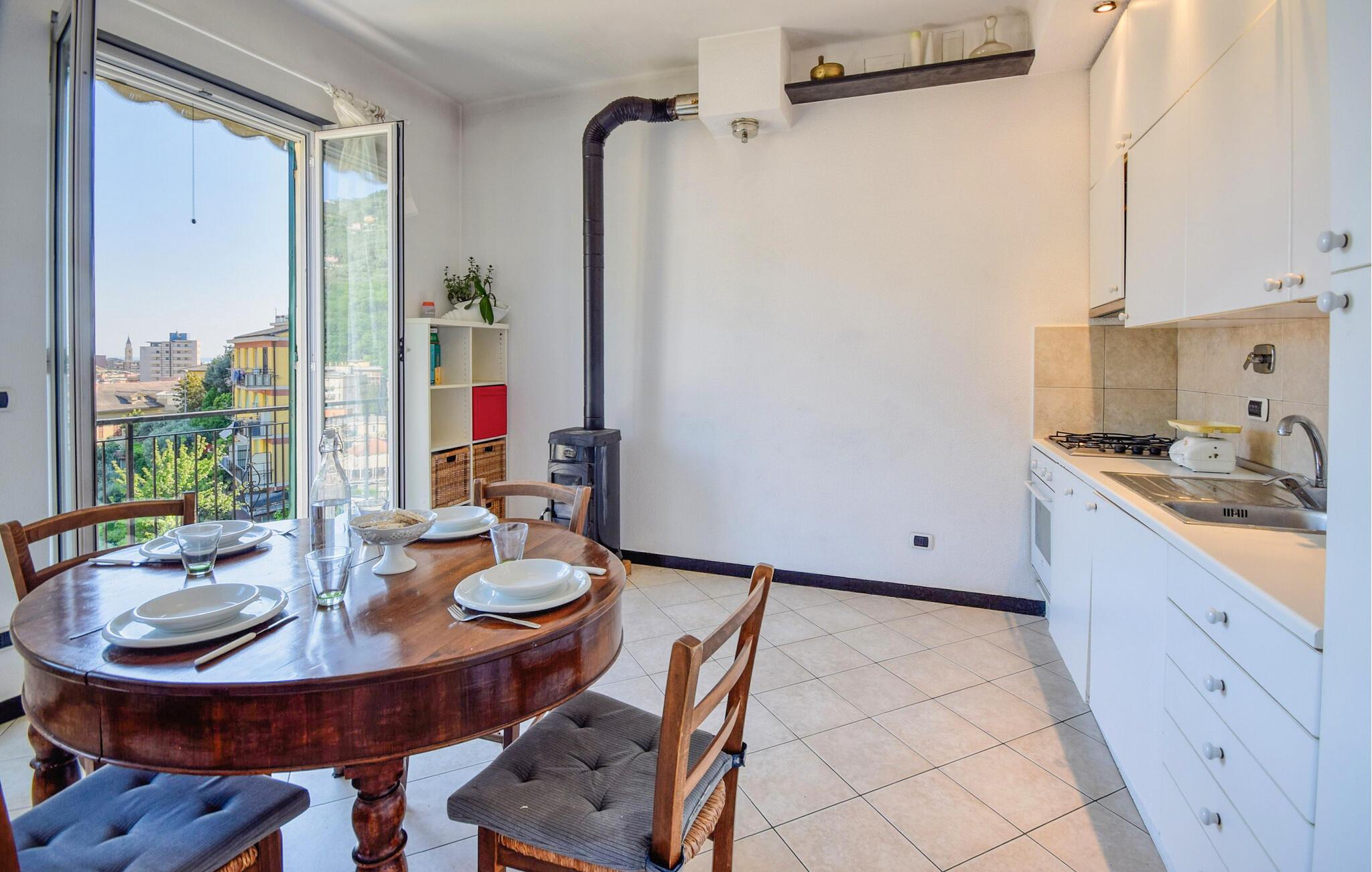 Denne lyse og rummelige lejlighed i stueetagen byder jer velkommen på bakkerne over Recco og byder jer velkommen til en smuk panoramaudsigt over byen. Her finder I masser af plads til at slappe af fra hverdagen med familien. Lad den friske brise strømme gennem de hyggelige værelser, mens I tilbereder lækre pastaretter, planlægger jeres aktiviteter over harmoniske måltider og afslutter en begivenhedsrig dag med et brætspil eller en film.