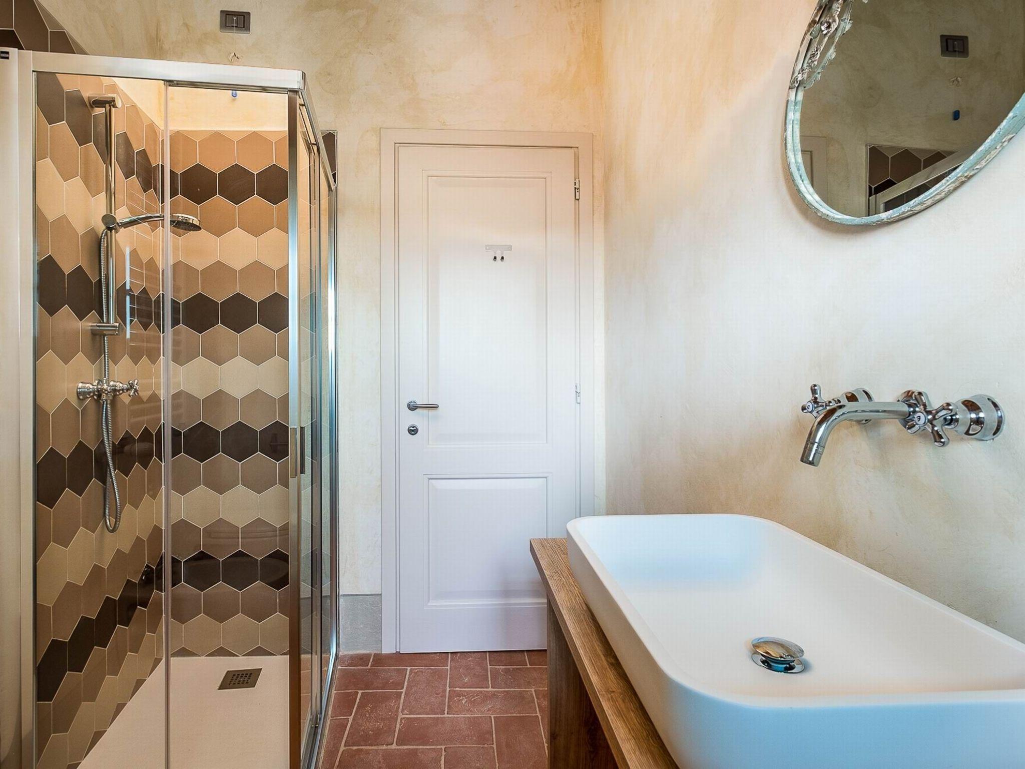 Inside, the flat is arranged on two cosy levels. The ground floor features an inviting open-plan area with a functional kitchenette, complete with fridge-freezer, dishwasher, microwave, toaster, electric kettle, moka coffee machine and iron, adjacent to the dining and living area. Here, you will also find a satellite TV and a convenient toilet. Going up the stairs, you will reach the master double bedroom with its own bathroom and shower; similarly, on the first floor, you will find another double bedroom with en-suite bathroom, also equipped with shower, guaranteeing privacy and comfort. The flat is also equipped with air conditioning in the rooms, Wi-Fi, a hairdryer, a safe and an alarm system for your security.