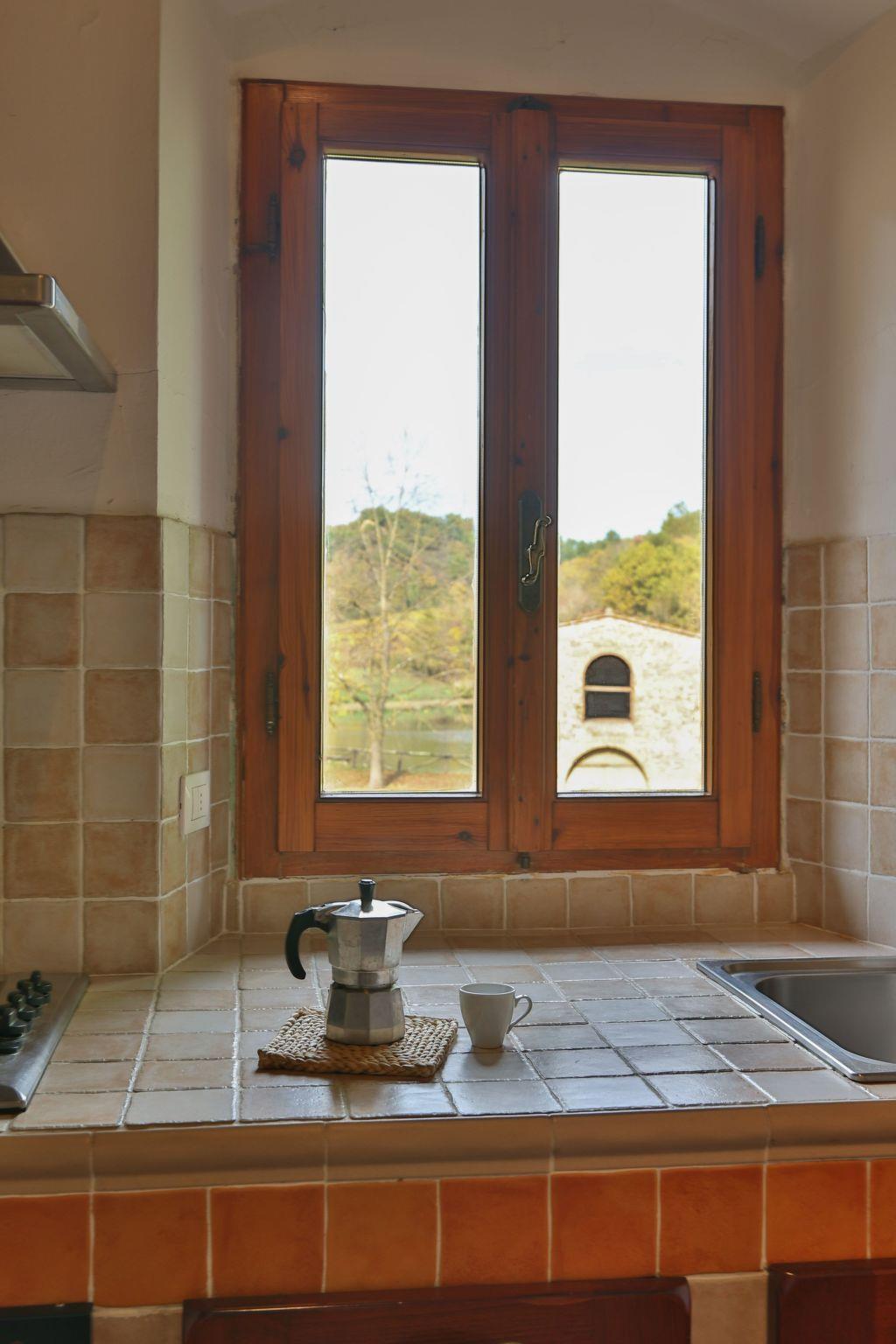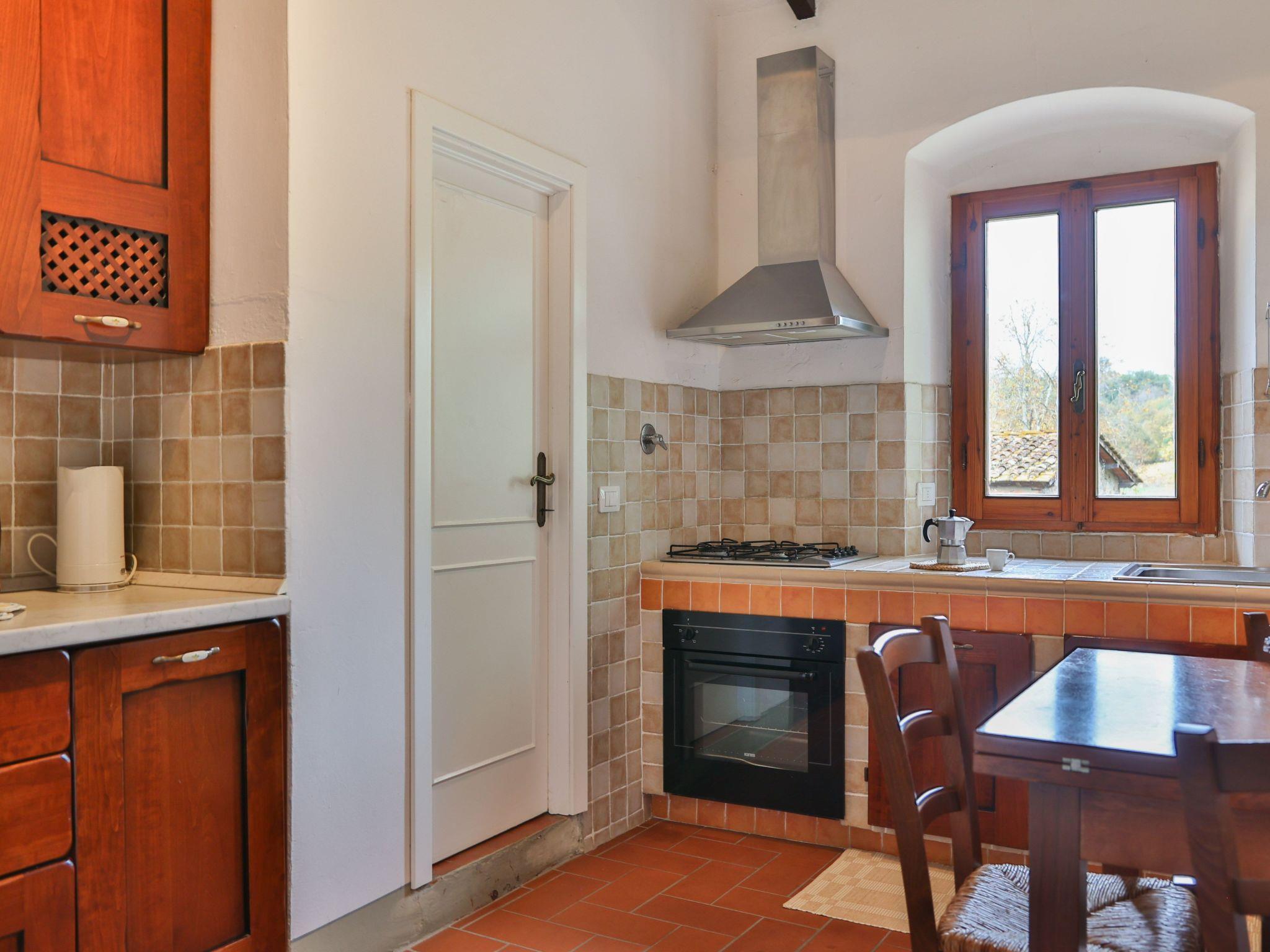 The holiday apartment is located in one of the 2 main buildings of the farmhouse. It is on the first floor and consists of a living room, kitchen, storage room, bedroom and bathroom. Like the other holiday accommodation on the agriturismo, this apartment is also decorated thoughtfully in a rustic style and exudes a very homely atmosphere. The living room with two sofas and a lovely wooden coffee table right by the fireplace provides the ideal place for romantic evenings as a couple, or also for cosy sociable evenings. There is also a single sofa bed in the living room suitable for children up to 12 years old. The kitchen has a small dining table for three people, and the fully-equipped kitchen provides a gas stove, oven and fridge with freezer compartment. The bedroom is furnished with a double bed, the bathroom has a shower and bidet. In addition, the holiday apartment provides digital television in the living room, independent gas heating and a washing machine in the storage room.