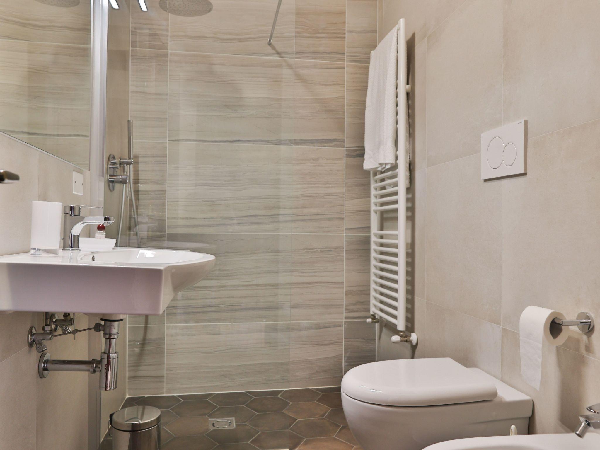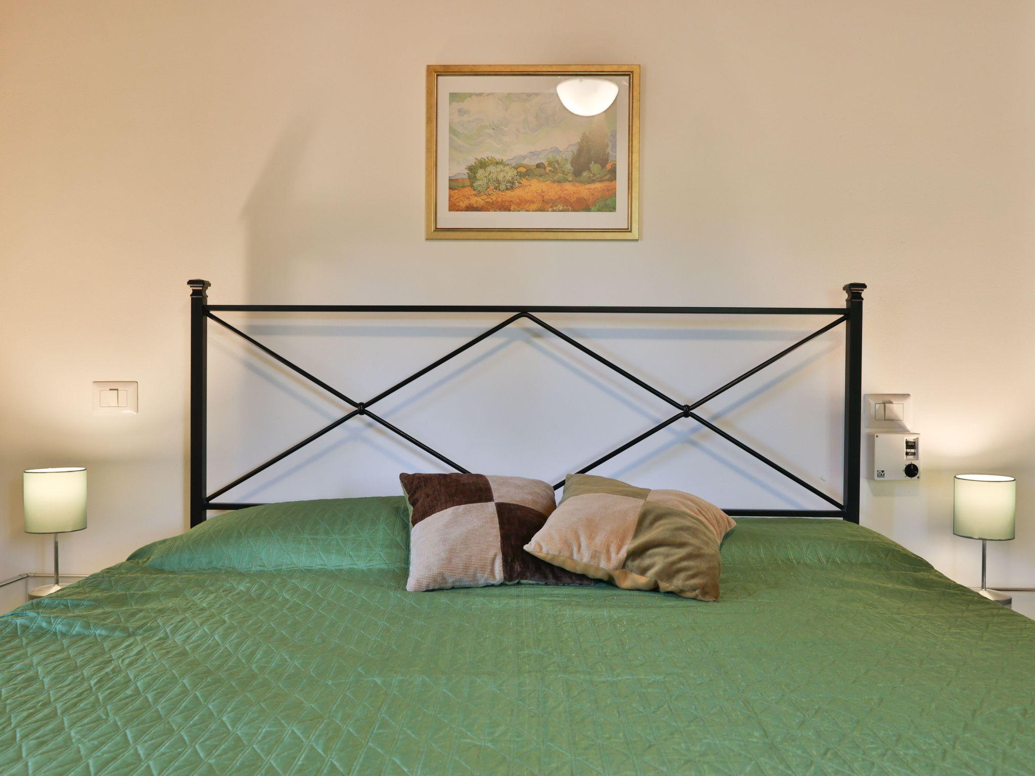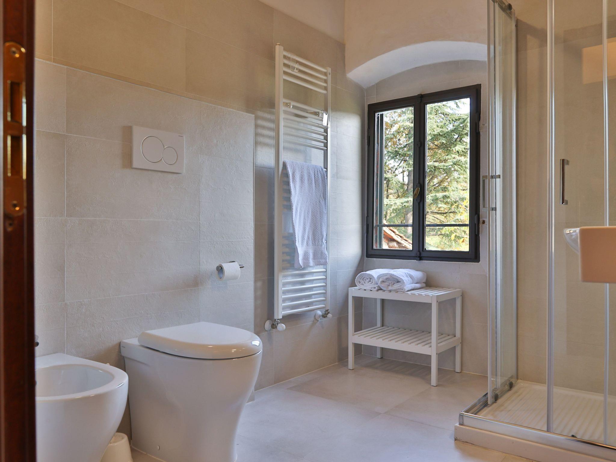 This newly renovated 100 m2 apartment located on the 1st and 2nd floor of one of the main buildings is presented with traditional Tuscan furnishings with modern bathrooms and a convenient open-plan kitchen. The 1st floor comprises: dining room and living room with dining table, open fireplace, cable-TV and kitchenette (4-burner gas hob, electric oven, fridge-freezer, dishwasher); and one double bedroom and bathroom (shower/bidet/WC). The 2nd floor is presented with beautiful high ceilings with Tuscan terracotta and large wooden beams, and comprises: a further double bedroom and a triple bedroom, both with en-suite bathrooms with shower/bidet/WC. Gas heating throughout the apartment. A washing machine is provided.