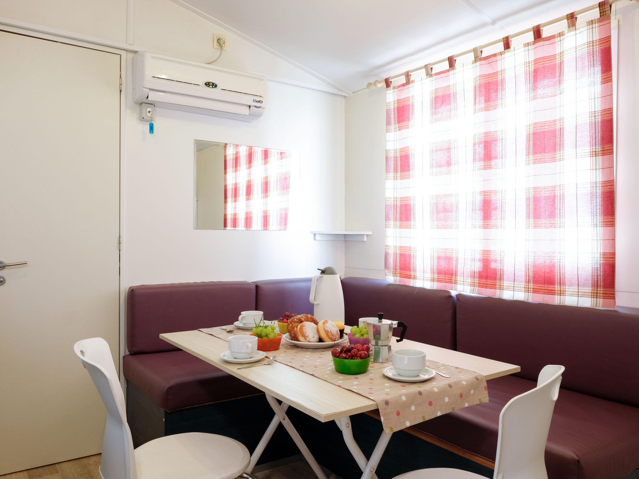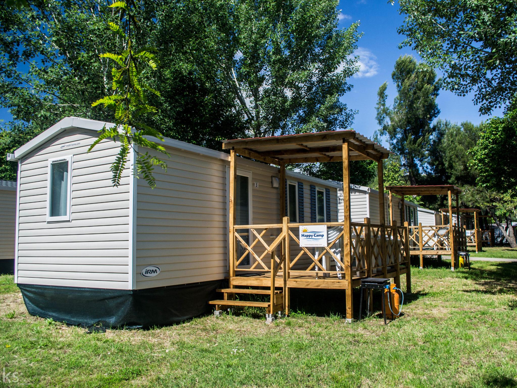 "Happy Easy", 3-room mobile home 25 m2. Object suitable for 4 adults + 1 child. Practical furnishings: living/sleeping room with 1 sleeping facility, dining table, electric heating and air conditioning. 1 room with 1 french bed (140 cm, length 190 cm). 1 room with 2 beds (70 cm, length 190 cm), 1 x 1 bunk beds (65 cm, length 179 cm). Open kitchen (4 hot plates). Shower/WC. Air-conditioning (extra). Terrace partly roofed. Terrace furniture, electric barbecue (portable), deck chairs (2). Facilities: mosquito net. Parking (1 car). Please note: non-smokers only. Maximum 1 small pet/ dog allowed. IT099013B1YCJCMG23