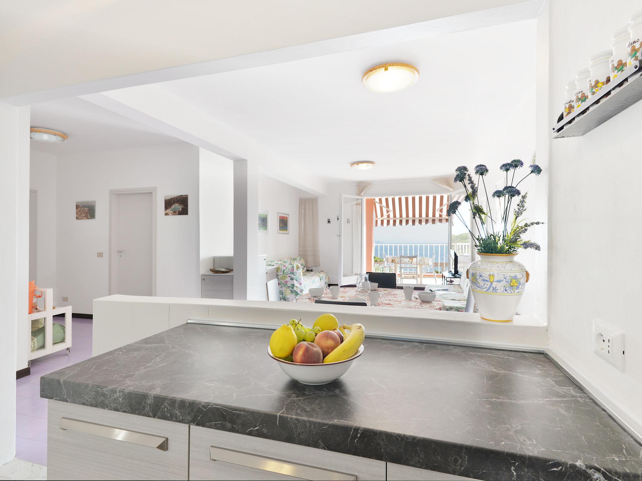 4-room apartment 100 m2 on 1st floor. Spacious and bright, comfortable furnishings: living room with dining table and TV. Exit to the terrace. 1 double bedroom with fan. Exit to the balcony. 1 room with 1 bed, 1 pull-out bed and fan. Exit to the balcony. 1 room with 2 beds and fan. Exit to the terrace. Open kitchen (mini-oven, dishwasher, 4 induction hot plates, kettle). Bathroom, shower/bidet/WC. No heating option. Balcony, terrace roofed. Terrace furniture. Marvellous view of the sea. Facilities: washing machine, baby cot for up to 2 year olds, hair dryer. Parking at 70 m. Please note: non-smoking house. No mandatory extra charges to be paid on-site. IT049021C2H6WAVJZG