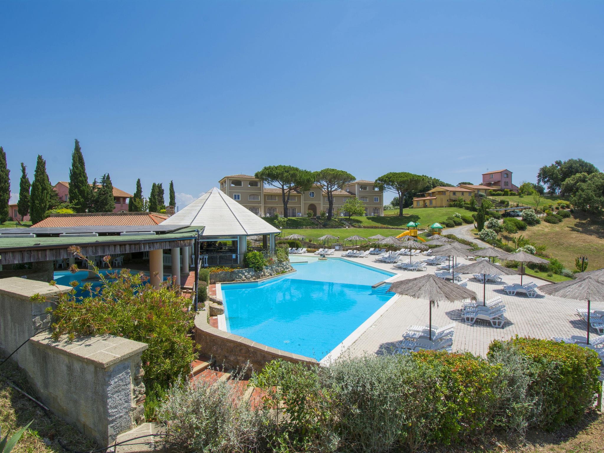 In an elevated position with very beautiful views of the sea and the surrounding hills. Child friendly resort "Il Felciaione", surrounded by trees, meadows and fields. 8 houses in the resort. 55 apartments in the residence. 3.5 km from the centre of Riparbella, in a sunny position on a slope, 100 m from the edge of the forest, 10 km from the sea, 10 km from the beach, in the countryside. For shared use: property 350'000 m2 with plants and trees, meadow, swimming pool (depth 40 - 140 cm, seasonal availability: 15.May. - 25.Sep.). Terrace, garden furniture, children's playground. In the complex: restaurant, bar, bistro, WiFi, washing machine (extra), tumble dryer (for shared use, extra), bicycle rental. Linen change (suppl. charge extra). Towel change (suppl. charge extra). Bread roll service. Parking at the house. E-charging station. Shop 3.5 km, supermarket 10 km, bus stop "V. Del Commercio 2" 2.7 km, sandy beach "Marina di Cecina" 10 km, thermal baths "Calidario" 43 km. Nearby attractions: Volterra 34 km, Pisa 66 km, Lucca 88 km, Firenze 120 km. The photo is just an example. Obligation to wear bathing caps.