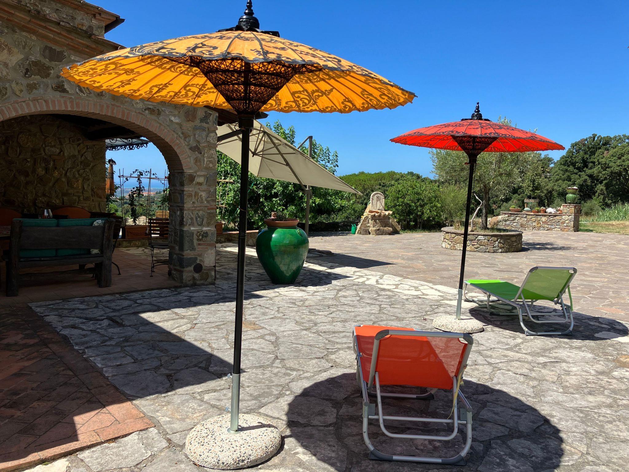 The shaded veranda invites you to take your meals outside and to rest on two confortable arm-chairs to enjoy the sea view and the islands of Elba and Corsica. Other shaded places with lounge-chairs around the house are available for your relaxing.