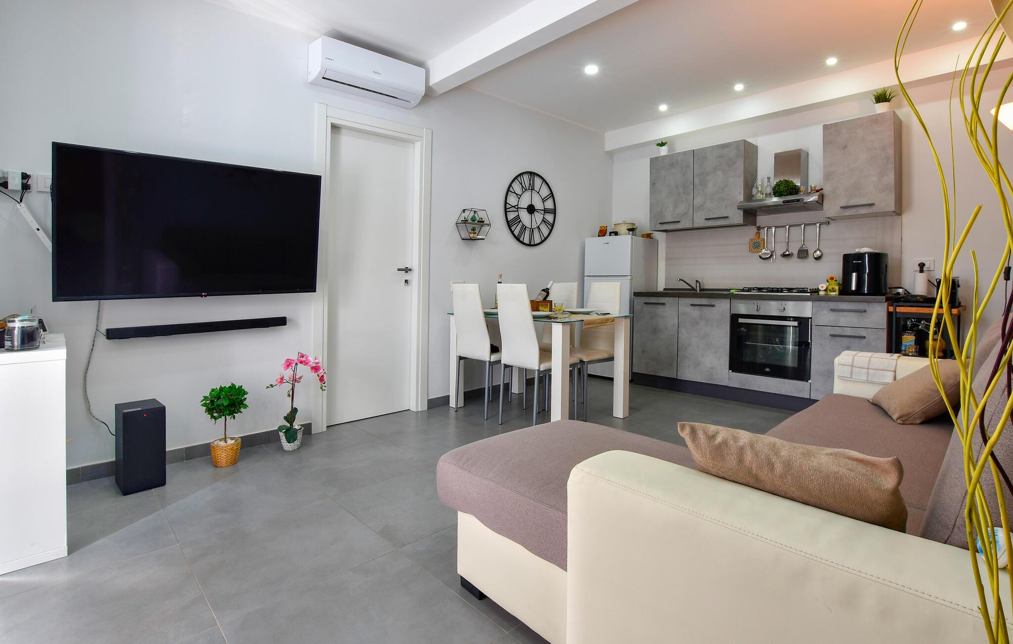 Dette moderne dobbelthus byder jer velkommen i en ideel beliggenhed, hvor I spontant kan vælge mellem stranddage, shoppingture eller kulturelle udflugter. Glæd jer til fælles madlavning i det åbne køkken og nyd harmoniske måltider ved det indbydende spisebord. Efter en oplevelsesrig dag lokker den komfortable sofa – slap af med en god bog eller brug aftenen på et hyggeligt spil med familien.
