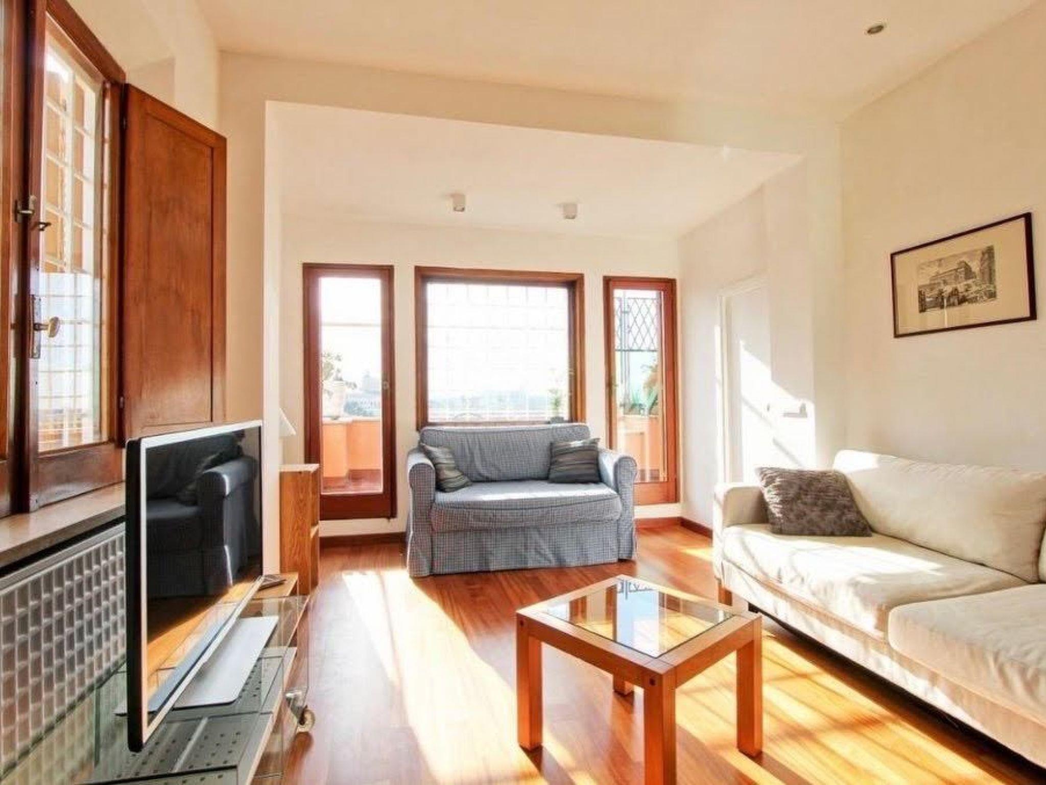 The spacious living room with two comfy double sofas bed, TV, air conditioning both cooling and heating. From the living room you can access the large Rome & Juliet-style balcony.