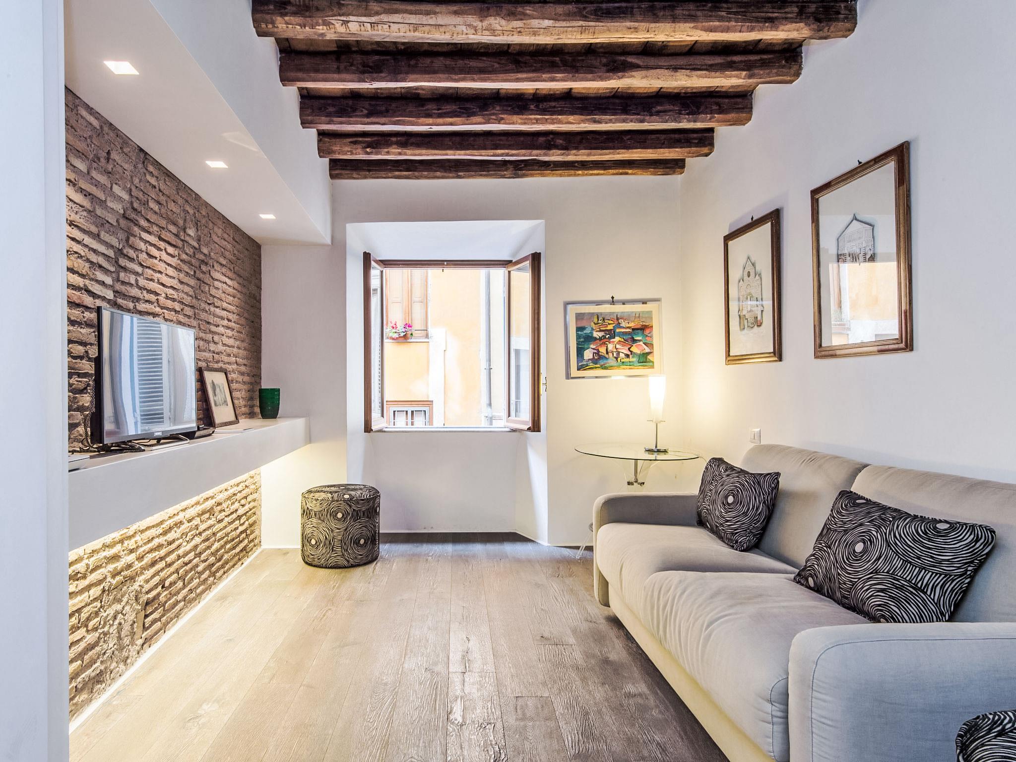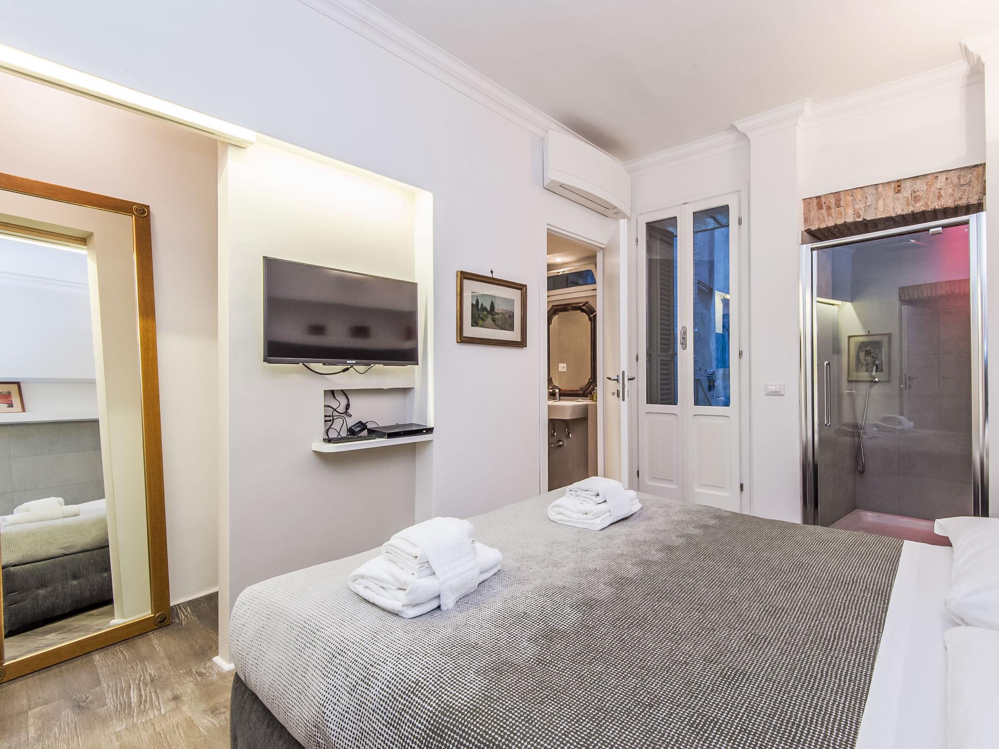 "Forum Augusti", 2-room apartment 75 m2 on 1st floor. Bright, very comfortable and tasteful furnishings: living/dining room with 1 double sofabed and satellite TV. 1 double bedroom with shower/WC. Large kitchen (4 hot plates, electric coffee machine) with dining table. Shower/WC. Heating, air-conditioning. Heating available only from 01.11. to 15.04. View of the city. Facilities: washing machine, iron, hair dryer. Internet (WiFi, free). IT058091C294E3QKHB