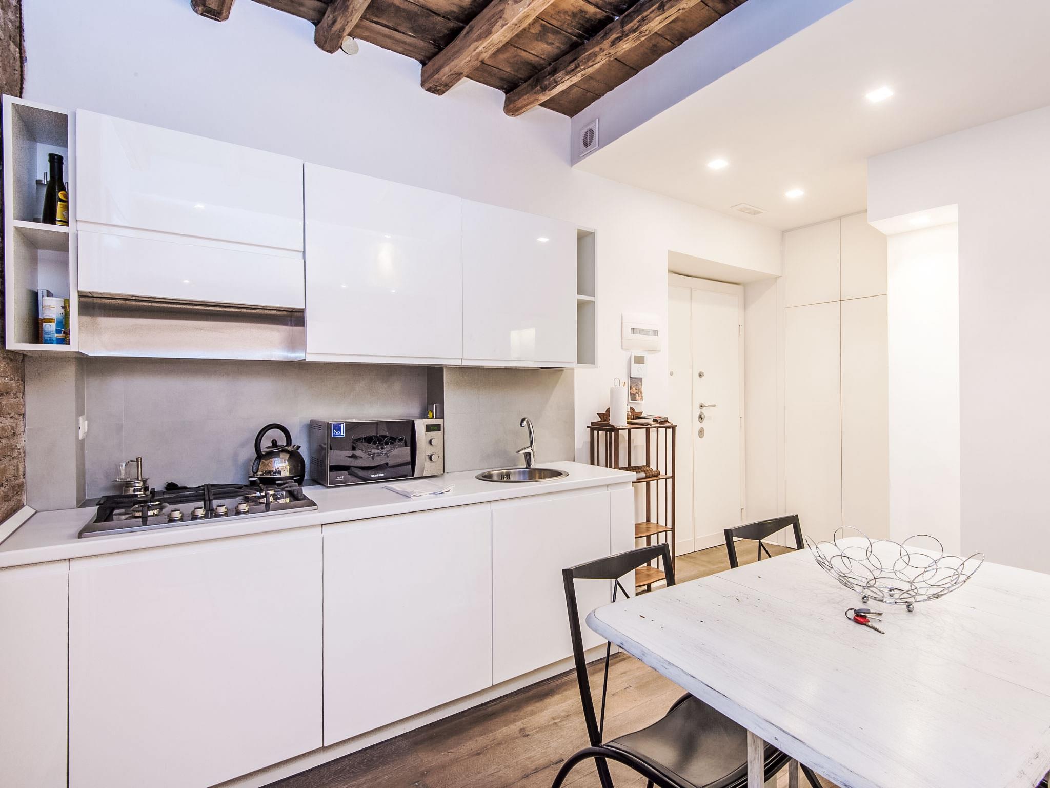 Very historical residence, 4 storeys. In the centre of Rome, in the district Monti, in the heart of the city. In the house: lift. Grocery 50 m, restaurant 10 m, bar 50 m, bus stop "Cavour - Ricci" 180 m, railway station "Termini" 1.5 km, underground station "Cavour (MB)" 450 m. Nearby attractions: Colosseo, Fori Imperiali 450 m, Altare della Patria 500 m, Pantheon, Piazza Navona, Campo dei Fiori 1.7 km. Check-in after 10 pm additional 30 Euro, after midnight additional 50 Euro, to be paid on arrival.