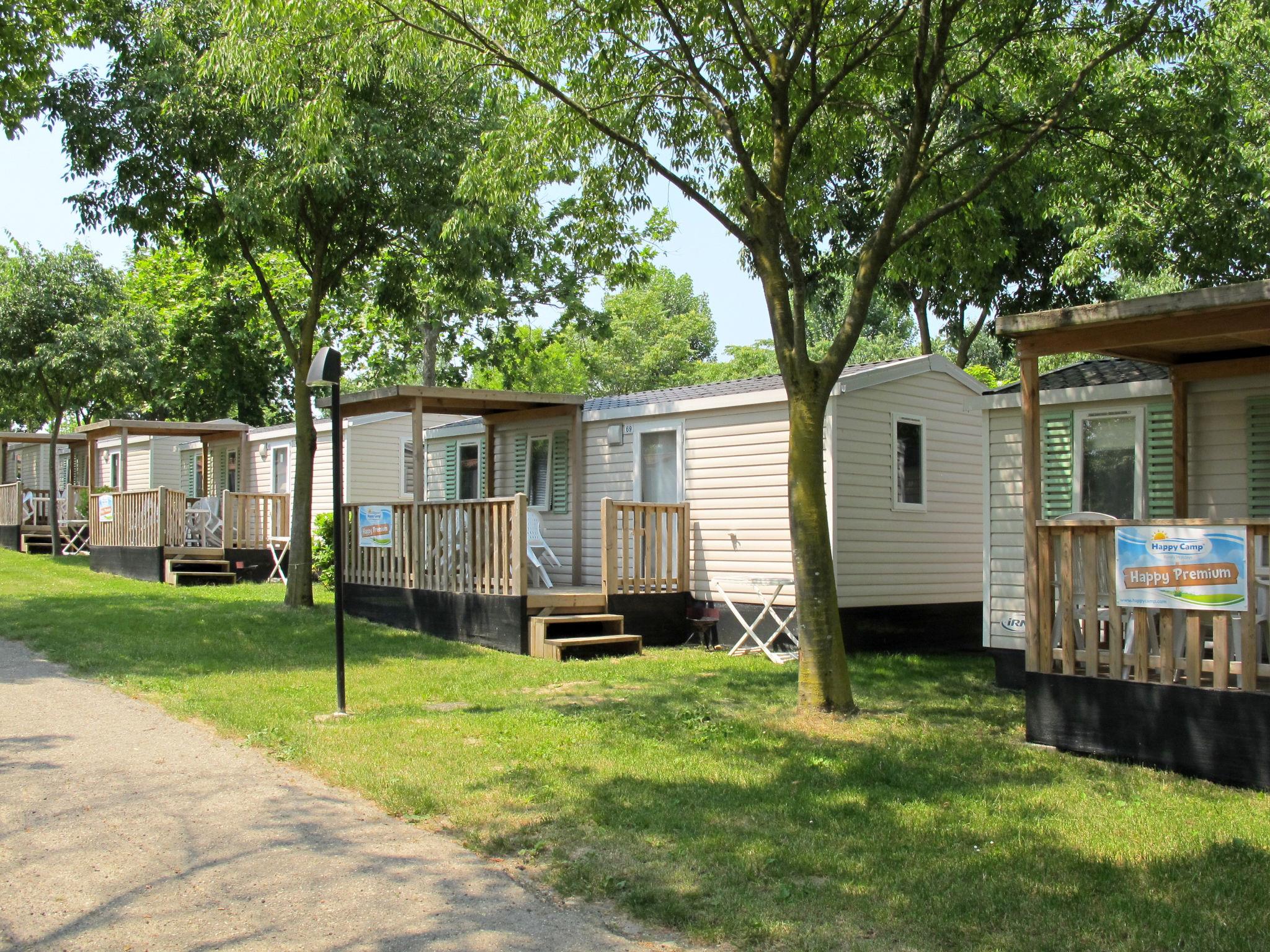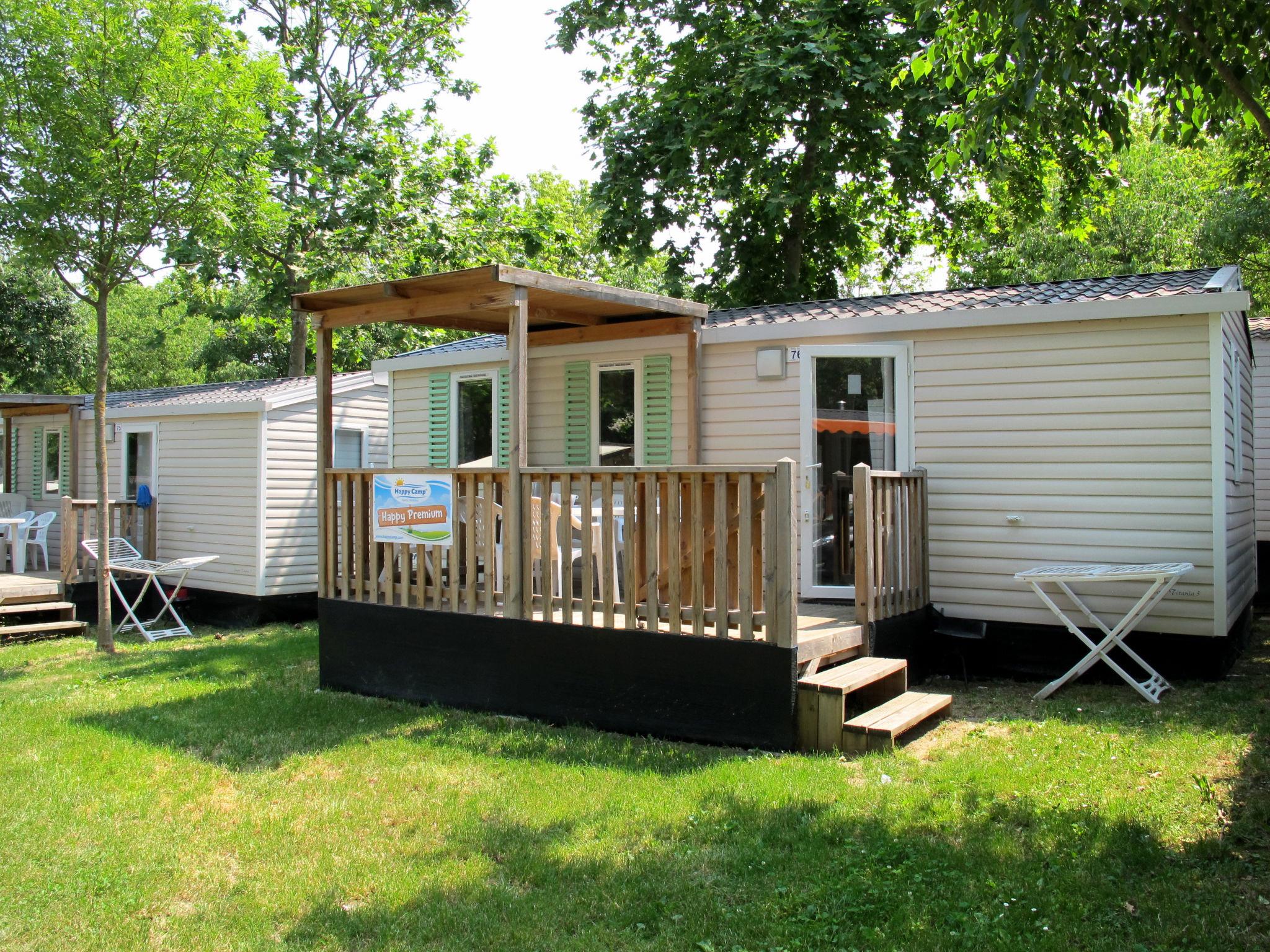 "Happy Premium", 4-room mobile home 30 m2. Comfortable furnishings: living/sleeping room with dining table, electric heating and air conditioning. 1 room with 1 french bed (140 cm, length 190 cm). 2 rooms, each room with 2 beds (70 cm, length 190 cm). Open kitchen (4 hot plates, microwave, freezer, electric coffee machine). Shower/WC. Air-conditioning (extra). Terrace partly roofed. Terrace furniture, electric barbecue (portable), deck chairs (2). Facilities: mosquito net. Parking (1 car). Please note: non-smokers only. Maximum 1 small pet/ dog allowed. IT029040B14KOQCKTE