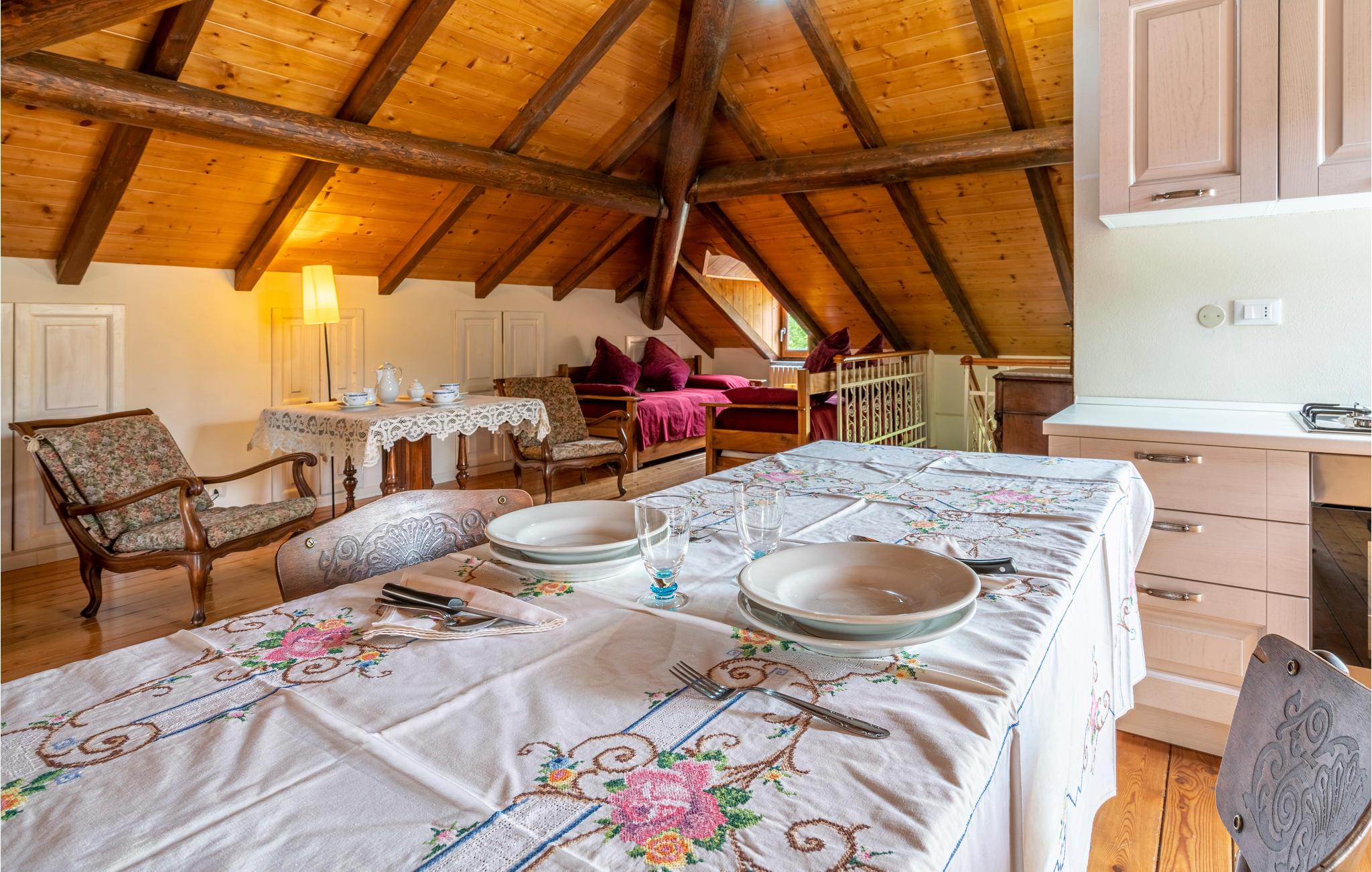 Her finder I en ferielejlighed på tredje sal i en imponerende bygning. I stuen bliver I mødt af smukke træpaneler og bjælkekonstruktioner, samt rustik indretning, som skaber en helt unik stemning. Føl jer godt tilpas her og nyd jeres morgenmad på den overdækkede terrasse mens I beundrer panoramaudsigten og planlægger dagens aktiviteter.