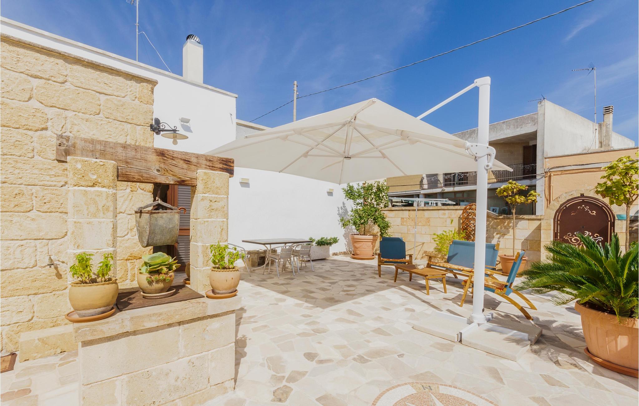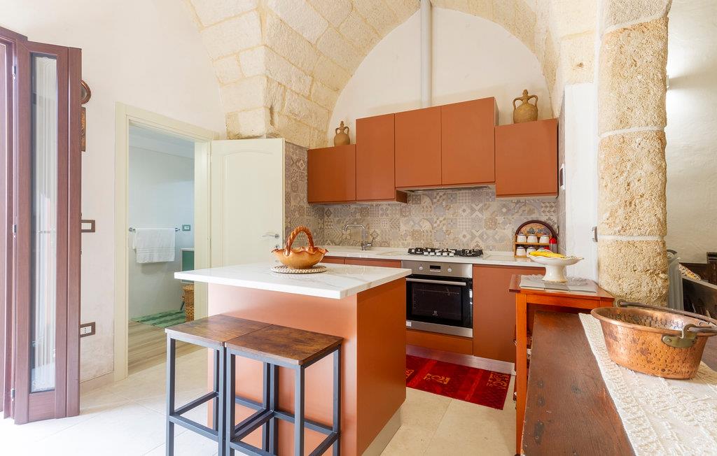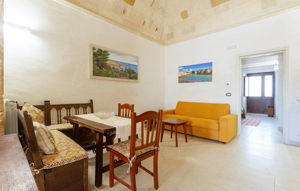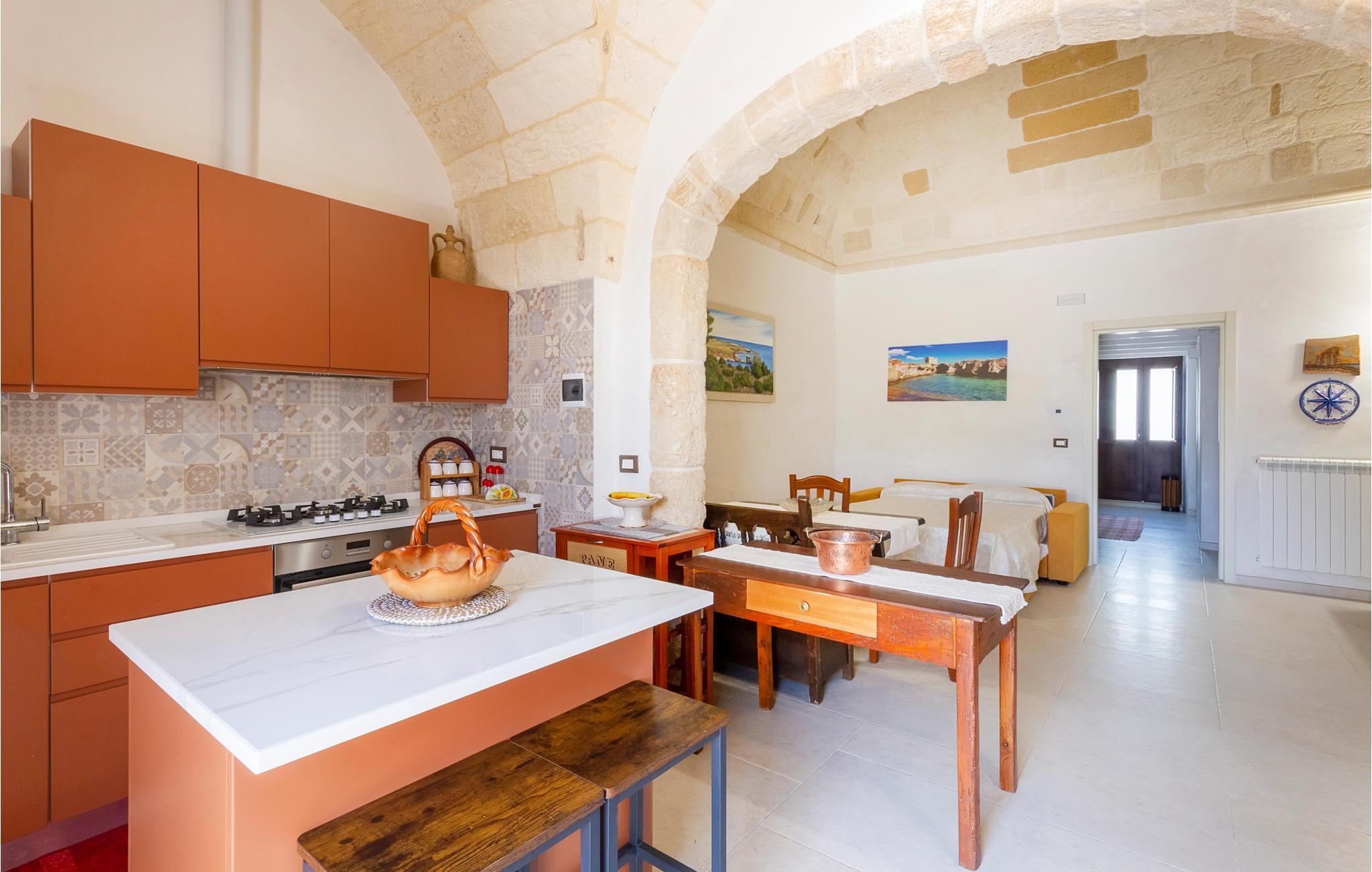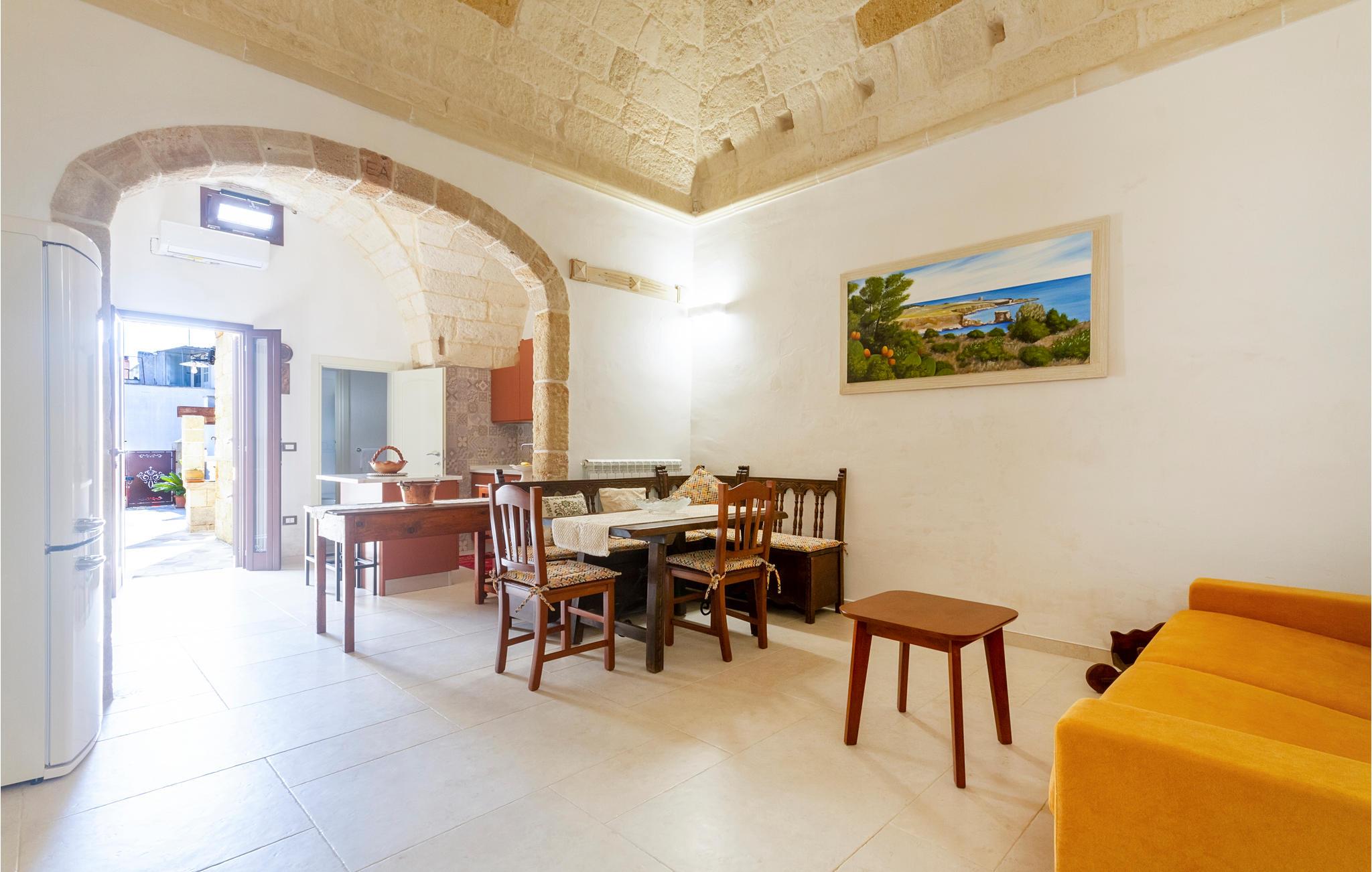 Dette særlige feriehus byder dig velkommen kun få kilometer fra havet. Glæd dig til en fantastisk ferie med din familie eller din elskede i dette smukke stenhus med hvælvede lofter og et åbent boligkoncept. Nyd den åbne kommunikation mellem køkken, spisestue og opholdsstue, som flyder ind i hinanden. En indhegnet gårdhave med palmer, træer og klinkegulve inviterer dig til at slappe af udendørs og nyde solen. I bil kan du hurtigt nå strandene og kysten ved Santa Cesarea Terme. Nyd mange timer på stranden og i havet og nyd det krystalklare hav. Du kan også besøge grottesystemet Grotta Zinzulusa og opdage de farverige klippeformationer og det mangfoldige havliv, mens du snorkler. Oplev en uforglemmelig ferie i Puglia!