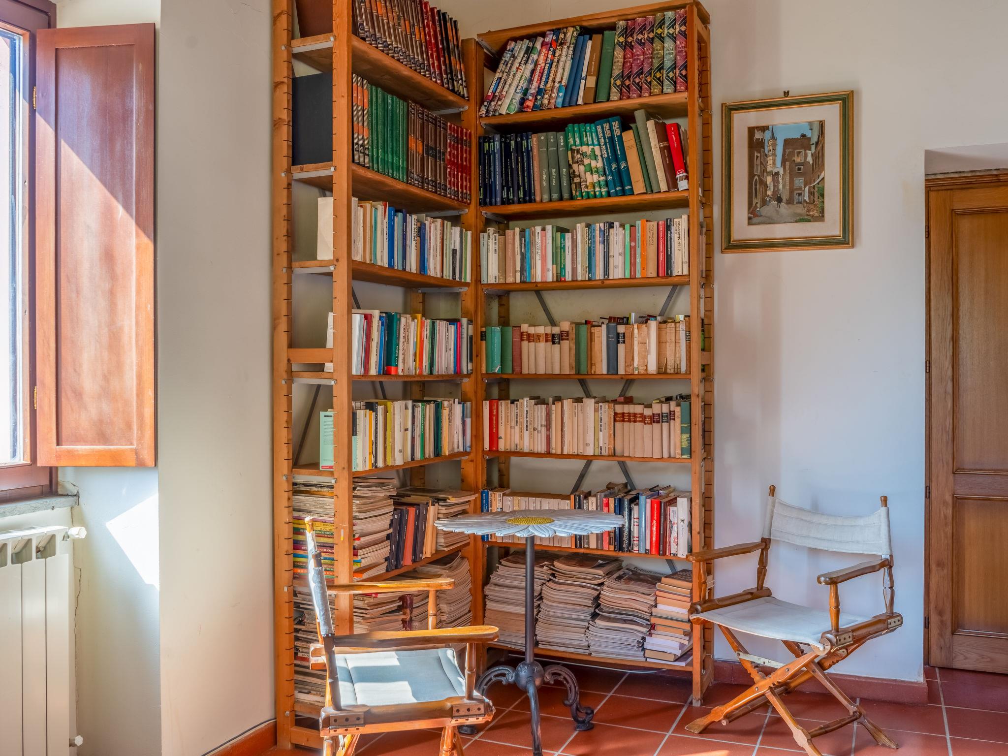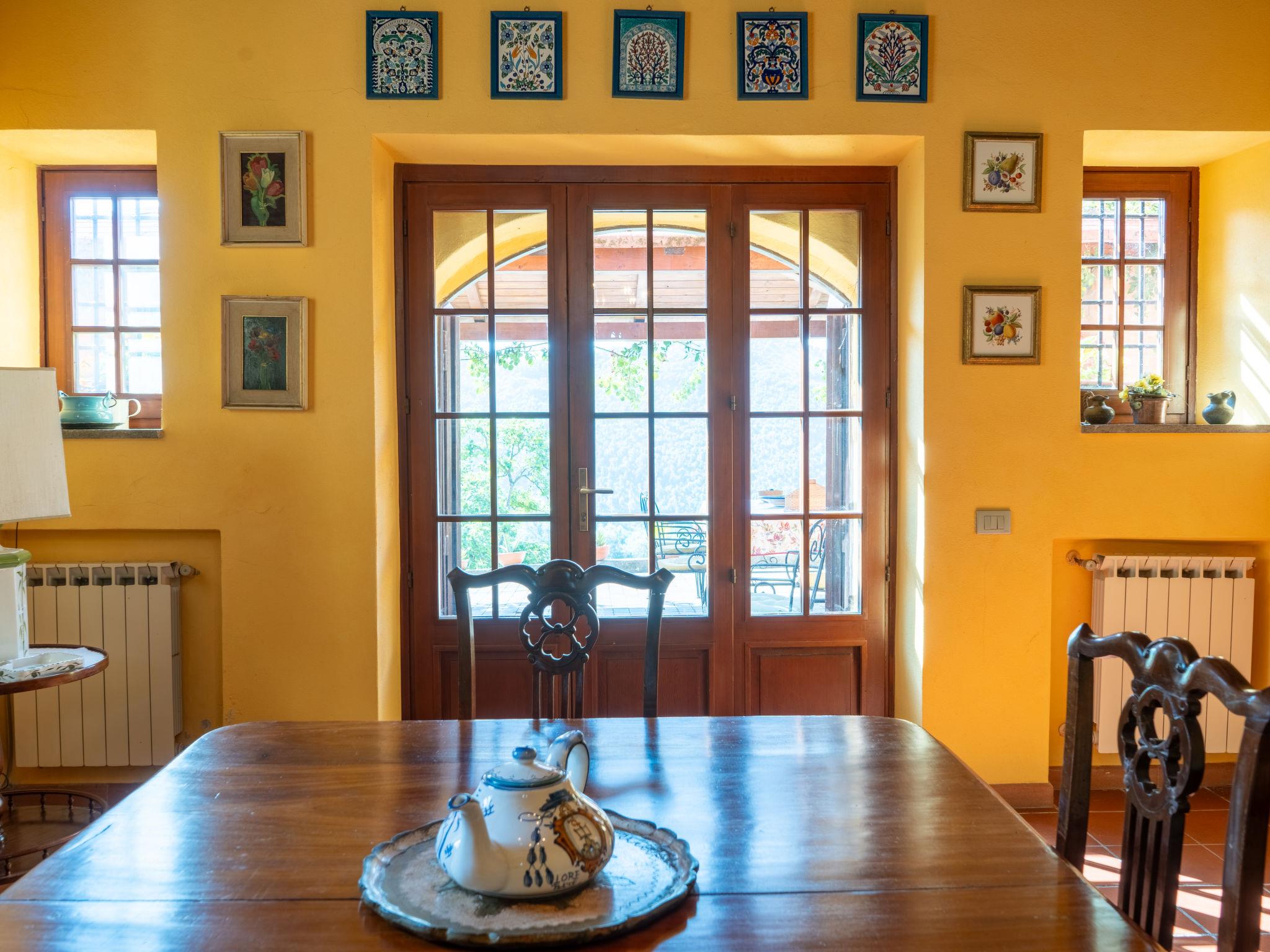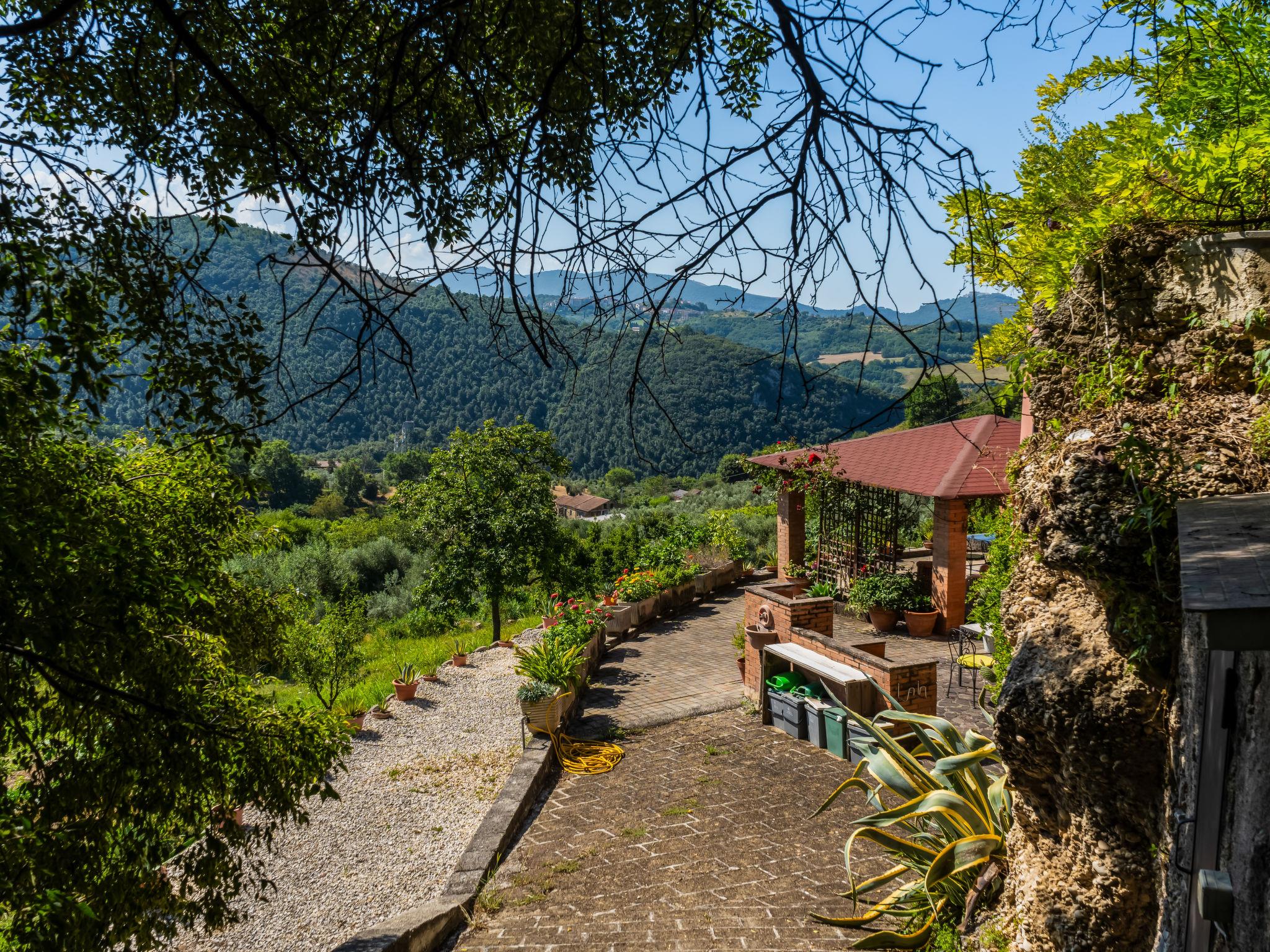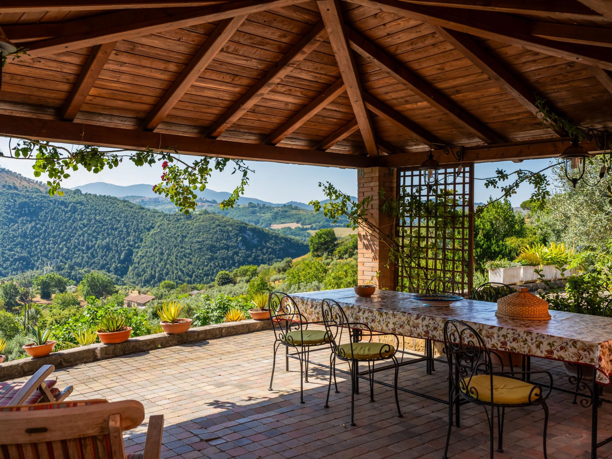 "Farfa", 6-room villa 250 m2 on 2 levels. Open dining room. Exit to the garden, pergola. Open living room with open-hearth fireplace, TV and flat screen. Exit to the garden, to the loggia. Kitchen (4 hot plates, oven, dishwasher, microwave, freezer, electric coffee machine) with dining table. Upper floor: 1 double bedroom with shower/bidet/WC. 2 rooms, each room with 1 x 2 bunk beds. 1 double bedroom. 2 showers/bidet/WC. Heating, gas heating (extra). Panoramic view of the valley. Facilities: washing machine, iron, mosquito net. Internet (WiFi). Please note: non-smokers only. IT057063C23T42I23A