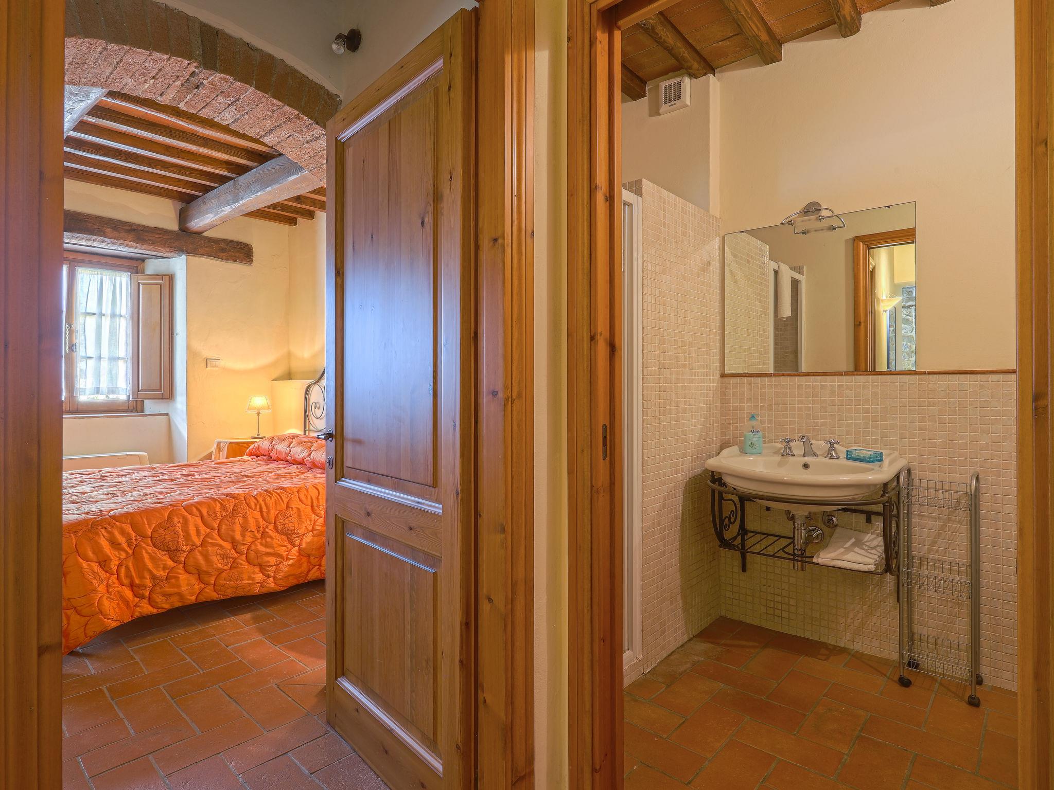 "Michelangelo", 2-room apartment 50 m2, on the ground floor. Object suitable for 2 adults. Fully renovated in 2005, rustic and cosy furnishings: living/dining room with dining table and satellite TV. 1 double bedroom. Open kitchen (4 hot plates, oven, microwave, electric coffee machine). Shower/bidet/WC. Gas heating, air-conditioning. Natural stone floors. Patio. Terrace furniture, barbecue, deck chairs. Very beautiful panoramic view of the countryside and Chianti. Facilities: safe, children's high chair, baby cot for up to 2 year olds. Internet (WiFi, free). Parking (roofed, 1 car). Please note: suitable for families. Non-smokers only. Maximum 1 pet/ dog allowed. Private entrance. No mandatory extra charges to be paid on-site except for local tax. Bedlinen, towels, final cleaning and all energy costs are included. IT048054B5EBVWGG6K