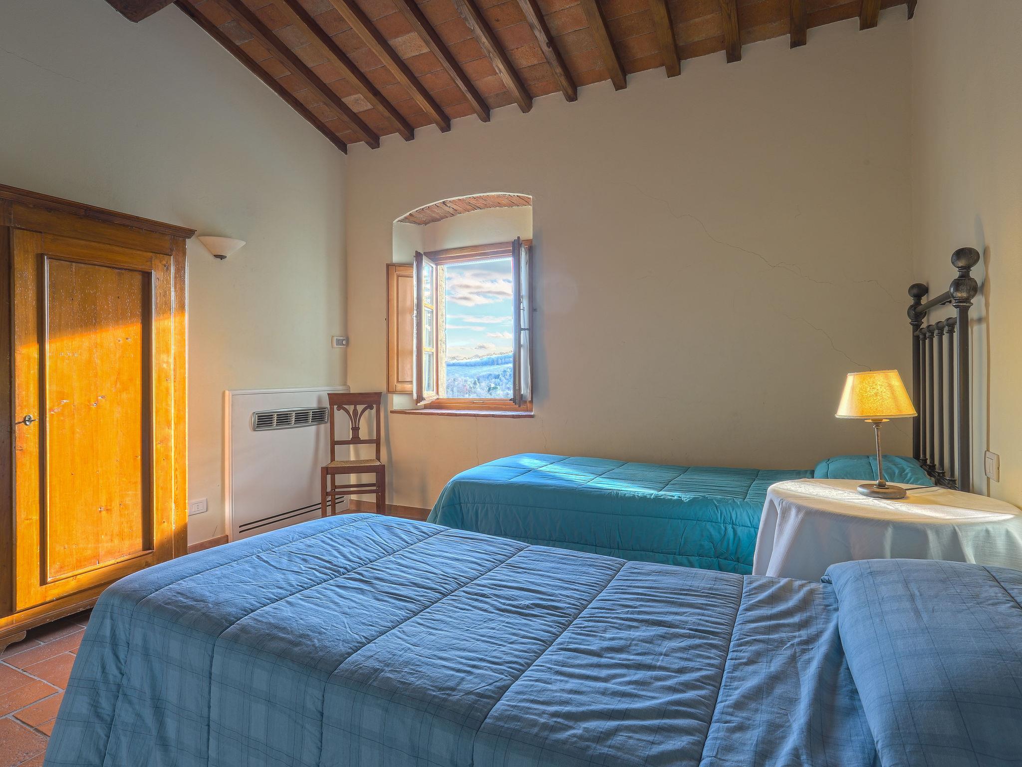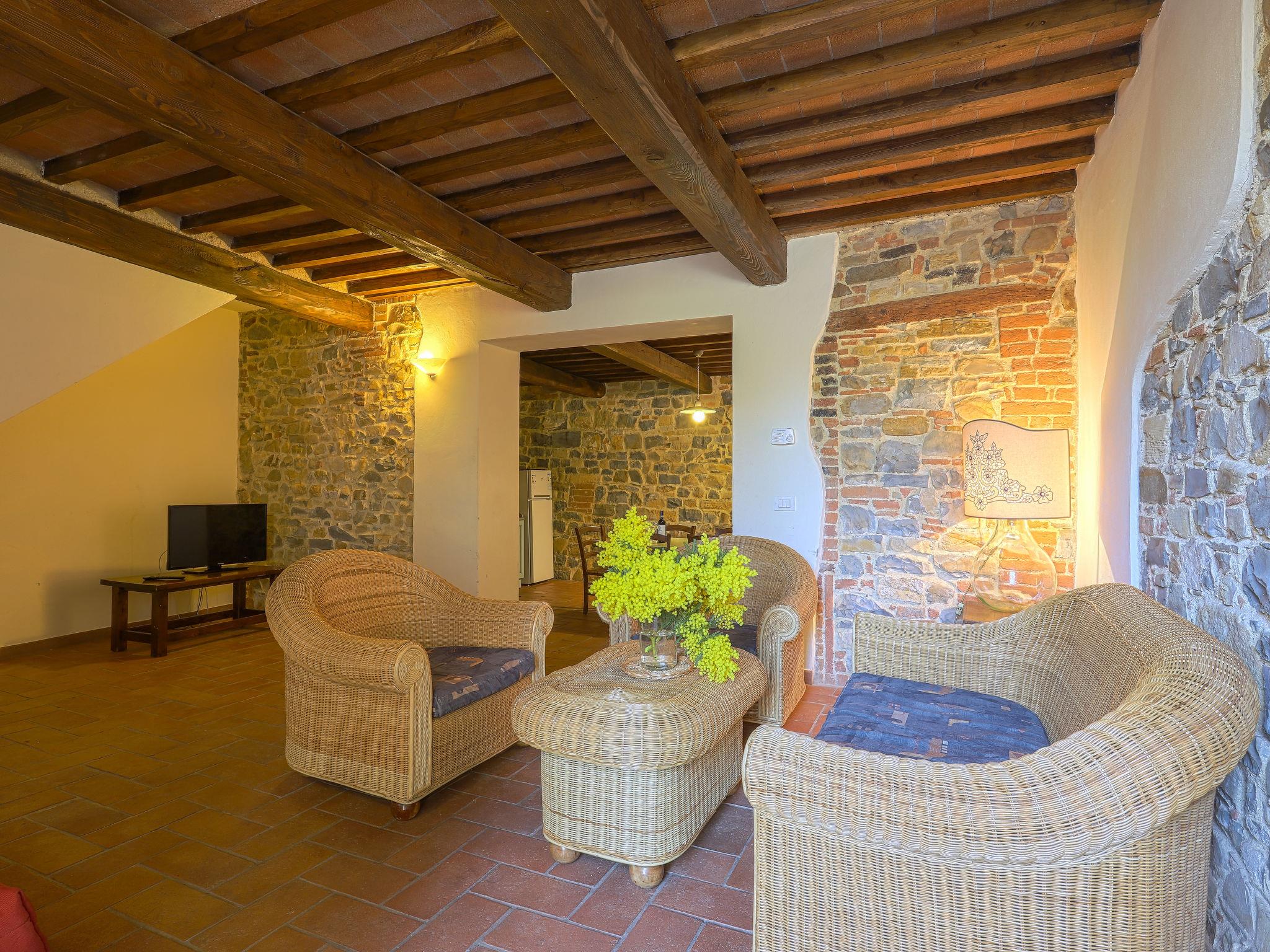 "Boccaccio", 3-room apartment 90 m2, on the ground floor. Object suitable for 4 adults. Spacious, fully renovated in 2005, rustic and cosy furnishings: living room with satellite TV (flat screen). 1 double bedroom. 1 room with 2 beds (80 cm). Kitchen-/living room (4 hot plates, oven, dishwasher, microwave, electric coffee machine) with dining table. Shower/bidet/WC. Heating, air-conditioning. Natural stone floors. Patio. Terrace furniture, barbecue. Very beautiful panoramic view of the countryside and Chianti. Facilities: safe, children's high chair, baby cot for up to 2 year olds, hair dryer. Internet (WiFi, free). Parking (roofed, 2 cars). Please note: suitable for families. Non-smokers only. Maximum 1 pet/ dog allowed. Private entrance. No mandatory extra charges to be paid on-site except for local tax. Bedlinen, towels, final cleaning and all energy costs are included. IT048054B5EBVWGG6K