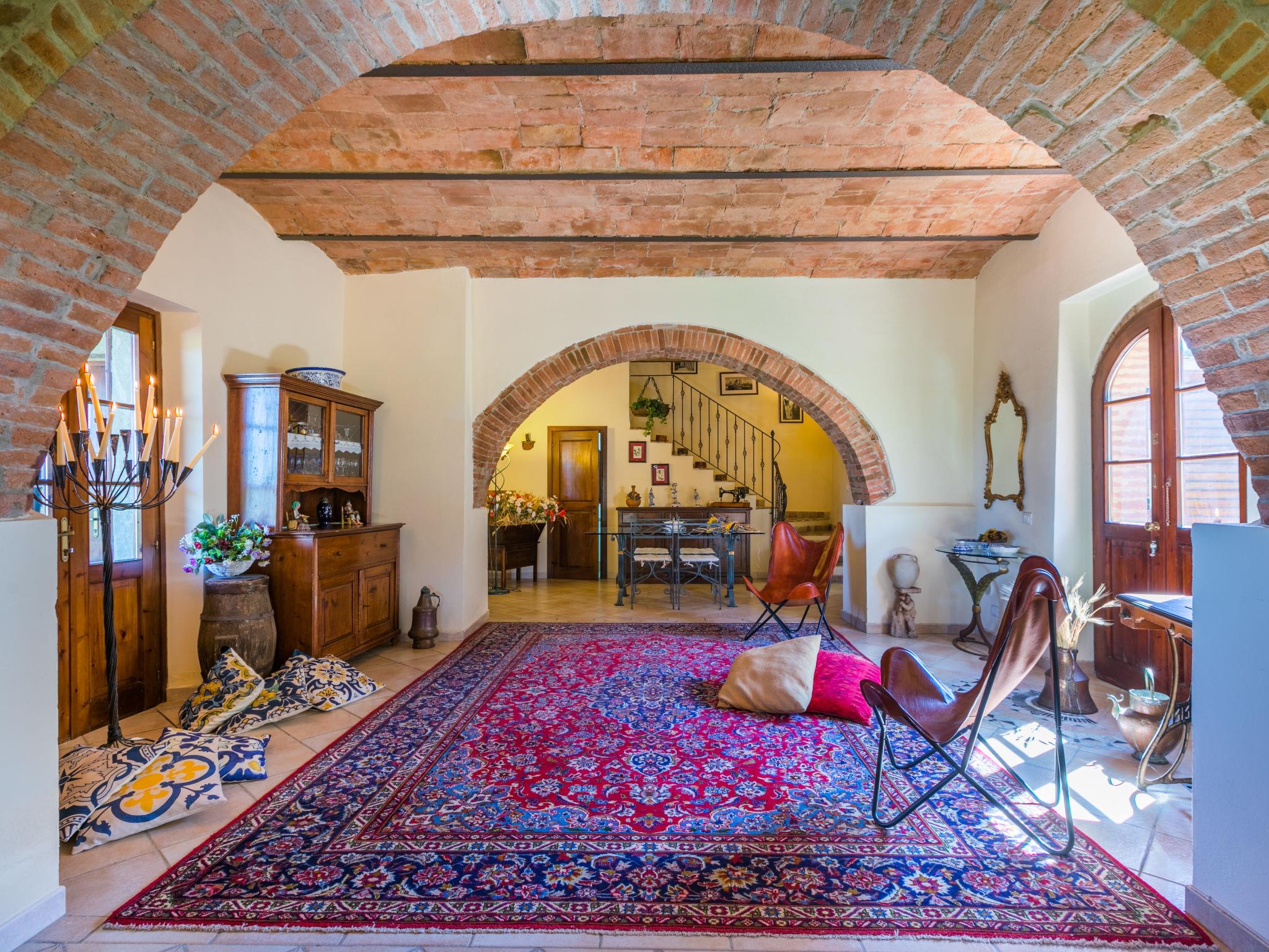 "Podere San Lorenzo", 5-room cottage 190 m2 on 2 levels. Object suitable for 8 adults. Spacious, beautiful and tasteful furnishings: large living/dining room with dining table, satellite TV, hi-fi system, DVD and wood-burning stove. Exit to the terrace. Large kitchen (oven, dishwasher, 5 gas rings, toaster, kettle, microwave, freezer, electric coffee machine) with dining table, wood-burning stove. Exit to the terrace. Shower, shower/bidet/WC. Upper floor: 1 double bedroom. 1 double bedroom with panoramic window with open-hearth fireplace (only for decoration). 1 room with 3 beds (80 cm). 1 room with 1 bed (80 cm). 2 showers/bidet/WC. Gas heating (extra). Natural stone floors. Comfortable furnishings in the country house style. Large terrace roofed. Terrace furniture, barbecue, deck chairs, box-room. Marvellous panoramic view of the countryside and San Gimignano. Facilities: washing machine, children's high chair, baby cot for up to 2 year olds, hair dryer. Internet (WiFi, free). Parking (3 cars). Please note: suitable for families. Non-smokers only. No mandatory extra charges to be paid on-site except for local tax. Bedlinen, towels, final cleaning and all energy costs are included. IT052028C2UN65OXFR