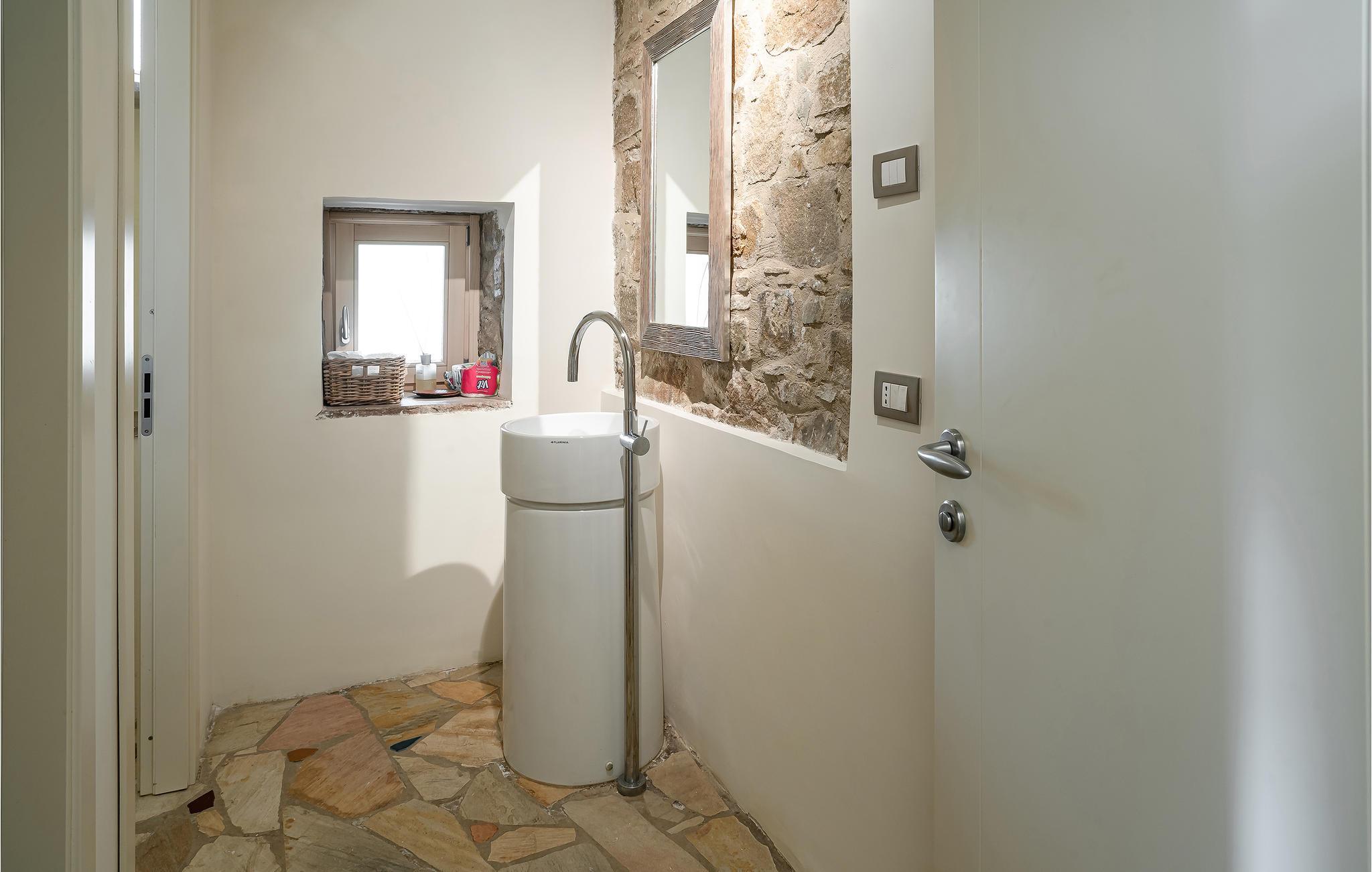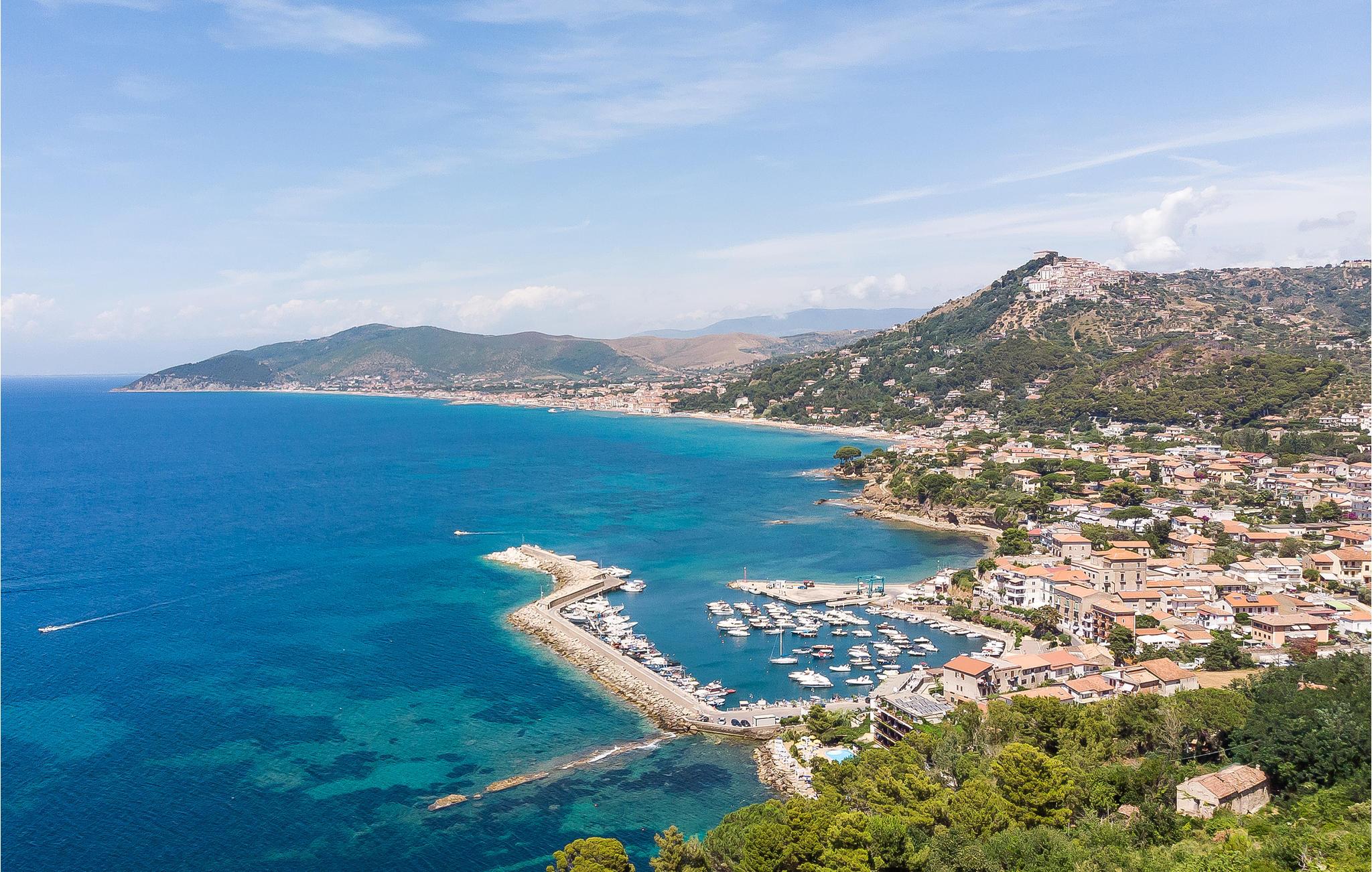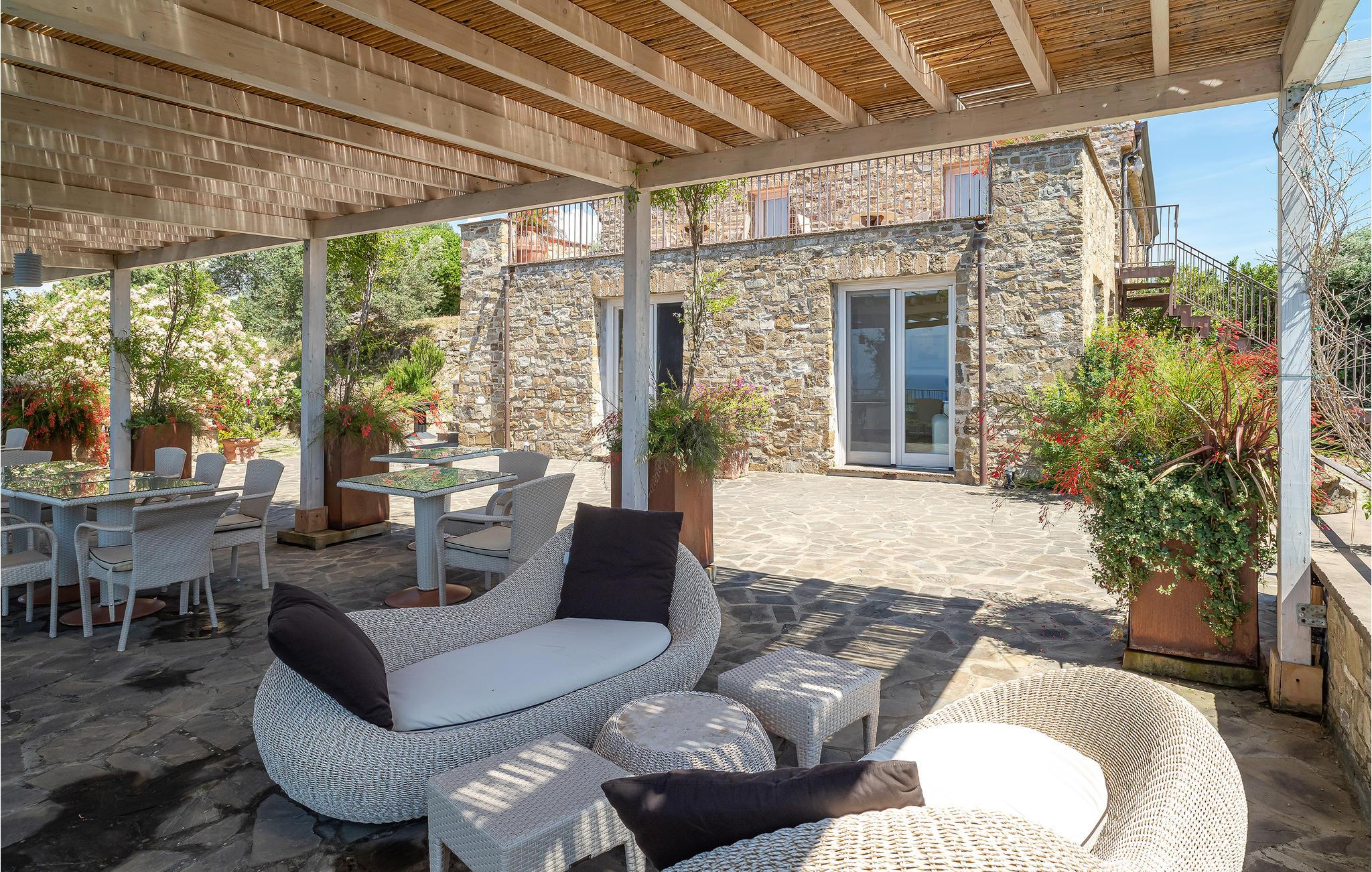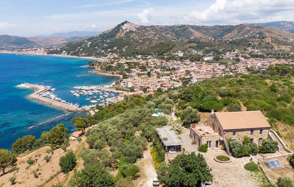 Med høj beliggenhed og spektakulær udsigt ud over det grønblå Cilentohav, ligger dette skønne feriehus, bygget af typiske rå sten fra regionen. Fra husets bakke er der også udsigt ud over den smukke lille landsby San Marco di Castellabate (ca. 800 m væk, i gåafstand). Huset var oprindeligt et bondehus, men nu omhyggeligt renoveret, med de samme materialer som det oprindelige, som frilagte loftsbjælker og flisegulve. Huset rummer et køkken der er åbent modstuen og syv soveværelser, alle med indgang udefra, og uden intern forbindelse. De kan alle lejes samlet, helt ideelt til en gruppe eller en stor familie. I en sidebygning, nedenfor villaen og fuldstændigt uafhængig af den centrale bygning, er der en lille lejlighed, hvor nøgleudlevereren opholder sig. Han tager sig af den daglige pleje af huset, pools og haven. I hovedbygningen er der syv soveværelser, det ene med hems med to senge og det andet med en sovesofa til to personer. De store åbne områder med herlig panoramaudsigt indbyder til at nyde dagens måltider i det fri. Perfekt beliggenhed, når I vil opleve Cilentos spændende byer: Castellabate med sin karakteristiske historiske bykerne (4 km), Acciaroli (12 km) og Paestum (30 km). Dagsudflugter kunne være til Amalfikysten 100 km væk, eller Pompeji 110 km og til Neapel der ligger 150 km væk.