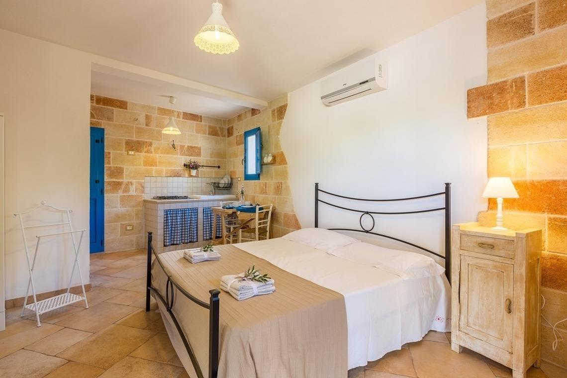 Der Trullo besteht aus einem Esszimmer, einer Küchenzeile mit Herd und Ofen, einem Badezimmer mit Dusche und einem Schlafzimmer mit drei Steinnischen, in denen sich Schlafgelegenheiten befinden, von denen eine ein Doppelbett und zwei Einzelbetten sind.