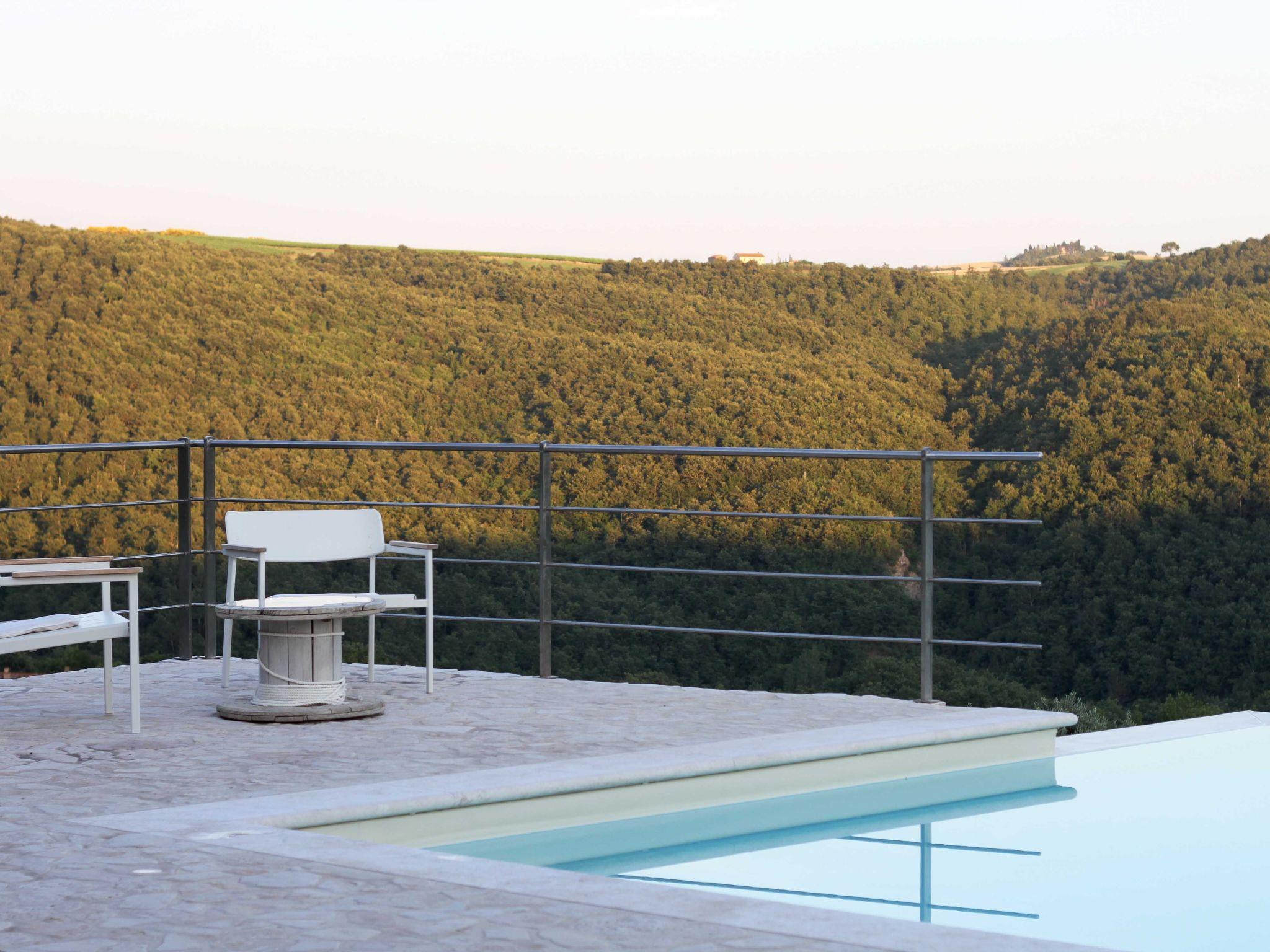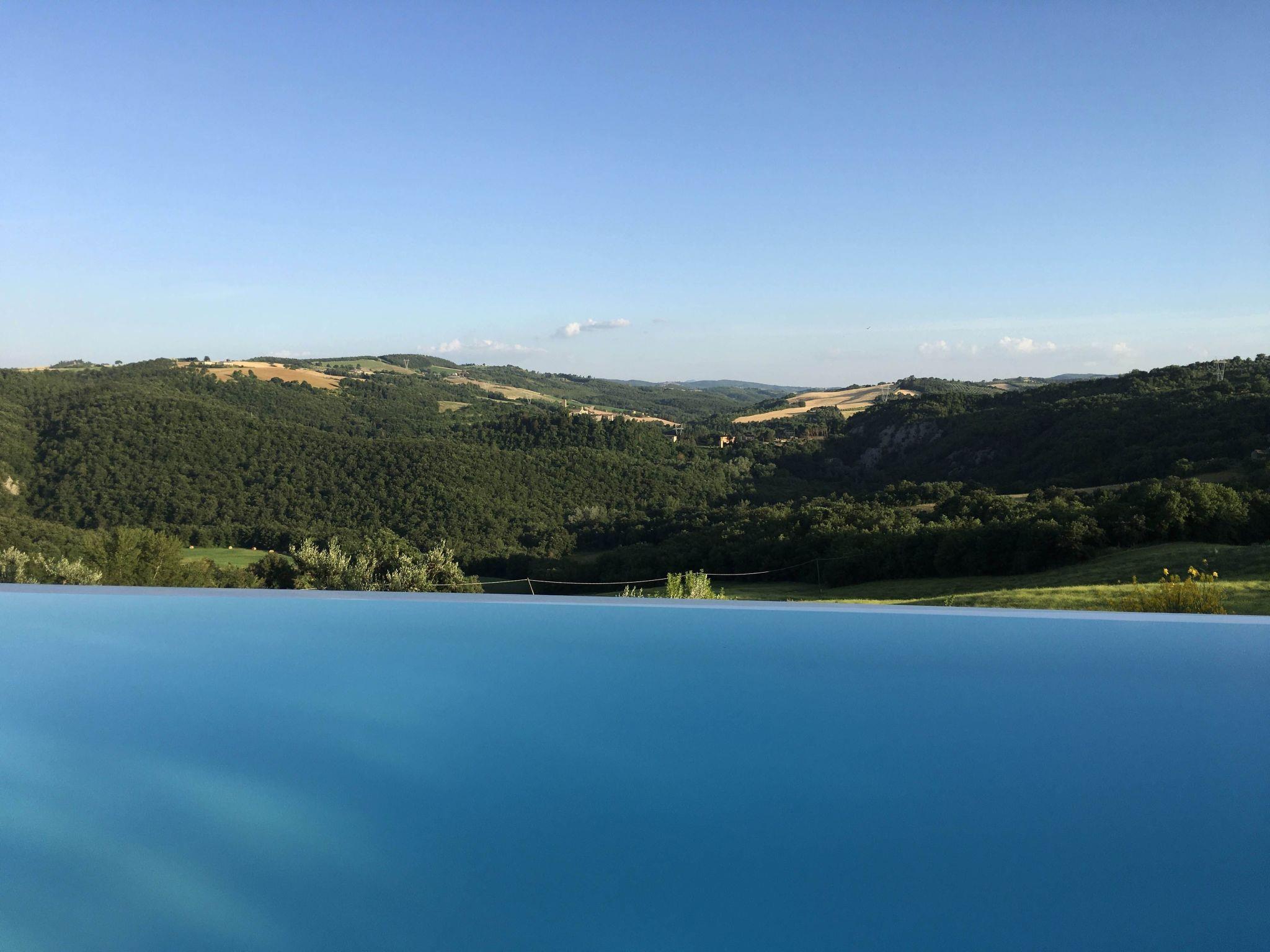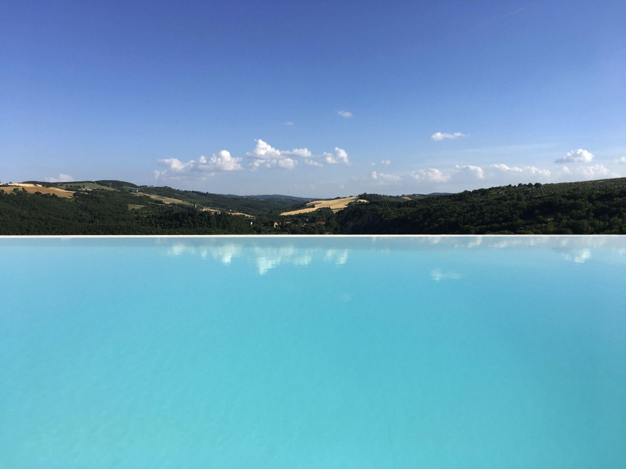 The external charm of the villa is no less impressive. Guests can relax by the beautiful infinity pool, ideal for enjoying the warm Umbrian summer days. L'esterno, attentamente progettato per rispecchiare la bellezza naturale dell'Umbria, offers the perfect space to relax and enjoy the tranquillity that only the Umbrian countryside can offer.