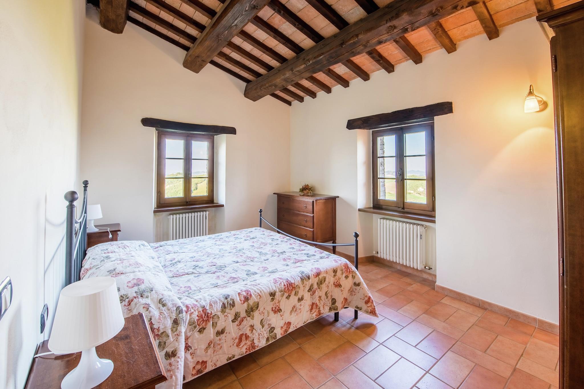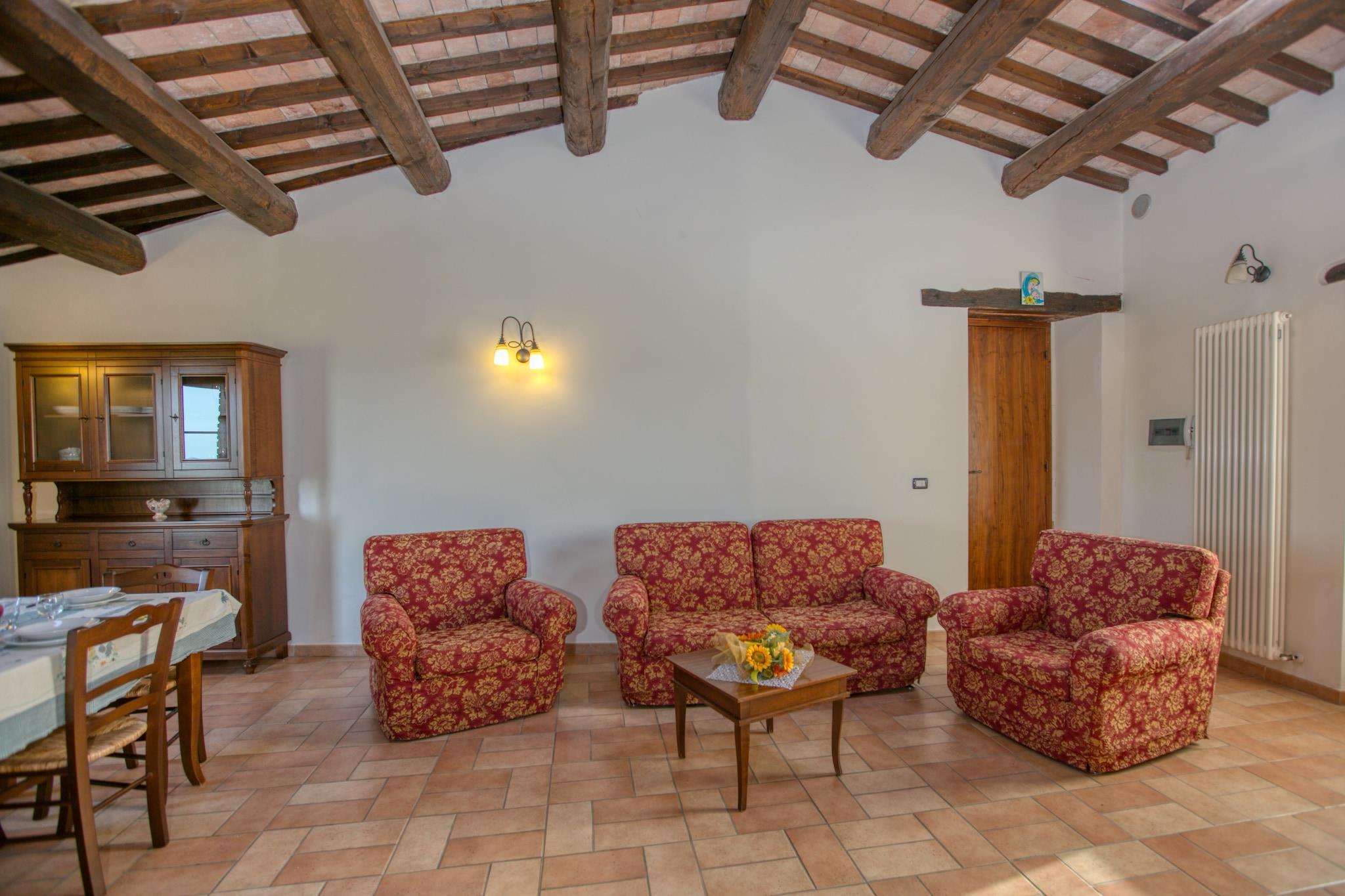 Rustik charme i naturens omfavnelse Beliggende på toppen af en bakke med panoramaudsigt over Metauro-dalen, blander denne restaurerede bondegårdslejlighed landlig charme med moderne komfort. Originale terracottagulve, synlige bjælker og hyggeligt interiør giver en autentisk landskabsfølelse. Den private terrasse er perfekt til udendørs måltider, mens den fælles have, grillplads og lille pool med hydromassage inviterer til øjeblikke af afslapning. Med legeområder, en fodbold-/volleyballbane og kæledyrsvenlig adgang er den ideel for både familier, par og lodne ledsagere. Udforsk hjertet af Marche Ejendommen er omgivet af uspolerede landskaber fra Appenninerne og er en port til eventyr. Nyd naturskønne vandreture, mountainbiking og endda ridning lige fra dit dørtrin. En kort køretur bringer dig til Urbino, en UNESCO-listet perle rig på renæssancekunst og arkitektur. Nærliggende Sant'Angelo i Vado og Mercatello sul Metauro byder på charmerende piazzaer, håndværkermarkeder og en ægte smag af den lille by Italien. Til familiesjov er Italiens bedste forlystelsesparker kun en time væk. Smag af regionen Madelskere vil finde masser at nyde her. Nyd lokale vinsmagninger, trøffeljagter med ekspertguider og hunde, eller et besøg på nærliggende agriturismi, der serverer hjemmelavede specialiteter. I byen kan du nyde espresso på historiske pladser eller prøve rustikke retter på Ristorante Pizzeria Taverna Del Gufo i Sant'Angelo. Med friske råvarer, håndværksmæssige oste og fine vine i nærheden bliver hvert måltid en fejring af Marches rige kulinariske tradition.