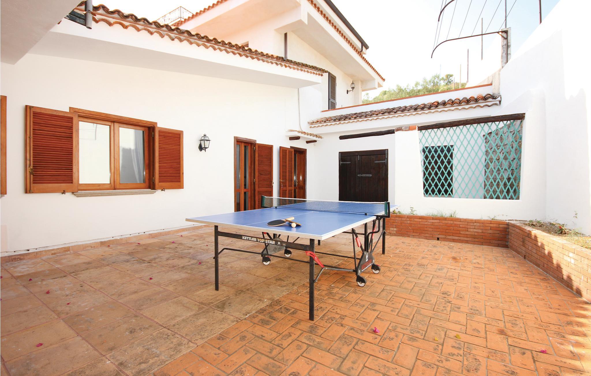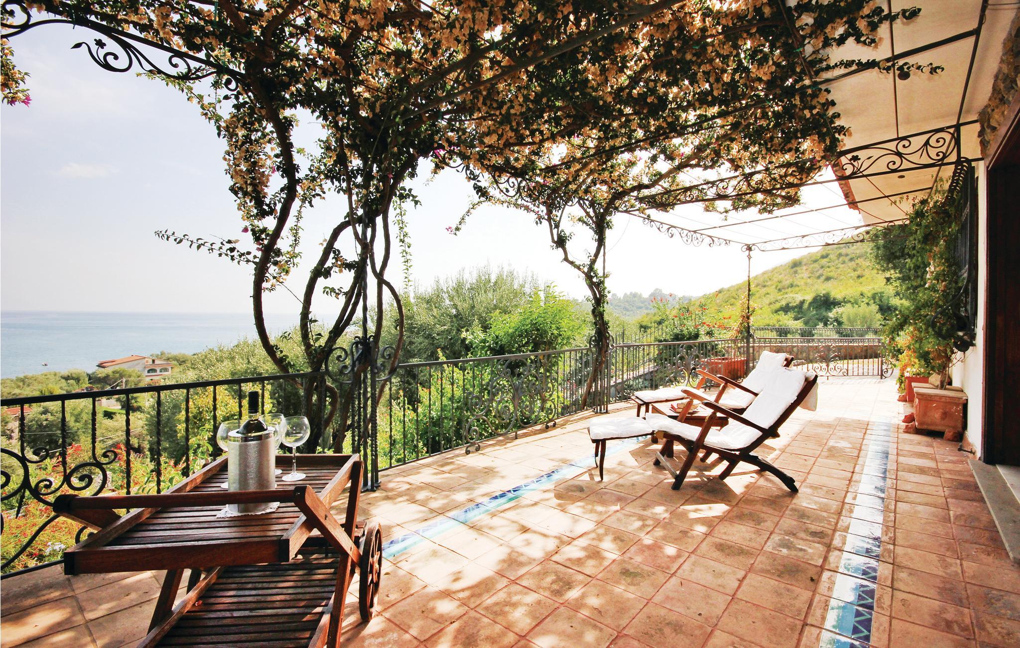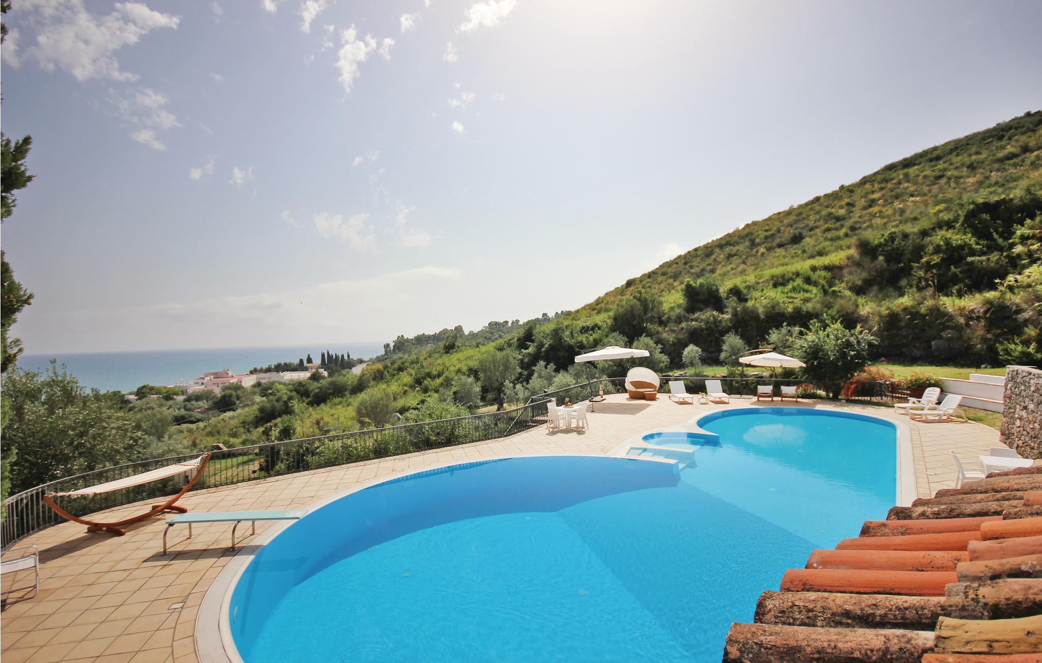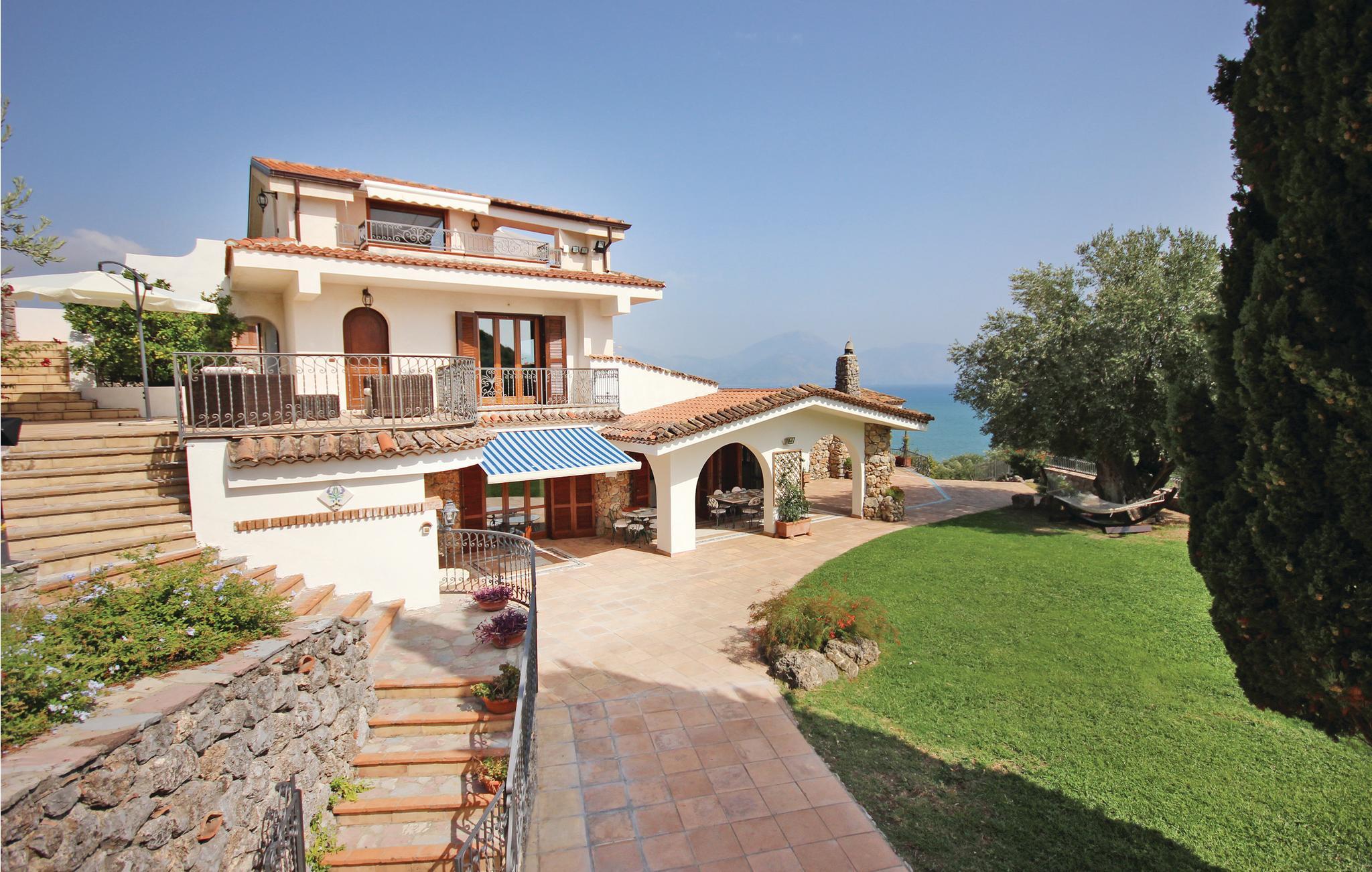 En vidunderlig villa med udsigt til golfen af Policastro i nationalparken Cilento, 2 km fra fiskerlandsbyen Scario. Feriehuset er fordelt over tre etager, der kun er forbundet med ydertrapper. Det byder jer på en stor pool med afrundede linjer, havudsigt og belysning i aftentimerne. Haven og de tilstødende udendørsområder er terrasseformet anlagt og rige på oliventræer og mediterrane planter. Bygningen er præget af materialer af høj kvalitet og fint håndværk. Hovedindgangen ligger i stueetagen, hvor også den store dagligstue, et køkken, fire soveværelser og endnu et værelse venter på jer. Fra forældresoveværelset råder I over eget, stort badeværelse med massagekar, og I kan træde ud på terrassen med udsigt til havet. Rundt om huset er der flere udstyrede områder, en veranda og generøse terrasser. I østsiden er der vaskerum og bordtennis. På første sal er der stue med køkkenhjørne, soveværelse og badeværelse med mosaikgulv og massagekar. Udenfor er der to terrasser med herlig havudsigt. På anden sal er der et soveværelse, badeværelse og køkkenhjørne. Soveværelse 3 har en enkeltseng og en åben hems (adgang via vindeltrappe) med to enkeltsenge. På den ene side af hemsen findes en vandret åbning (uden glas), som har udsigt over soveværelse 2, der ligger i stueetagen. Fra huset kommer I nemt til sandstranden, der kun ligger få hundrede meter herfra, hvor der er snackbar og pizzeria. I Scario kan I finde alle slags services som supermarked, restauranter, bar og postkontor. Fra havnen i landsbyen kommer I ad havvejen til mange flotte bugter langs kysten mod nord helt til Marina di Camerota. God beliggenhed til besøg i nationalparken Cilento og andre steder af arkæologisk og kulturel interesse: Karteuserklosteret i Padula i Vallo di Dano ligger 47 km herfra, der er 80 km til de pragtfulde arkæologiske templer i Paestum, 45 km til udgravningerne i Velia ved Cilento-kysten og 30 km til Maratea og den berømte kristusstatue.