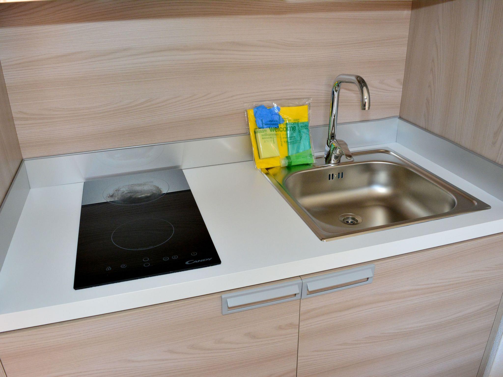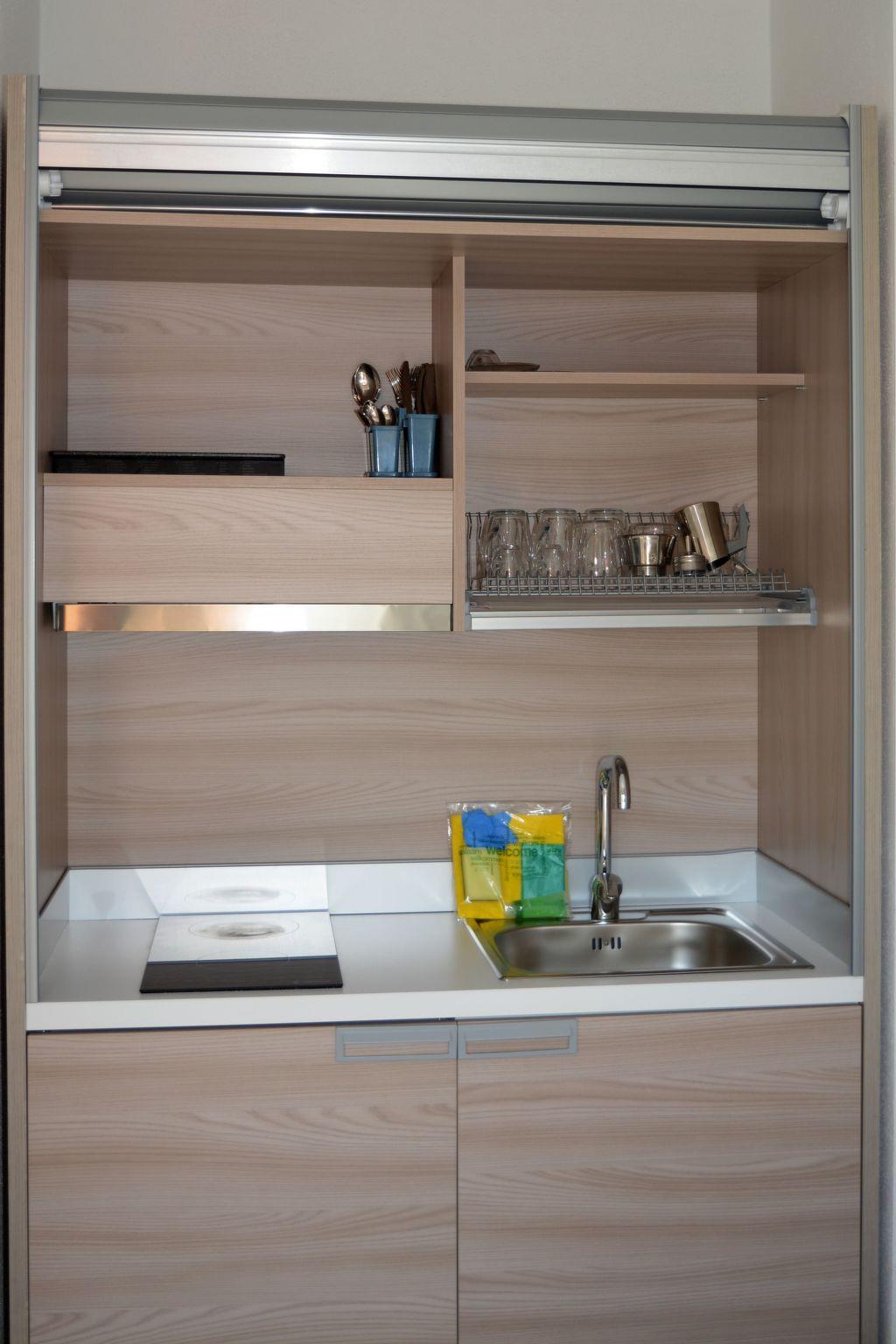 The furniture is totally new and consists of a double sofa bed, a comfortable wardrobe and a pantry, in addition to the fully equipped kitchenette, with induction hobs, microwave, kettle and equipped with crockery and kitchen equipment.
