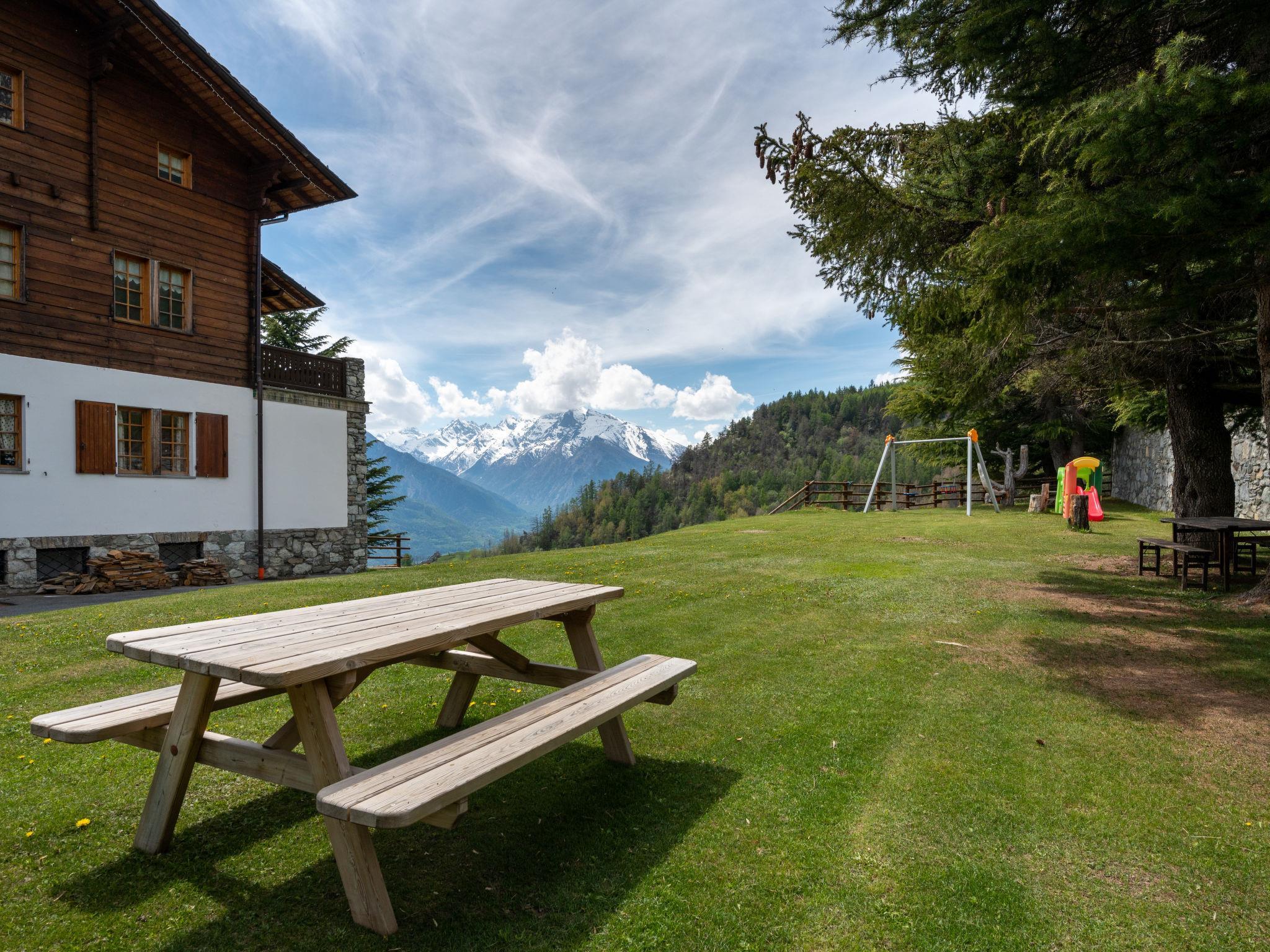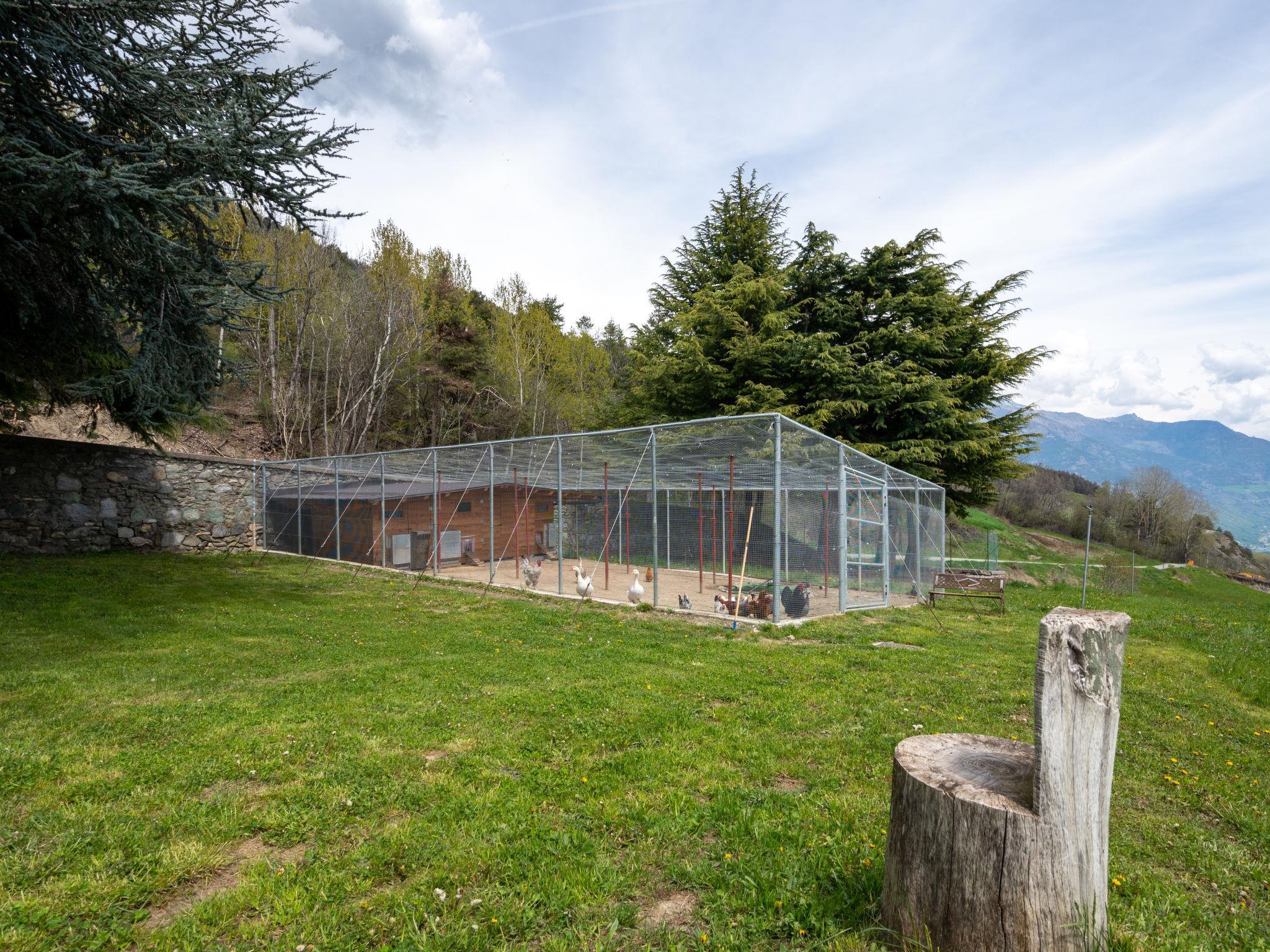 Ville Sur Sarre 12 km from Aosta: Large, beautiful, rustic chalet "Chalet Remondet", 1'300 m a.s.l., 3 storeys, surrounded by trees. In the hamlet Remondet, in a quiet, sunny, elevated position, in the woods, south facing position. For shared use: park 14 ha (fenced), large garden 600 m2 (fenced) with plants and trees, lawn for sunbathing. Barbecue, children's playground. In the house: central heating system, laundry (extra). Parking on the premises. Grocery 6 km, restaurant 4 km, bicycle rental 12 km, bus stop 6 km, indoor swimming pool 6 km. Tennis 6 km, ice rink 12 km. Nearby attractions: ovovia Aosta-Pila 13 km, area pic-nic "Source du Ruet" 3 km, Courmayeur Mont Blanc 38 km. Hiking paths: rifugio Fallère 11 km. Please note: car recommended, no lift. Animals in the neighbourhood. Additional accommodations can be booked.