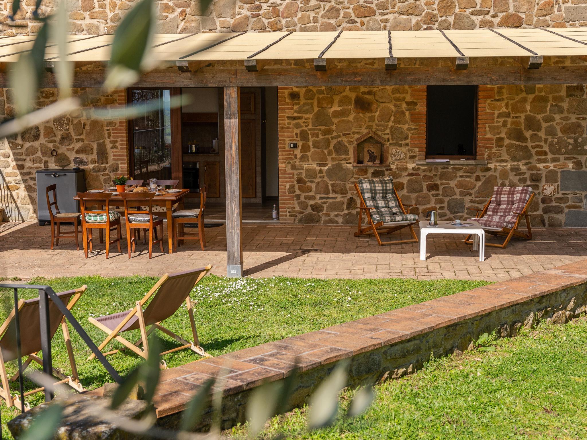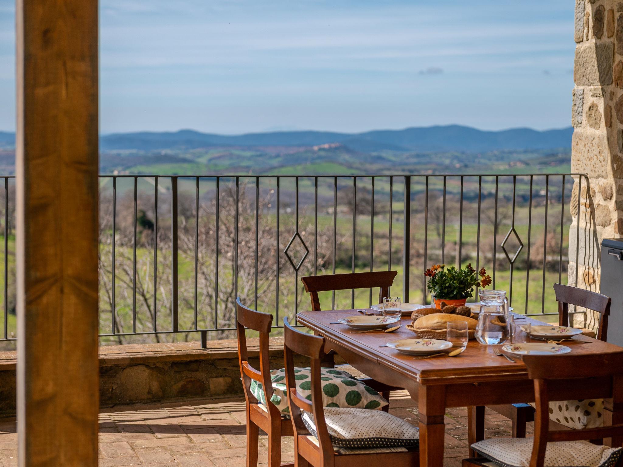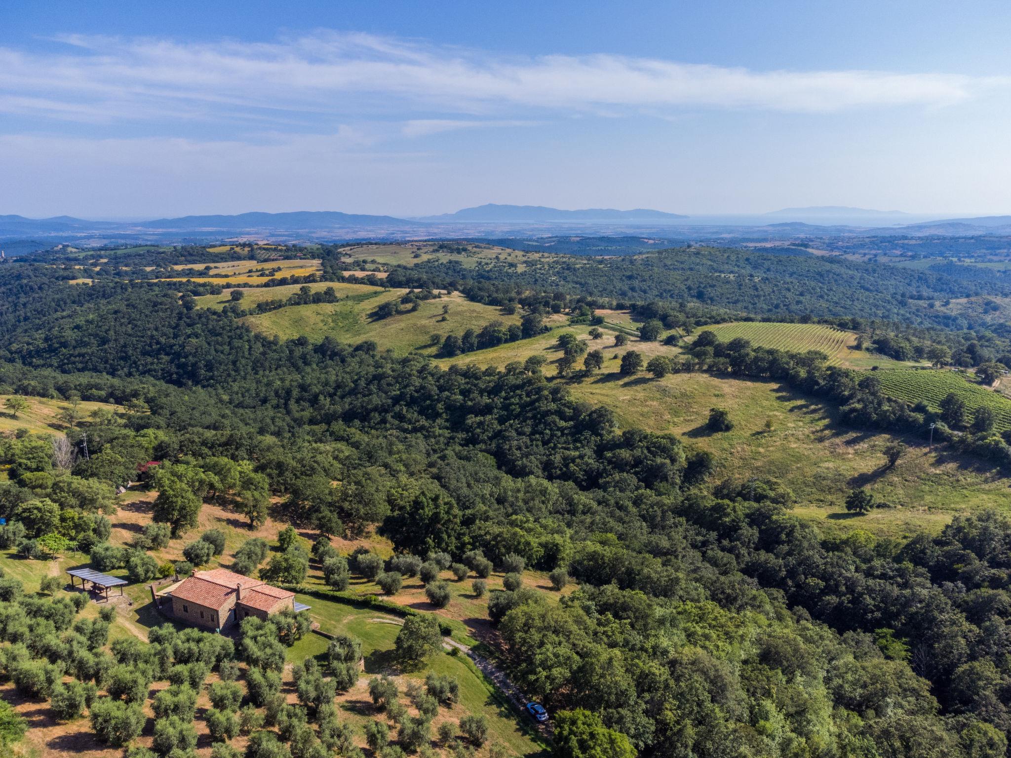 Large, beautiful, rustic house, built in 2019, surrounded by trees and meadows. 4 km from the centre of Scansano, on top of a hill, 27 km from the sea, in the countryside. Private: beautiful, well-kept terraced garden (not fenced) with lawn and flowers. Terrace (45 m2), garden furniture, barbecue house. In the complex: washing machine (for shared use). 350 m long steep, narrow motor access (via unmade road). Parking at the house. Shop 4 km, grocery 4 km, supermarket 4 km, restaurant 4 km, bar 4 km, thermal baths "Saturnia" 30 km. Nearby attractions: Magliano in Toscana 14 km, Talamone 34 km, Monte Argentario 40 km, Grosseto 30 km, Pitigliano 46 km. Hiking paths: Parco Nazionale della Maremma -Uccellina 40 km. Please note: car recommended. Baby equipment on request (included). The owner lives on the same property. Owner uses some rooms in the house.
