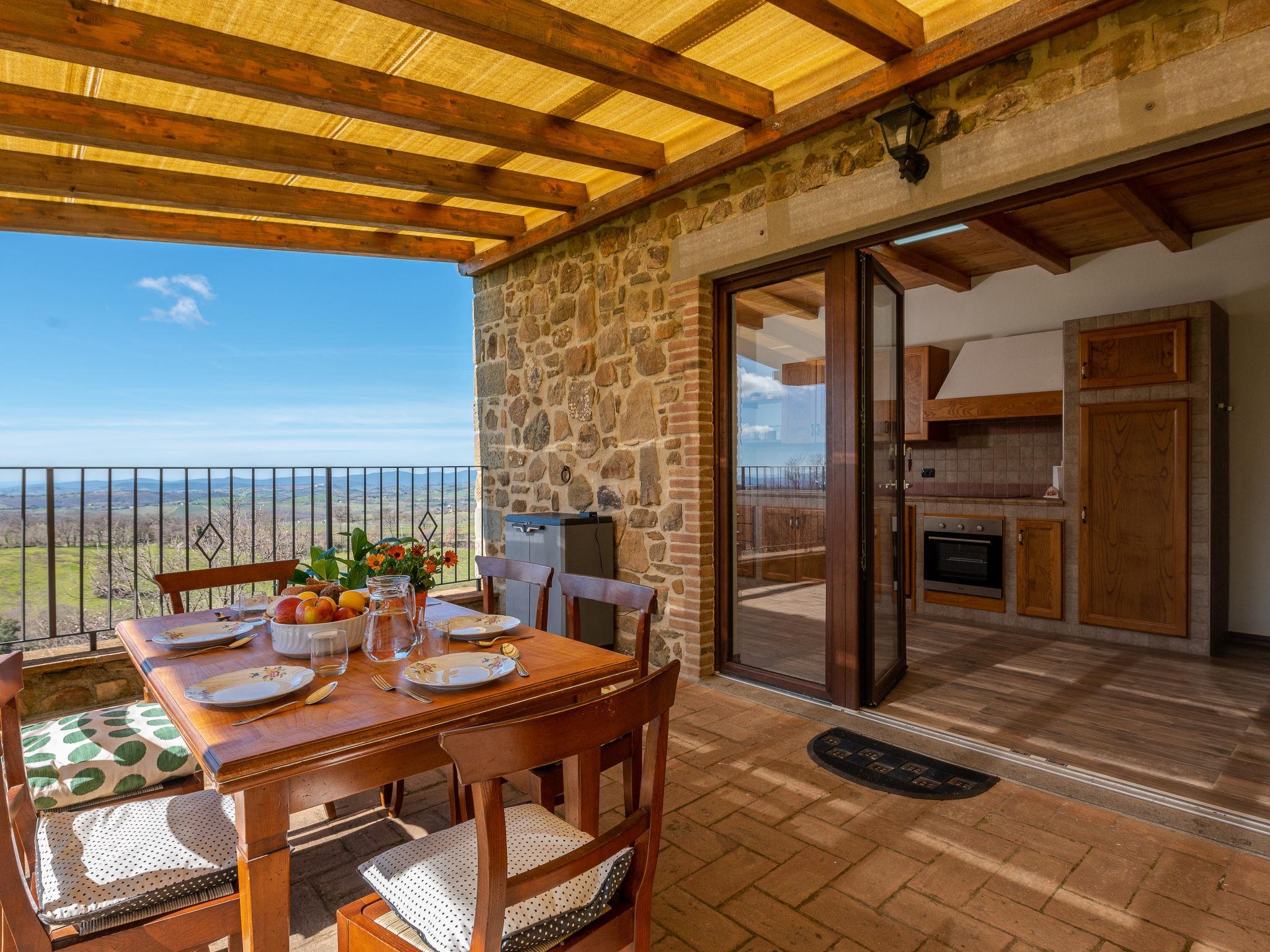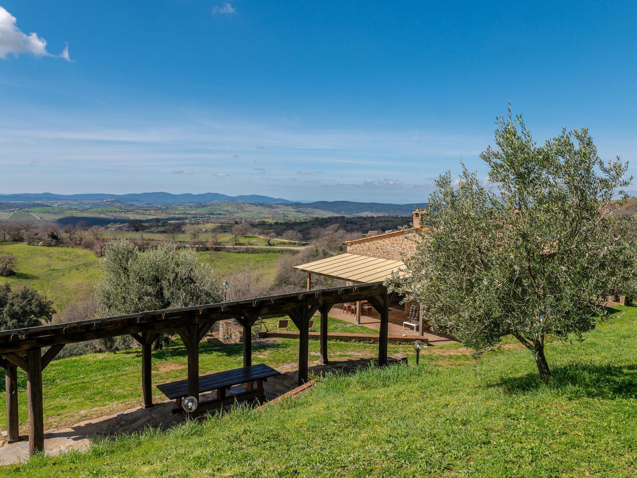 Large, cosy, rustic terraced house, built in 2019, surrounded by trees and meadows. 2 houses in the residence. 4 km from the centre of Scansano, in a quiet, sunny position on top of a hill, 27 km from the sea, in the countryside. For shared use: property 2 ha with lawn and trees. Barbecue house. Private: well-kept terraced garden, 40 m2 with lawn and wildlife garden. Terrace. In the complex: washing machine (for shared use). 350 m long steep, narrow motor access (via unmade road). Parking at the house. Shop 4 km, grocery 4 km, supermarket 4 km, restaurant 4 km, bar 4 km, sandy beach "Giannella (Argentario)" 30 km, thermal baths "Terme di Saturnia" 30 km. Nearby attractions: Magliano in Toscana 14 km, Talamone 34 km, Monte Argentario 40 km, Grosseto 30 km, Pitigliano 46 km. Hiking paths: Parco Nazionale della Maremma -Uccellina 40 km. Please note: car recommended. Baby equipment on request (included). The owner lives on the same property.