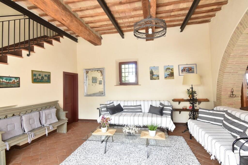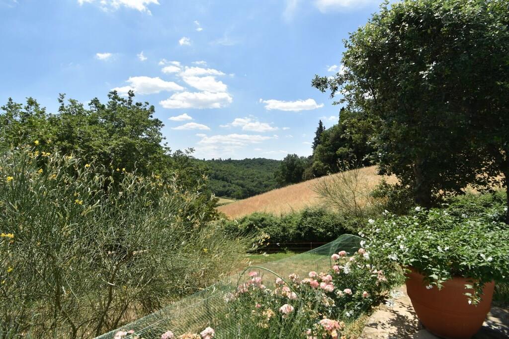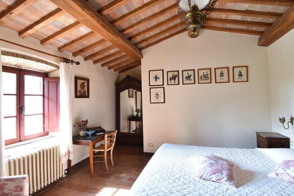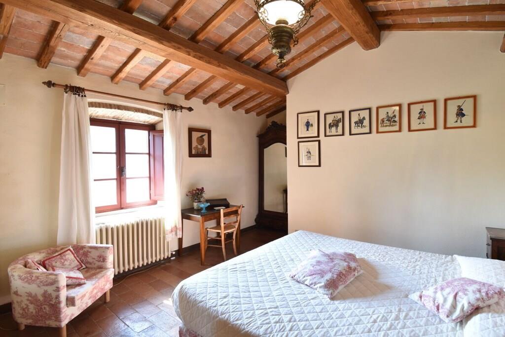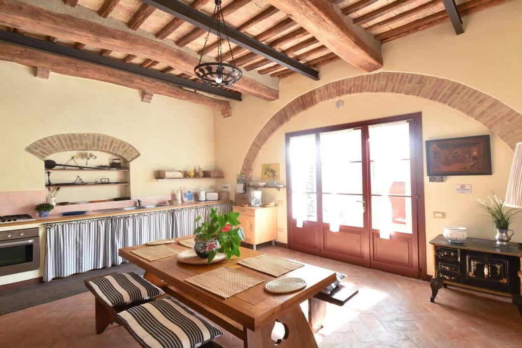 Lejligheden er beliggende i et smukt landsted fra det 18. århundrede med typisk sienesisk arkitektur. Herfra kan du nå Chianti-regionen og byen Siena, som kan prale af et væld af kulturelle attraktioner, på få minutter (6 km). Den nærmeste landsby ligger 3 km væk og har en bar, restaurant og supermarked. Lejlighed (op til 7 personer, 140 m²): Fra den private gårdhave træder du ind i entréen med store vinduer i stueetagen, hvorigennem du kommer ind i lejligheden. Den store stue med sine typiske træbjælker i loftet er opdelt i en stue og et køkken. Stuen er møbleret med sofaer og lænestole. Køkkenet er veludstyret og har et spisebord til otte personer. På første sal er der et soveværelse med dobbeltseng og eget badeværelse og bruser. Et andet soveværelse med to enkeltsenge og et separat badeværelse er på samme etage. På anden sal er der en stor loftsstue med tre enkeltsenge. Soveværelserne tilbyder en smuk udsigt over godsets have. Gården har et dejligt siddeområde med parasol og grill. Der er privat parkering.