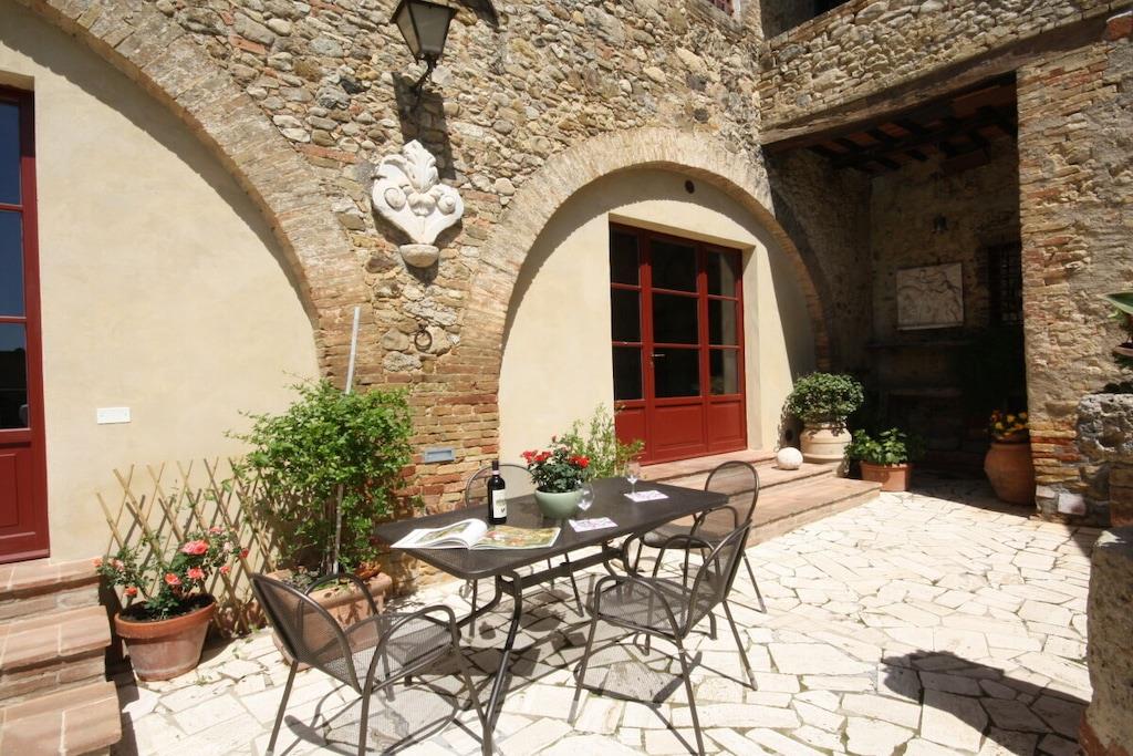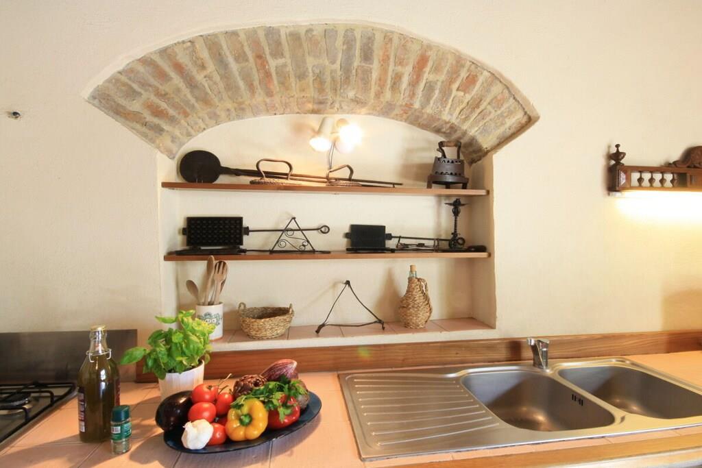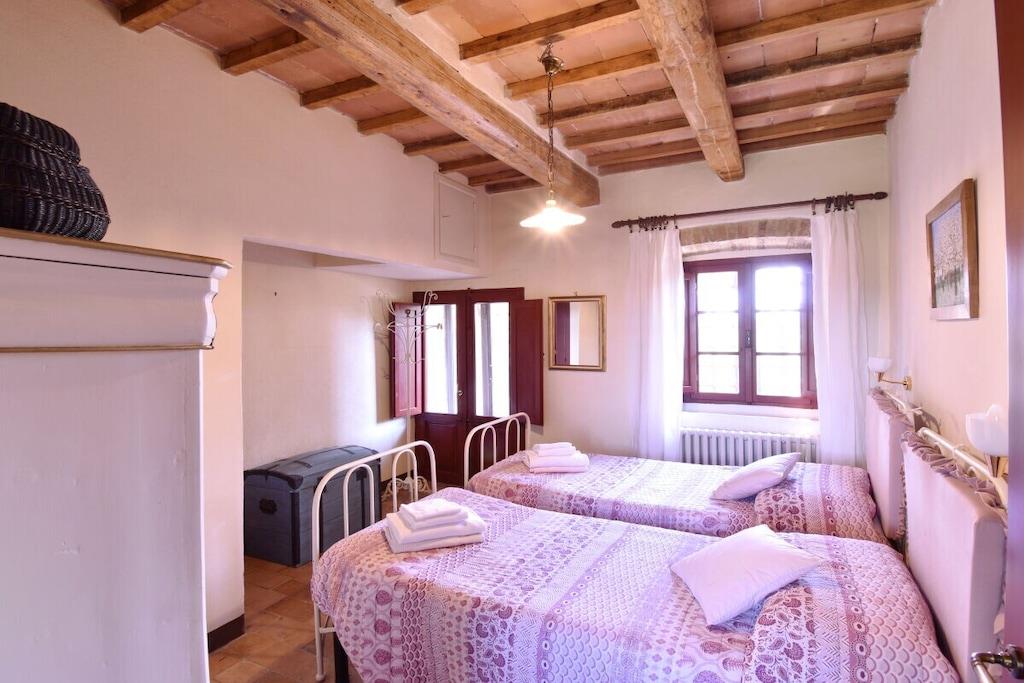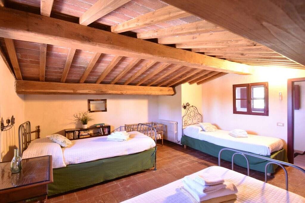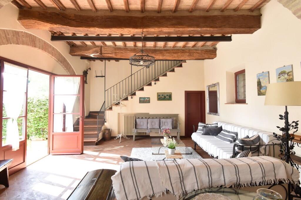 Lejligheden er beliggende i et smukt landsted fra det 18. århundrede med typisk sienesisk arkitektur. Herfra kan du nå Chianti-regionen og byen Siena, som kan prale af et væld af kulturelle attraktioner, på få minutter (6 km). Den nærmeste landsby ligger 3 km væk og har en bar, restaurant og supermarked. Lejlighed (op til 7 personer, 140 m²): Fra den private gårdhave træder du ind i entréen med store vinduer i stueetagen, hvorigennem du kommer ind i lejligheden. Den store stue med sine typiske træbjælker i loftet er opdelt i en stue og et køkken. Stuen er møbleret med sofaer og lænestole. Køkkenet er veludstyret og har et spisebord til otte personer. På første sal er der et soveværelse med dobbeltseng og eget badeværelse og bruser. Et andet soveværelse med to enkeltsenge og et separat badeværelse er på samme etage. På anden sal er der en stor loftsstue med tre enkeltsenge. Soveværelserne tilbyder en smuk udsigt over godsets have. Gården har et dejligt siddeområde med parasol og grill. Der er privat parkering.