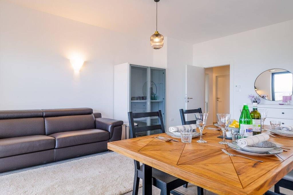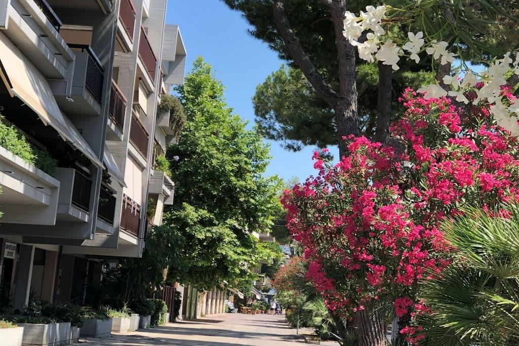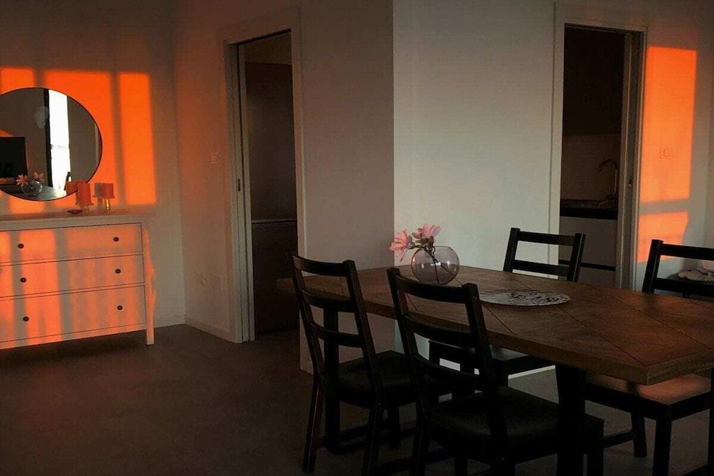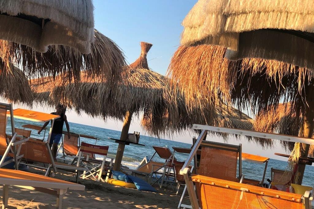Sol, betagende udsigt, komfort og charme. Dette er blot nogle af de exceptionelle træk ved denne ferielejlighed ved havet i Silvi Marina, der har fået tilnavnet Adriaterhavets Perle på grund af sin charmerende beliggenhed ved foden af Abruzzo-bjergene, dens blidt skrånende sandstrand og den livlige aktivitet året rundt langs den maleriske strandpromenade. Denne eksklusive, komfortable ferielejlighed ligger på anden sal i en lille ejerlejlighed med kun tre enheder. Rummelige altaner omkranser de nyindrettede værelser på begge sider med udsigt over den beskyttede strand og havet på den ene side og den fyrretræsbeklædte promenade med udsigt over de frodige olivenlunde og vinmarker på den anden side. Lejligheden er tilgængelig via elevator eller trappe og åbner ud til en gang, der giver direkte adgang til de to soveværelser, badeværelset og opholdsstuen. De to soveværelser er møbleret med henholdsvis kingsize (200x180) og queensize (200x140) dobbeltsenge, store garderobeskabe og et skrivebord. De tilbyder direkte adgang til den rummelige sydvestvendte balkon med komfortable liggestole. En sovesofa af høj kvalitet (200x160) i stuen fuldender indkvarteringen for op til 6 personer. Morgenfri personer kan nyde solopgangen over havet på balkonen ud for stue- og spisestuen og hurtigt servere morgenmad via den korte gåtur fra det fuldt udstyrede køkken. Et induktionskomfur, ovn, mikrobølgeovn, opvaskemaskine og køleskab med et stort frostrum giver selv den mest ambitiøse hjemmekok alle muligheder. Stille klimaanlæg understøttet af en gaskedel garanterer behagelige temperaturer i opholds- og soveområderne, både sommer og vinter.