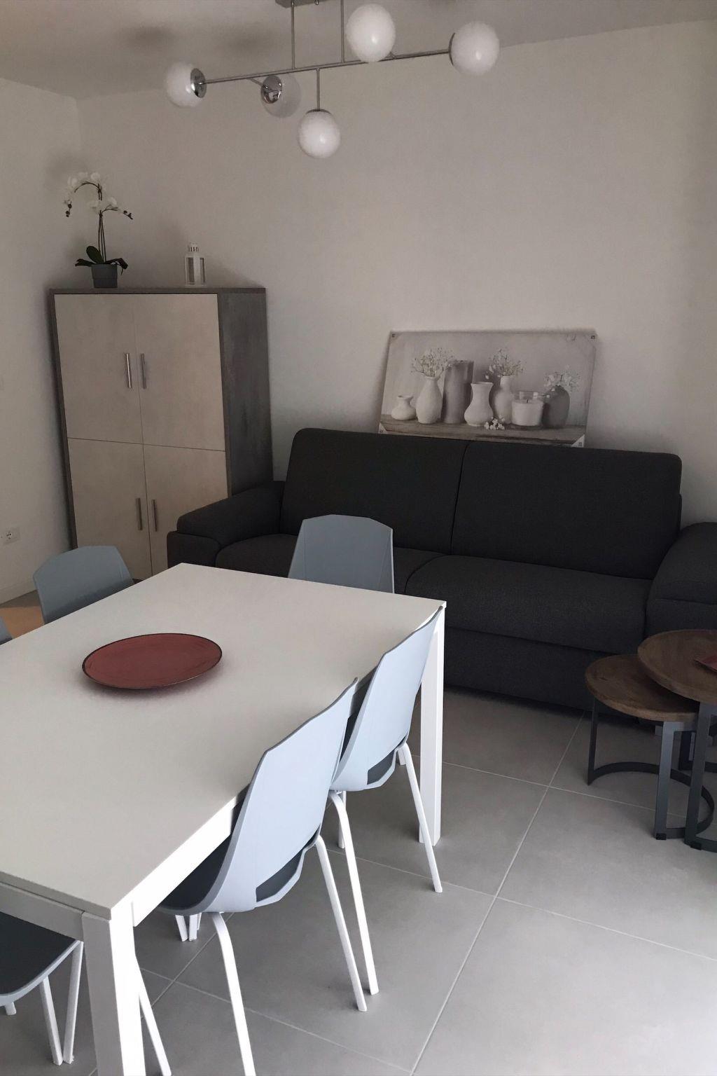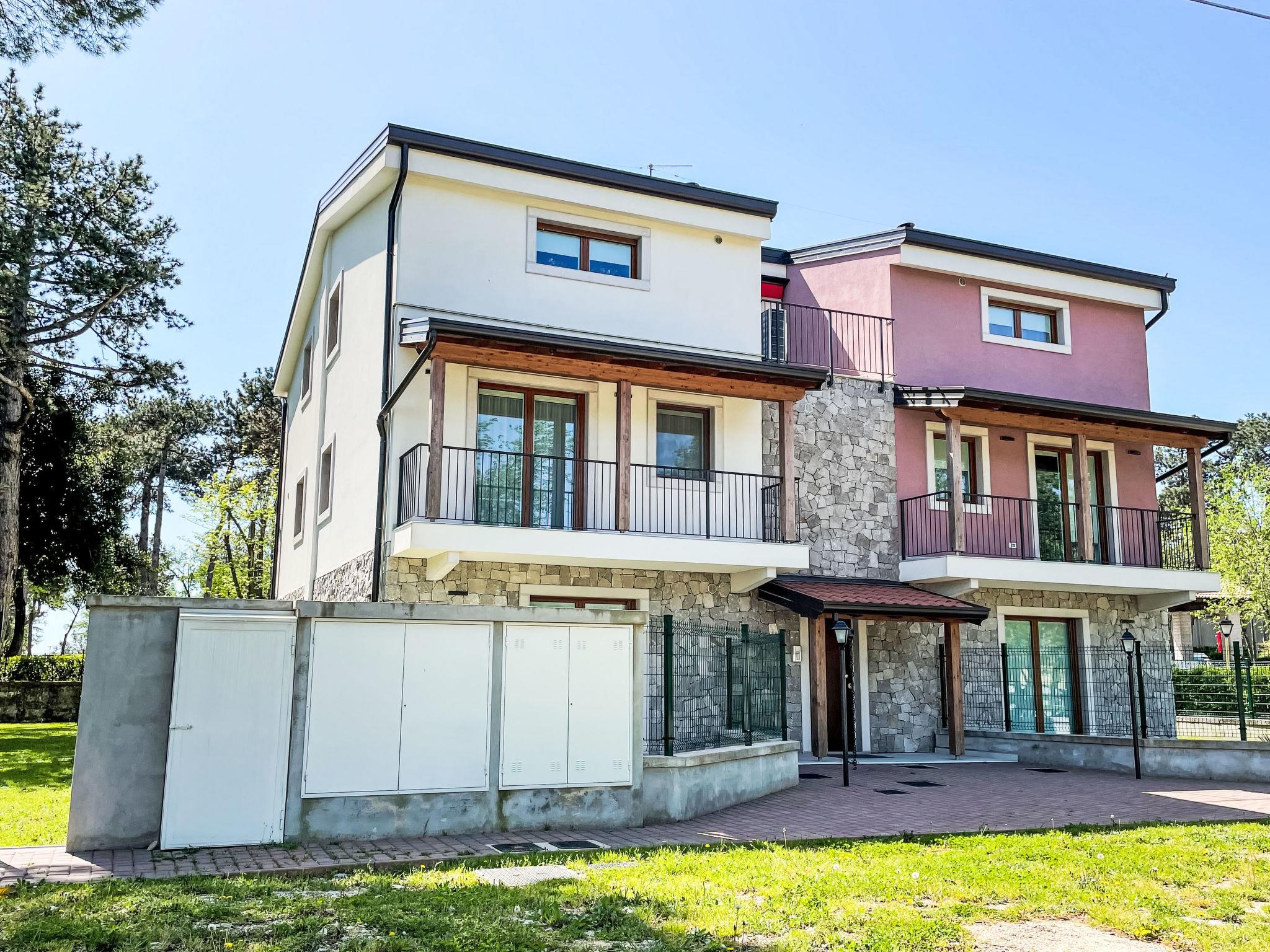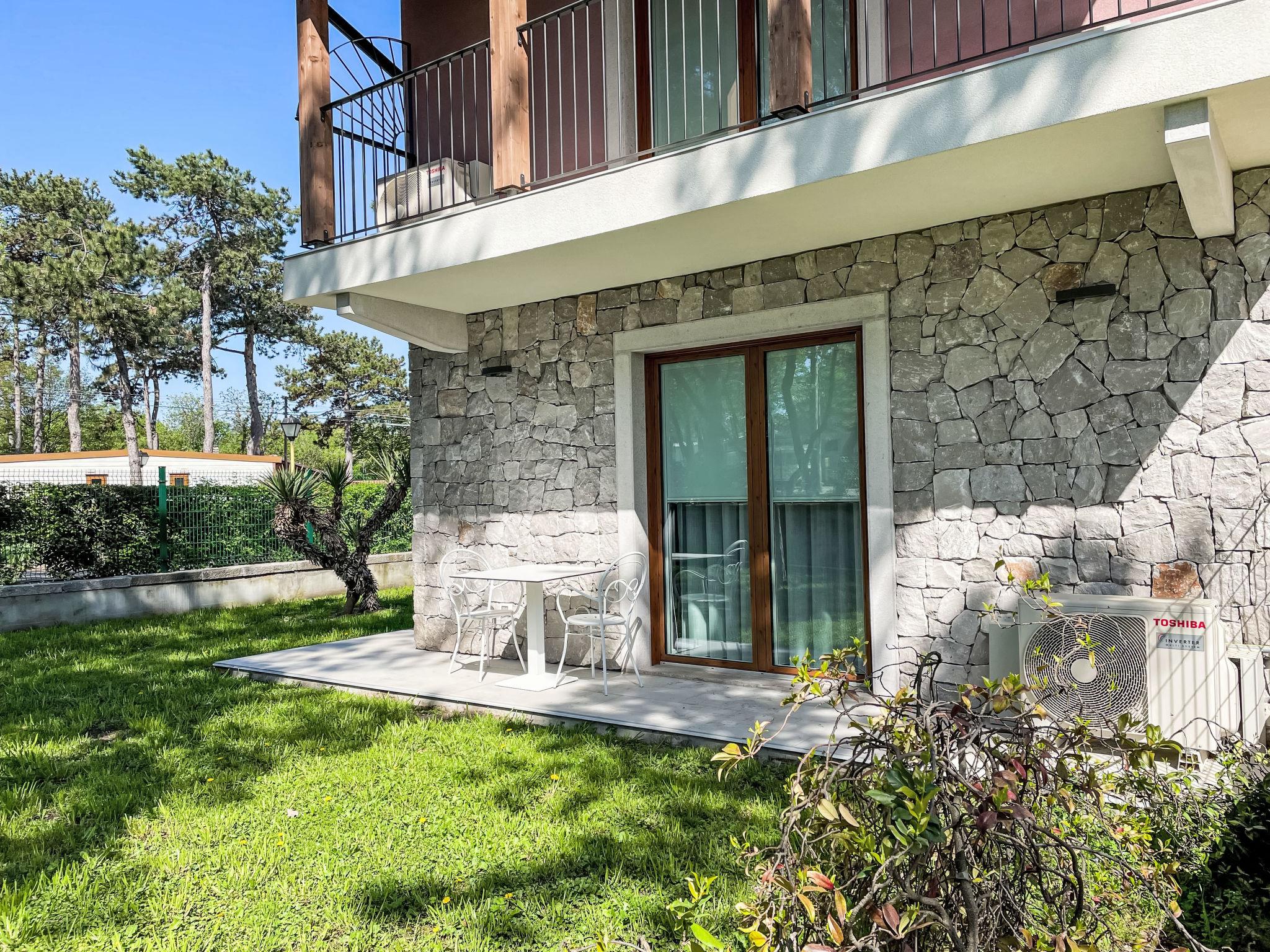 "Residence Mare Azzurro, App. Carso", 3-room apartment 70 m2, on the ground floor. Spacious and bright, modern furnishings: living/sleeping room with 1 double sofabed, dining table and satellite TV. 1 double bedroom with shower/WC. 1 room with 2 beds. Kitchenette (oven, dishwasher, 4 gas rings, microwave, freezer, electric coffee machine). Shower/bidet/WC. Air-conditioning, forced-air heating. Small terrace. Terrace furniture, deck chairs (2). Facilities: washing machine, baby cot for up to 2 year olds (extra). Internet (WiFi, extra). Parking (1 car) at the house. Please note: non-smokers only. This flat is located in the new small residence with a total of 6 flats, approx. 50 metres from Camping Village Mare Pineta. Lift in the residence. IT032001B4VZOMG5SE