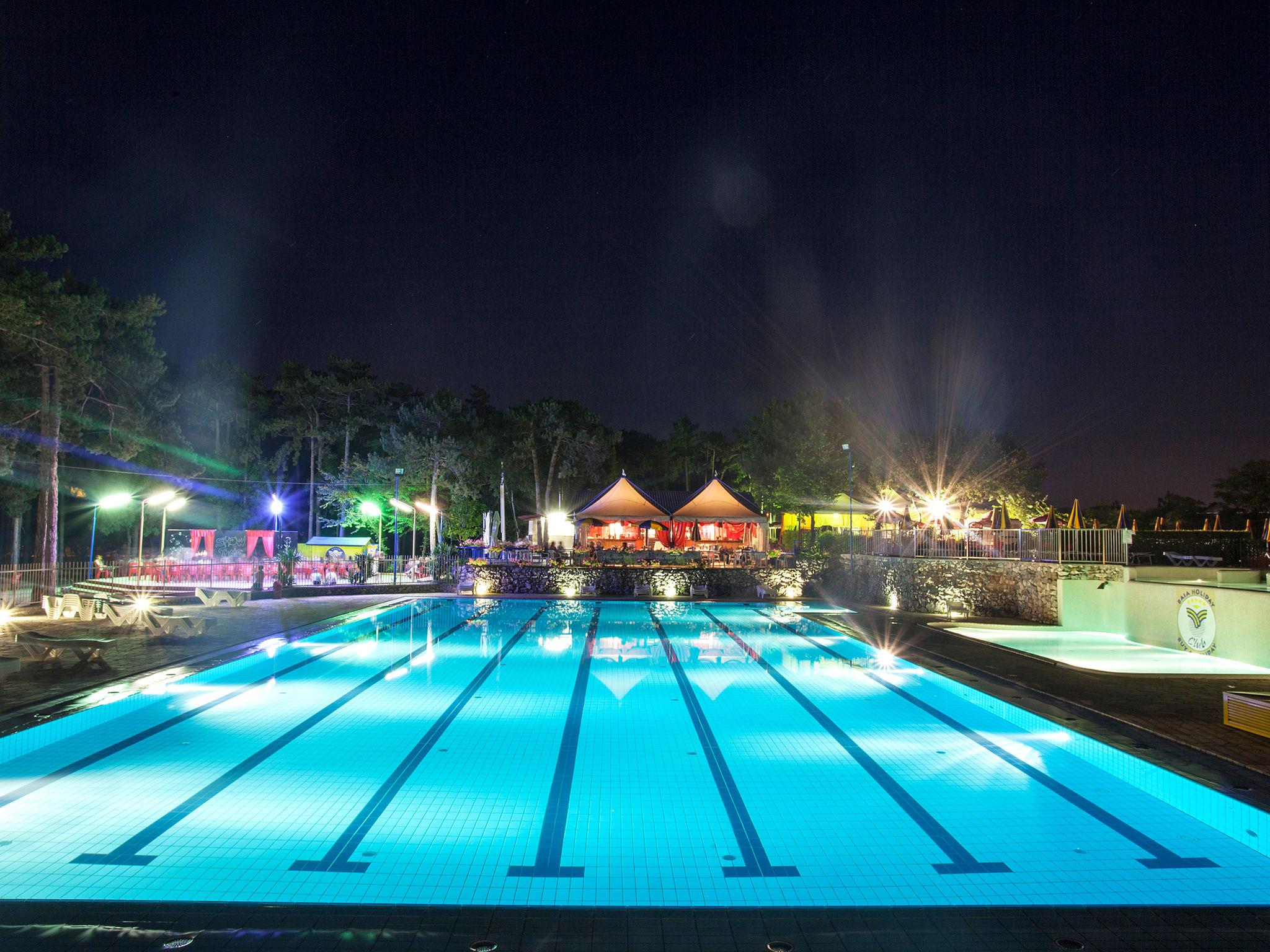Large, child friendly holiday village "Camping Village Mare Pineta". 115 houses in the resort. 6 apartments in the residence. 1 km from the centre of Sistiana, 18 km from the centre of Trieste, in an elevated position on a slope, 1.6 km from the sea, 1.6 km from the beach. For shared use: property 10 ha (fenced) with trees, swimming pool (30 x 20 m, seasonal availability: 23.May. - 15.Sep.). Children's pool, outdoor shower, tennis (extra), table tennis, basketball (extra), beach volleyball, children's playground. In the complex: reception, bistro, shopping facilities, washing machine (for shared use, extra). Grocery 100 m, supermarket 1 km, bus stop 200 m, railway station "Trieste Centrale" 18 km, rocky beach "Baia Sistiana" 1.6 km. Nearby attractions: Castello di Duino 2 km, Castello di Miramare 13 km, Sentiero Rilke 350 m. Please note: entertainment in the season. Suitable for families. Obligation to wear bathing caps.