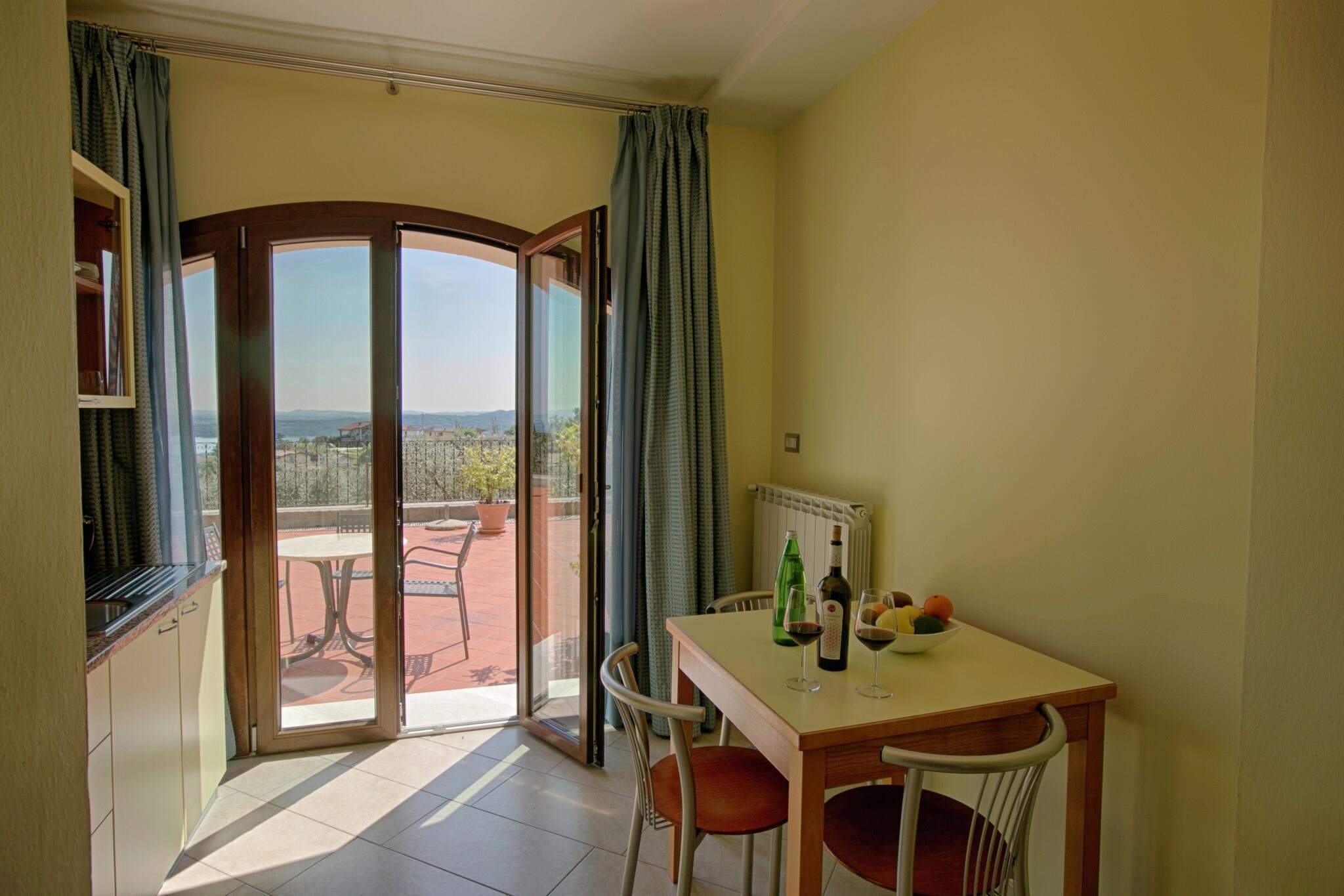 På toppen af en bakke er der et smukt hjem med 20 enkle, men pænt møblerede lejligheder og med en smuk panoramaudsigt over den smukke Gardasøen og det omkringliggende landskab. Det ligger kun 10 km fra motorvejen Milano-Venedig og 3 km fra søen. Det er en strategisk position for udflugter til Verona, Mantua, byerne omkring Gardasøen, forlystelsesparker som Gardaland og de botaniske haver og parker. Nedenfor er der restauranter og butikker, og der er mange sports muligheder, herunder ridning, golf (2 km), tennis, vandreture, mountain biking og alle vandsport. Der er en restaurant, der serverer lokale specialiteter og fisk fra Gardasøen ved boligen, en olivenlund, en have og en fælles swimmingpool. Ejeren organiserer ture i familiens oliefabrik og fri smagning af ekstra jomfru olivenolie DOP, vin, grappa og typiske produkter. Huset kan rumme op til to voksne og et barn under 12 år.