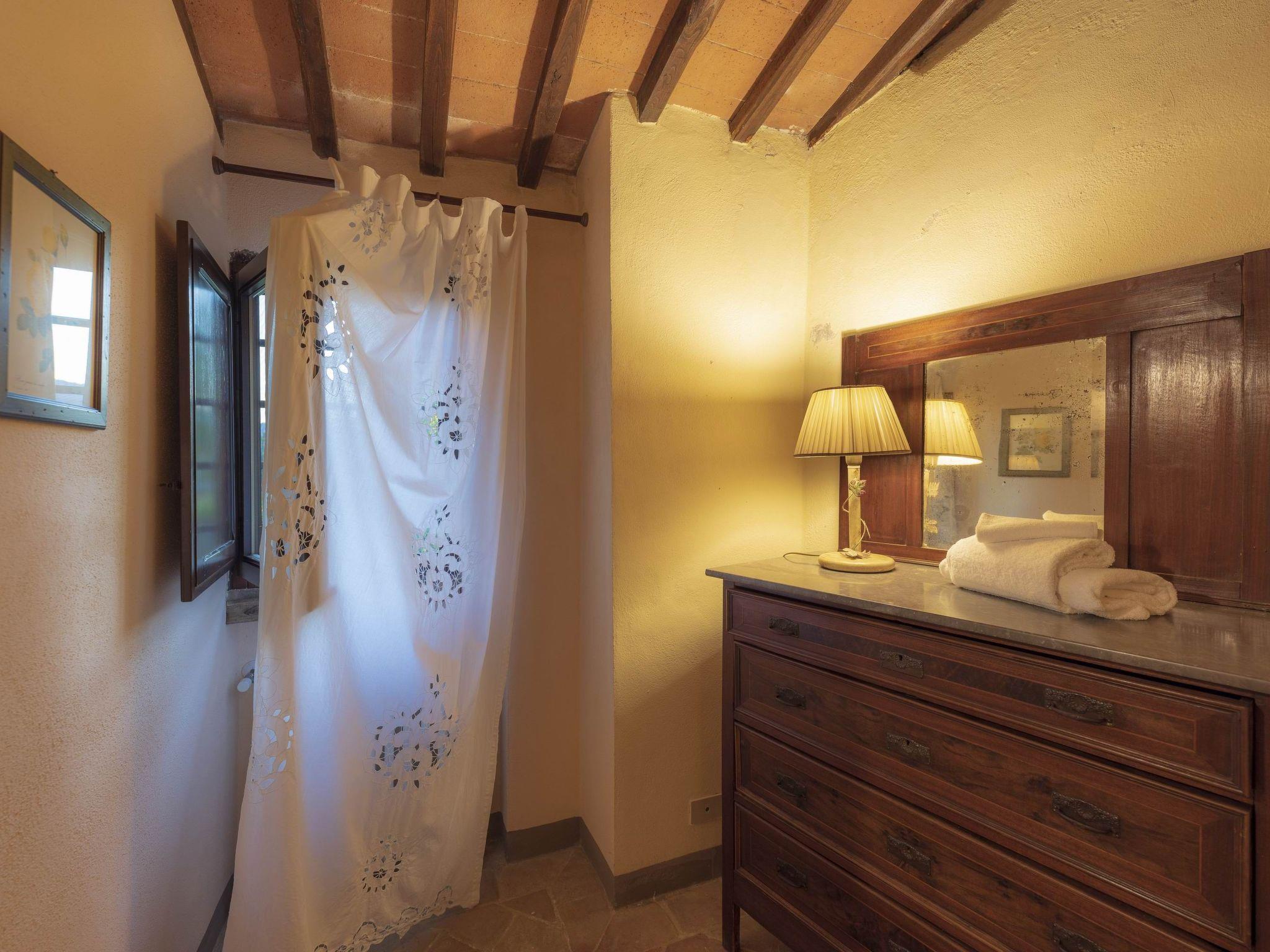 The 77 m² flat for 4+2 persons (sofa bed suitable for children up to 1.50 m tall) is located on the ground floor of an annex directly adjacent to the main building. Ground floor: living room with fireplace and sofa, dining area, kitchen, double room with walk-in wardrobe, bathroom with shower, twin room with walk-in wardrobe, bathroom with shower. From the living room you have access to the covered terrace equipped with table and chairs, from which you can enjoy a wonderful view of the pool and the surrounding countryside.