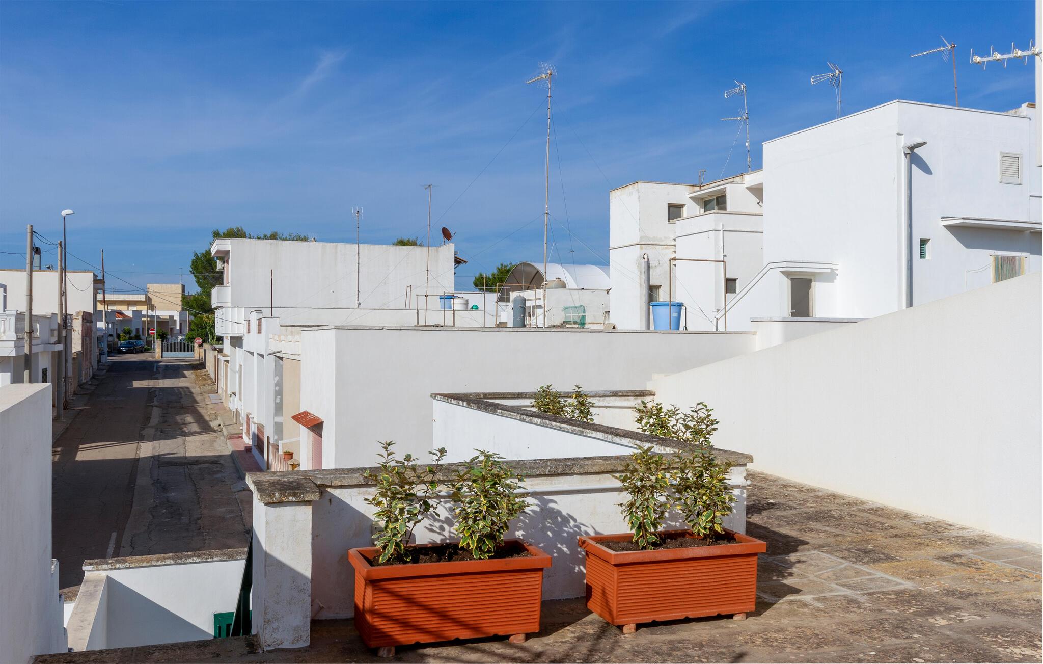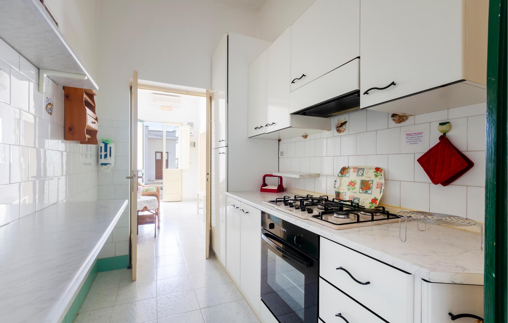 Velkommen til dette skønne hus, der ligger i Marina di Mancaversa tæt på Taviano med en malerisk udsigt over byens tage ud til havet. Huset er pænt indrettet med maritim kunst på væggene, velholdte flisegulve og gode faciliteter, der gør det nemt for jer at slappe af og hygge før og efter dagens udflugter. Begynd dagen med at tilberede en lækker morgenmad i køkkenet og nyd den på terrassen i solens første stråler, mens I lægger planer for de kommende dage.