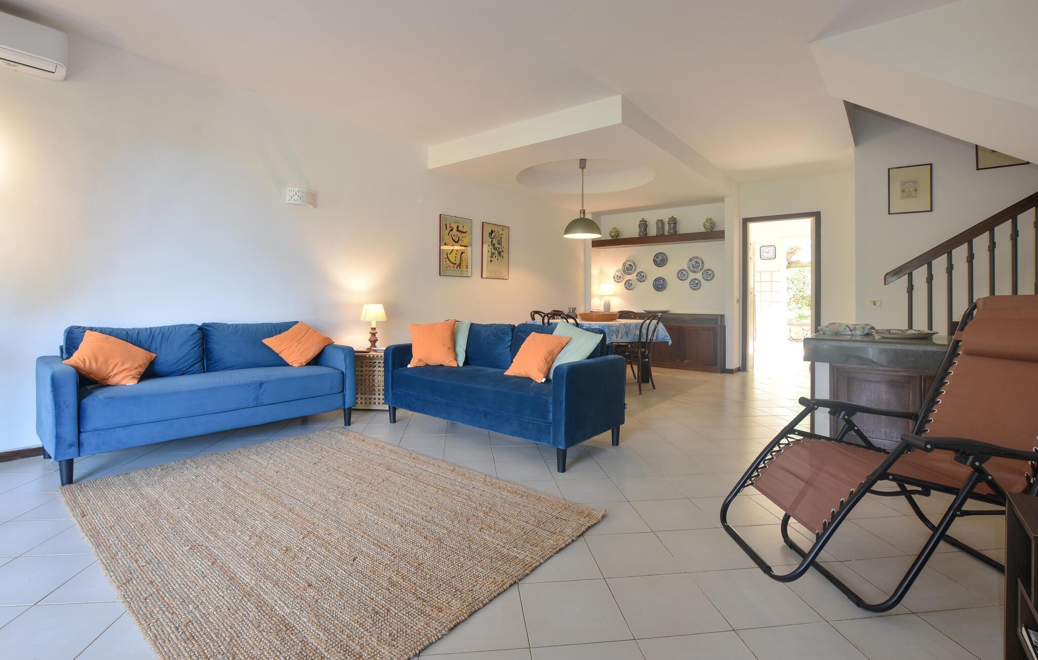Velkommen til dette rummelige og smagfulde feriehus, hvor I vil føle jer helt hjemme selv med en større gruppe. Tilbered lækre italienske retter i det åbne, fuldt udstyrede køkken og nyd dem ved det store spisebord. Slap af på de komfortable sofaer med en hyggelig spilaften eller fordyb jer i en spændende roman af Andrea Camilleri.