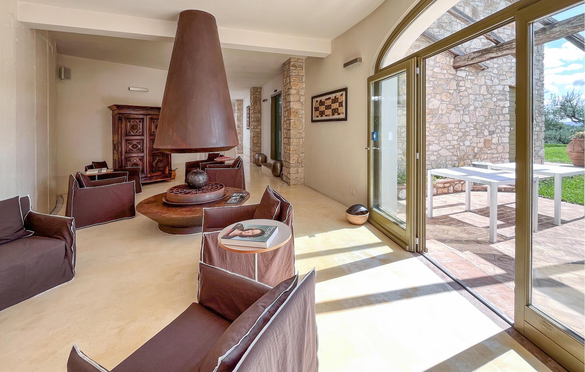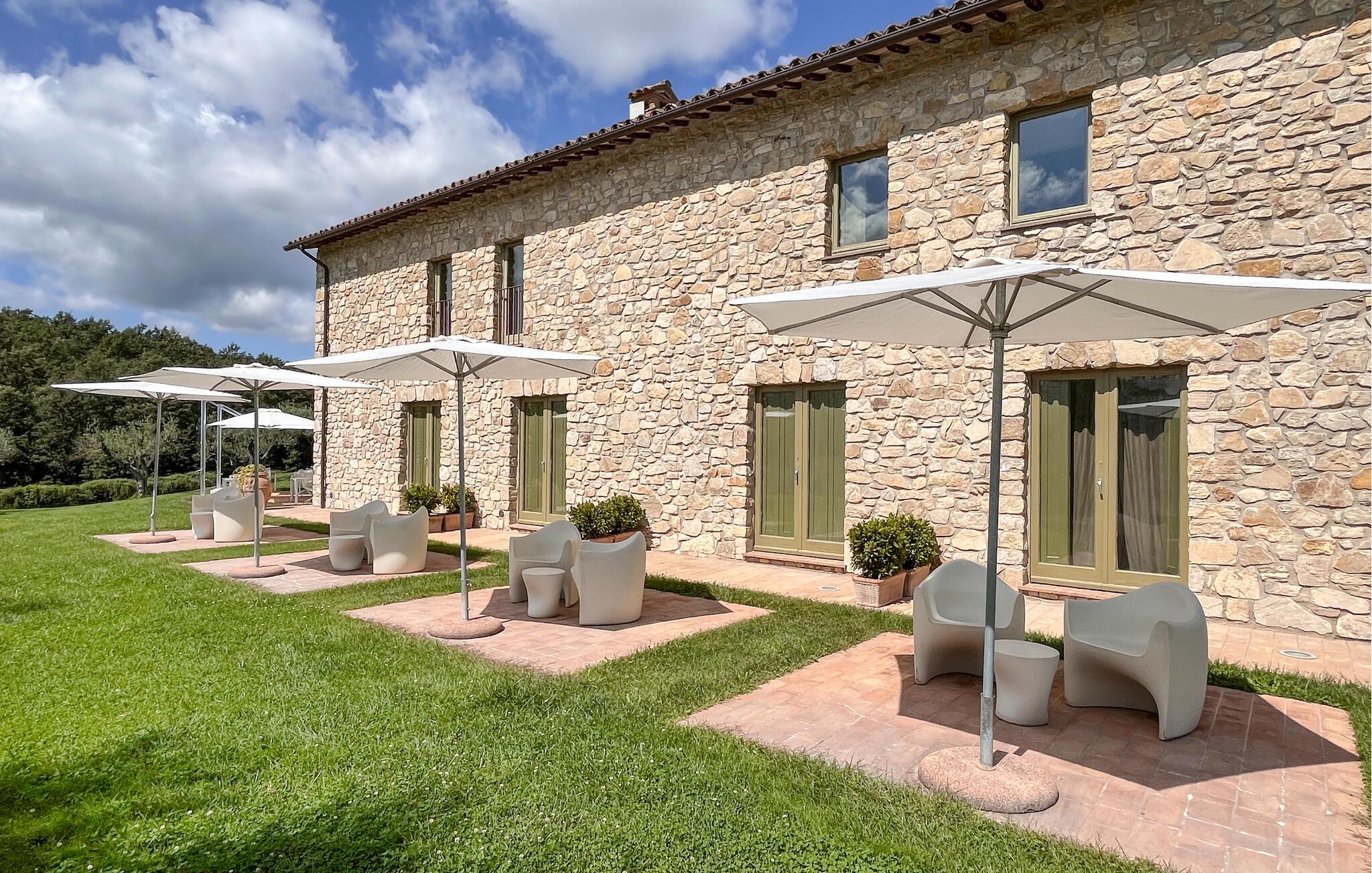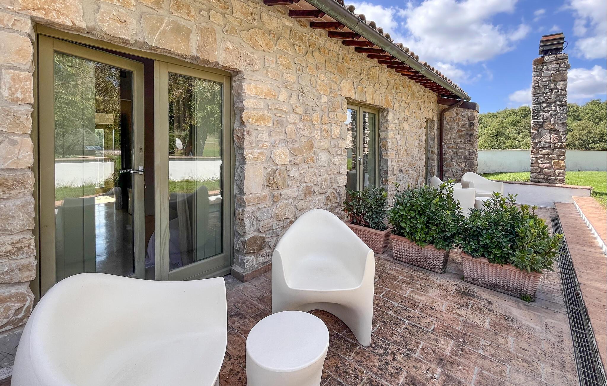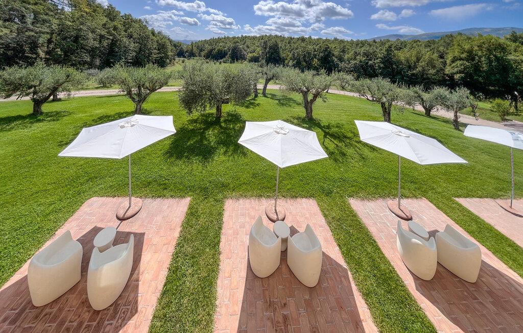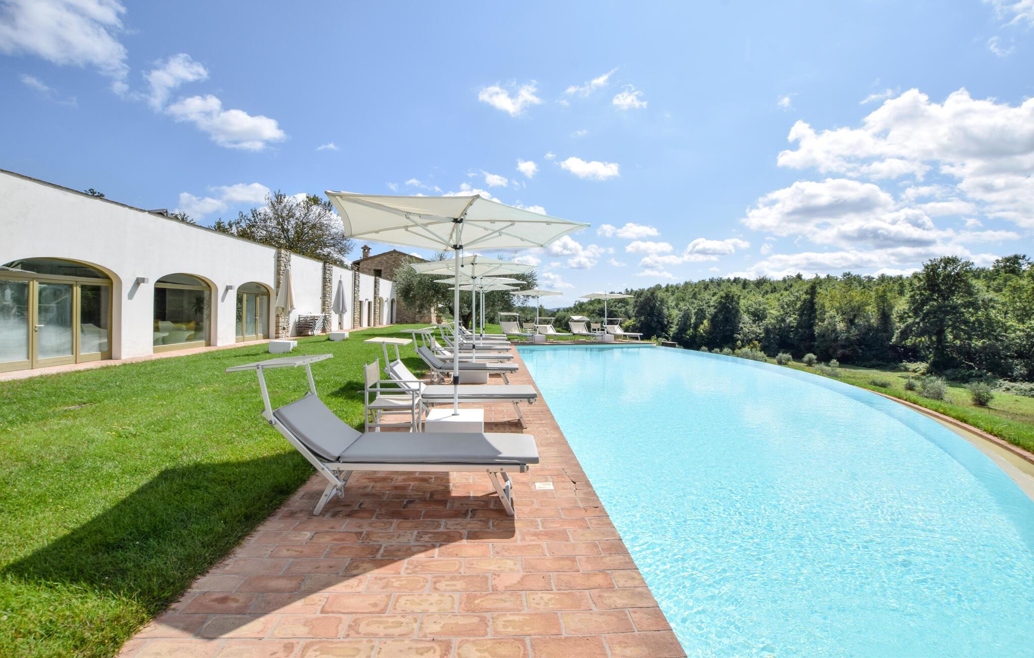 Udenfor venter en stor pool med solterrasse, komfortable liggestole og hvide parasoller – ideelt til stille stunder i solen. Mellem oliventræer og åbent landskab finder I her et sted, hvor afslapning og fornyet energi smelter harmonisk sammen.
