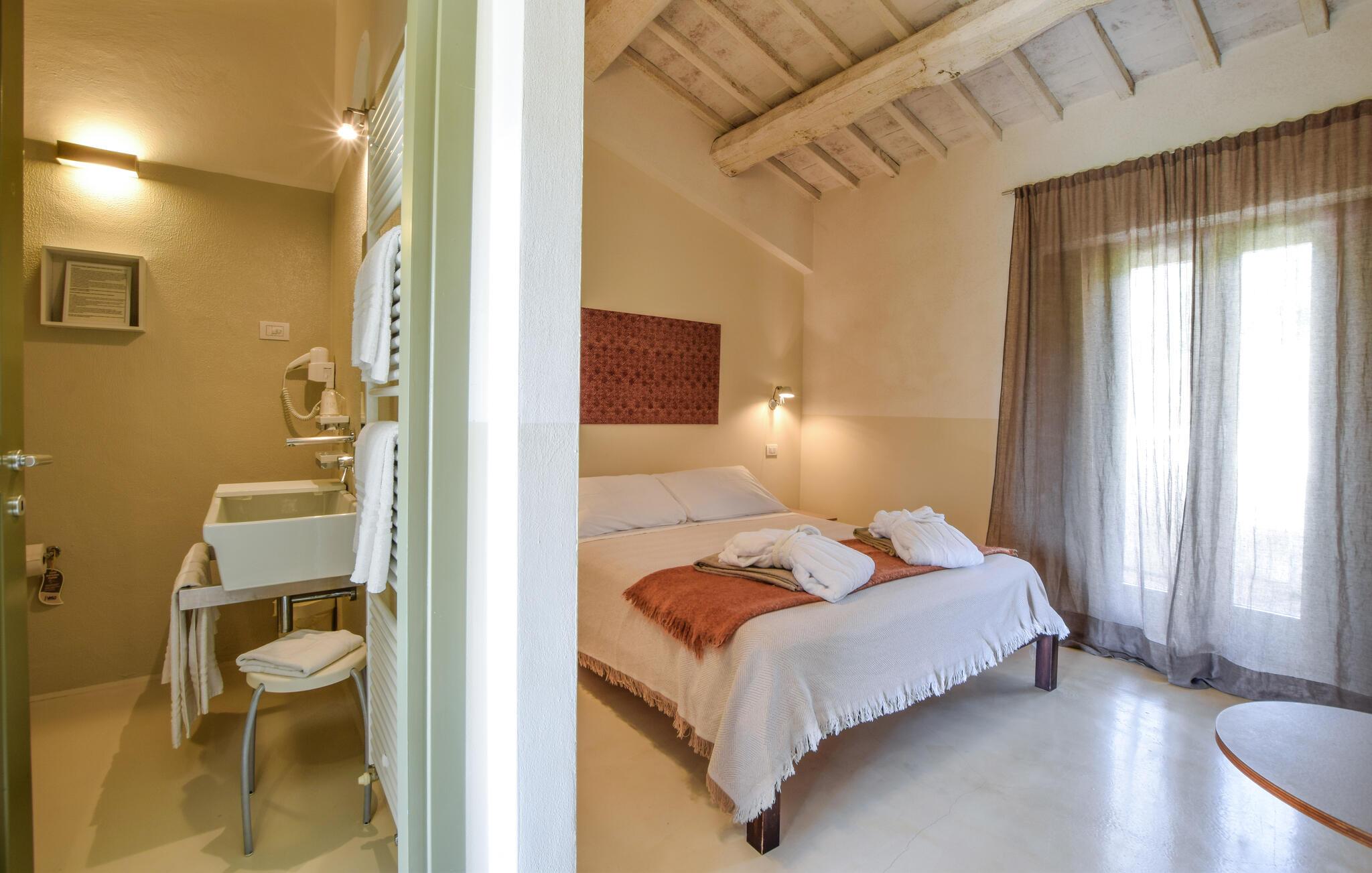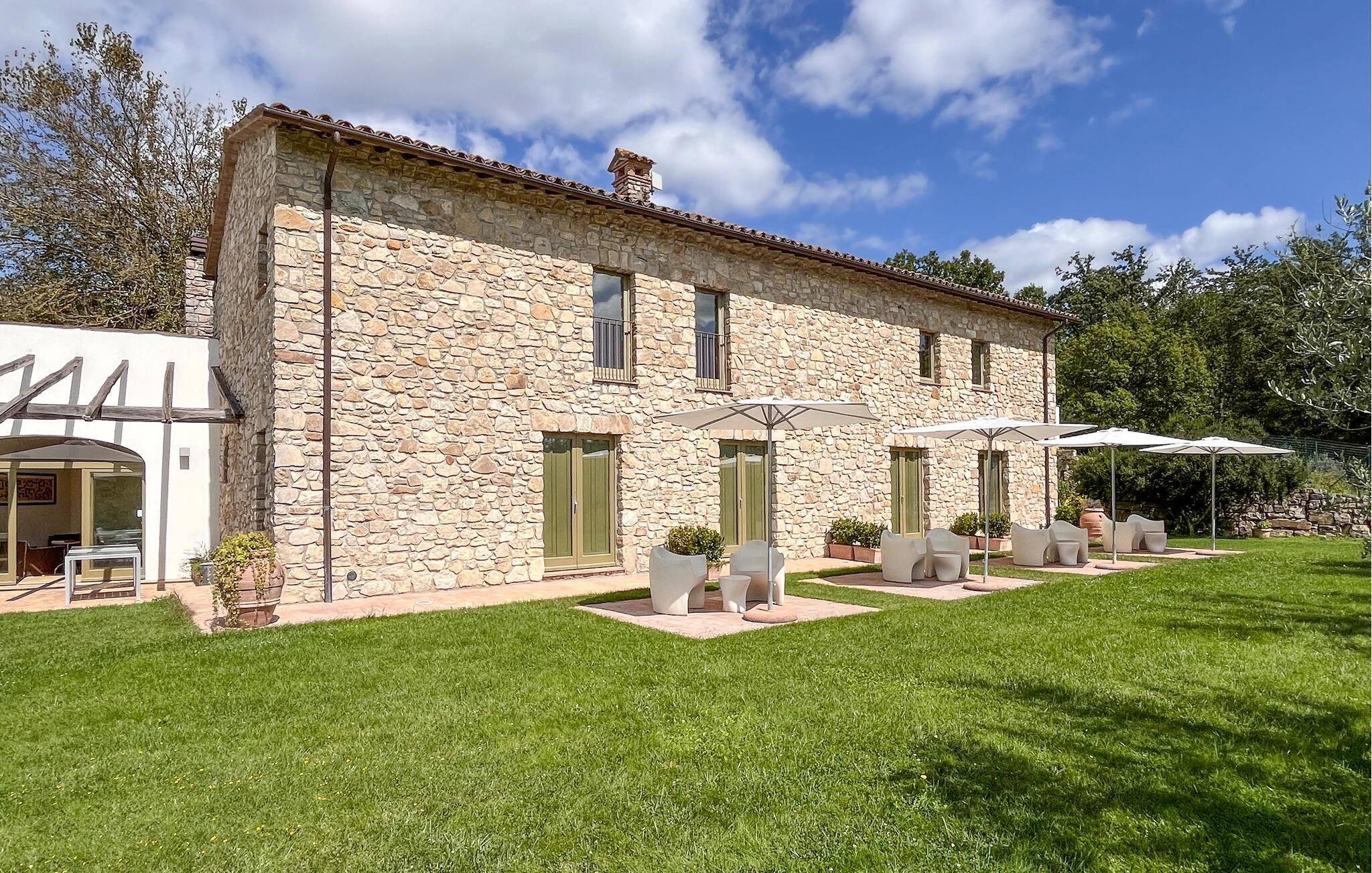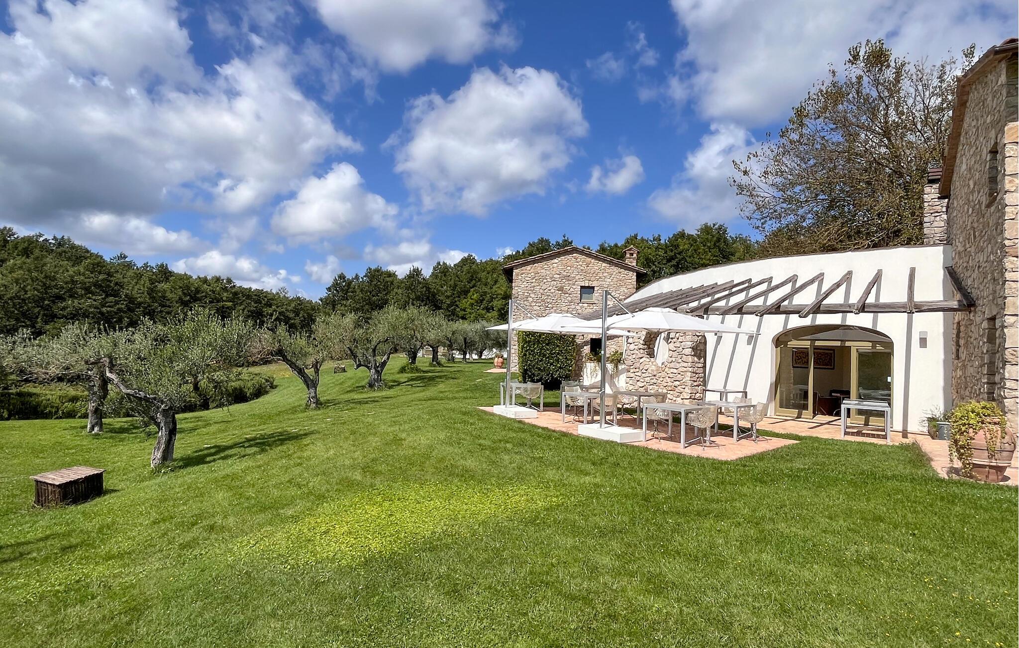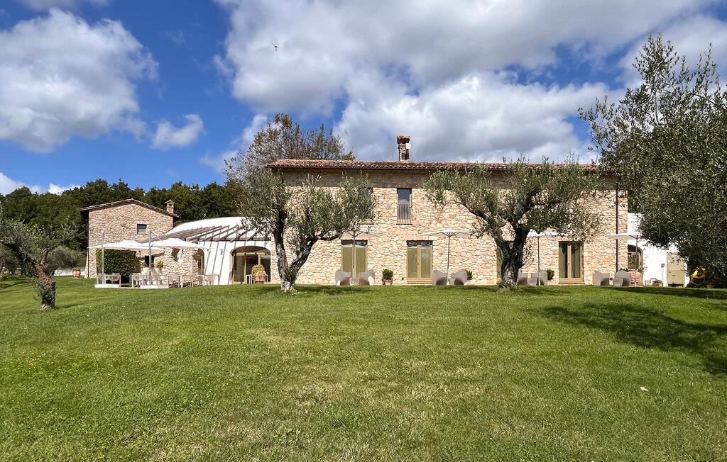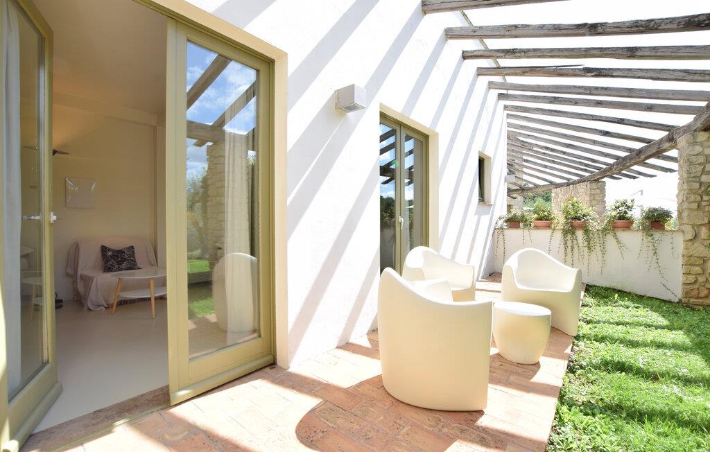 Udenfor venter en stor pool med solterrasse, komfortable liggestole og hvide parasoller – ideelt til stille stunder i solen. Mellem oliventræer og åbent landskab finder I her et sted, hvor afslapning og fornyet energi smelter harmonisk sammen.