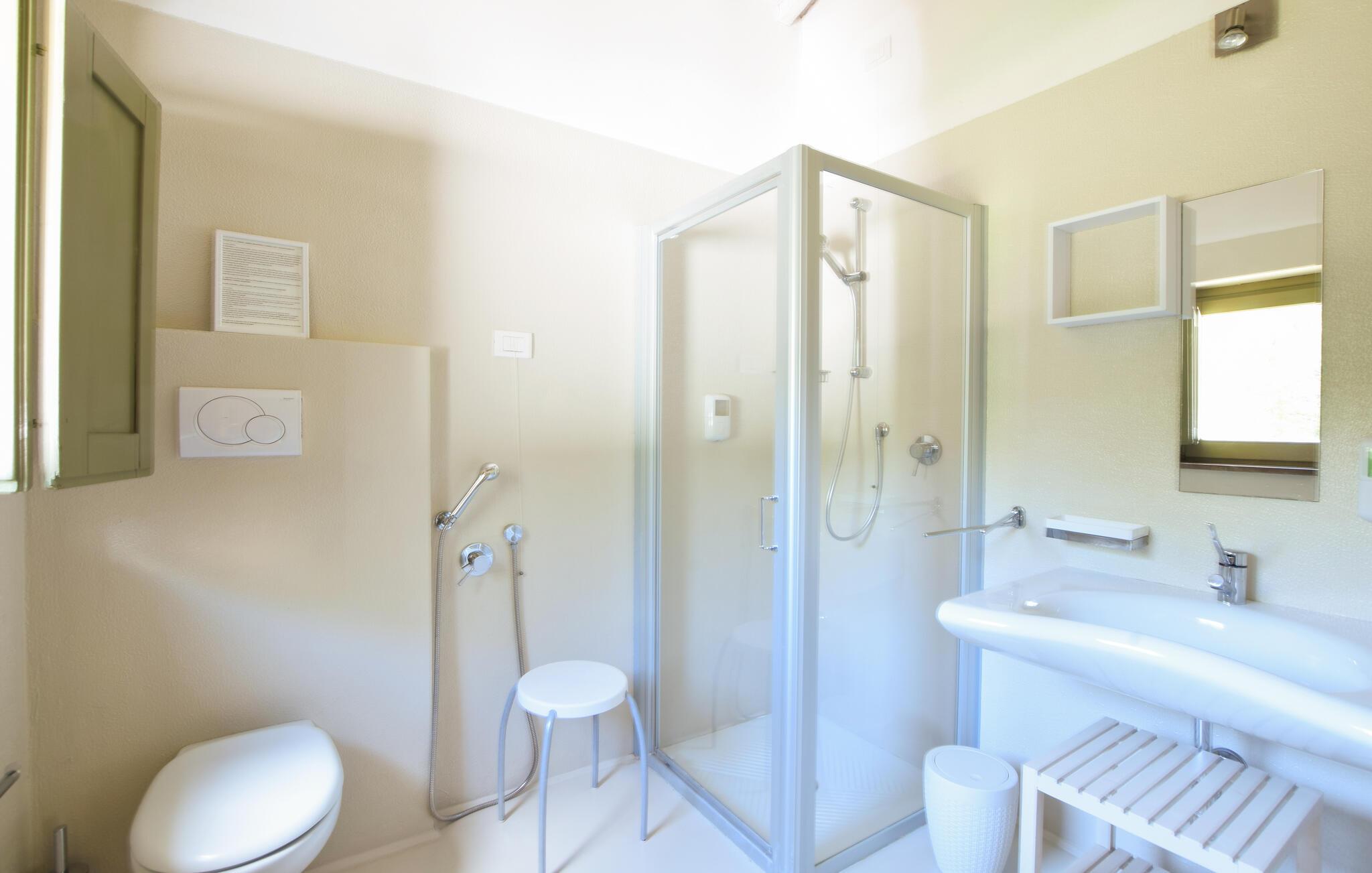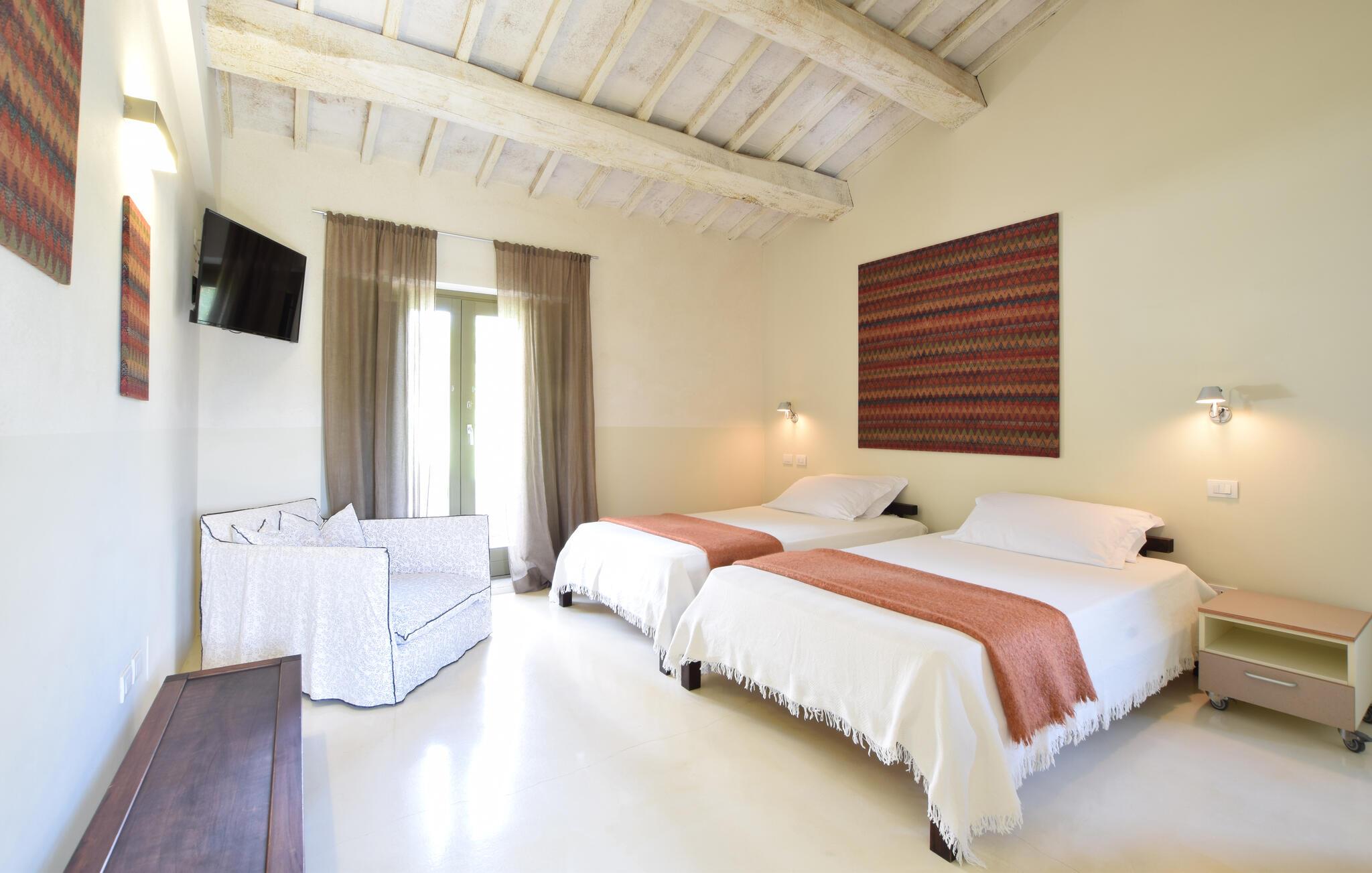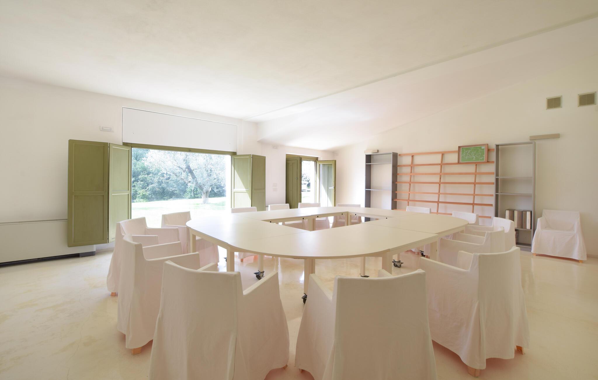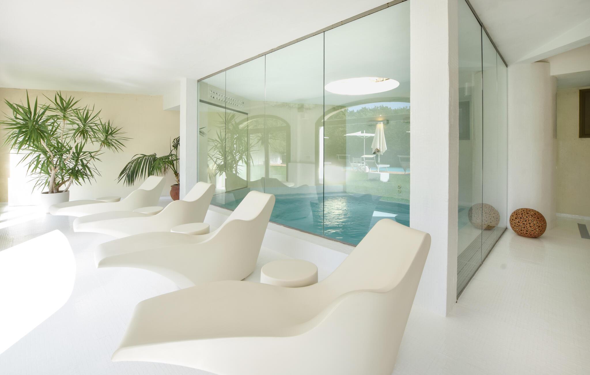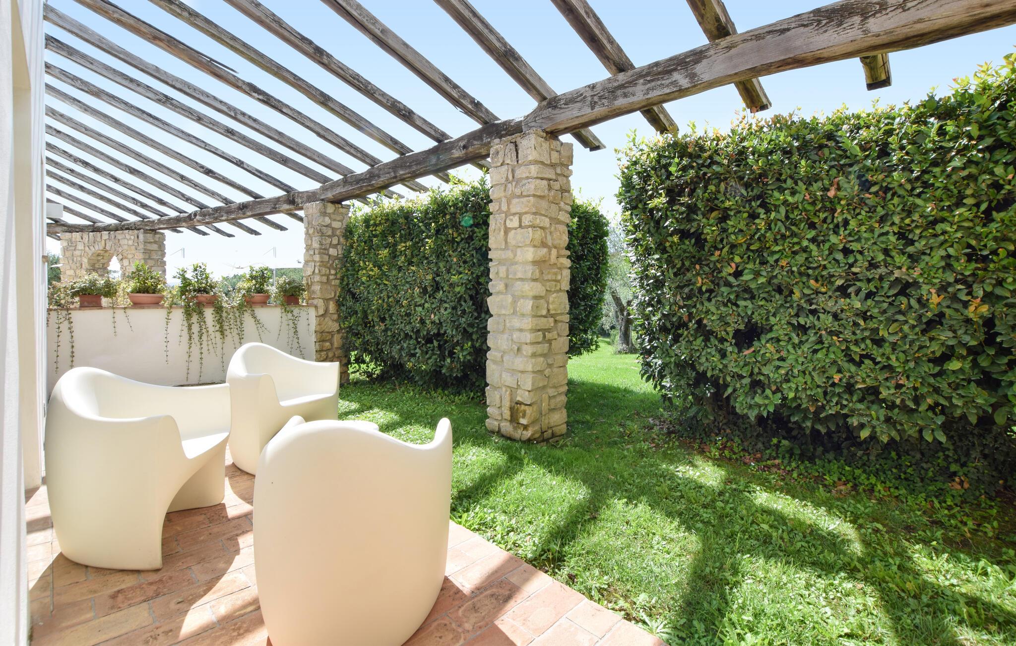 Udenfor venter en stor pool med solterrasse, komfortable liggestole og hvide parasoller – ideelt til stille stunder i solen. Mellem oliventræer og åbent landskab finder I her et sted, hvor afslapning og fornyet energi smelter harmonisk sammen.