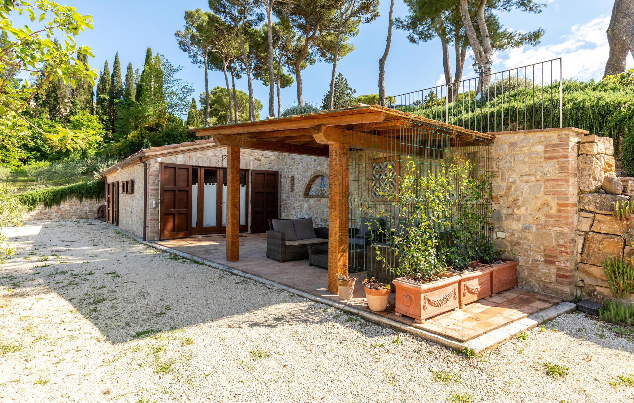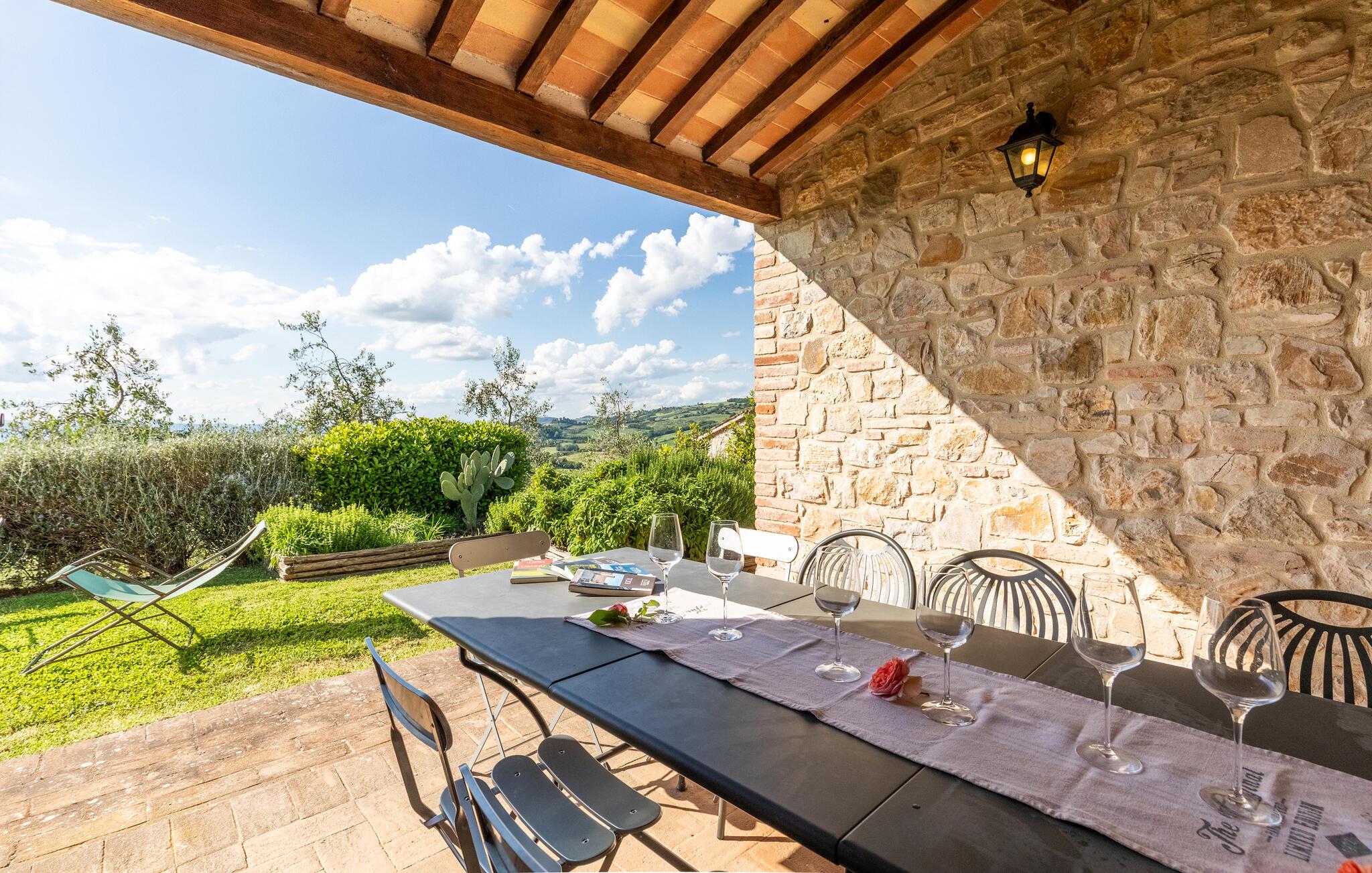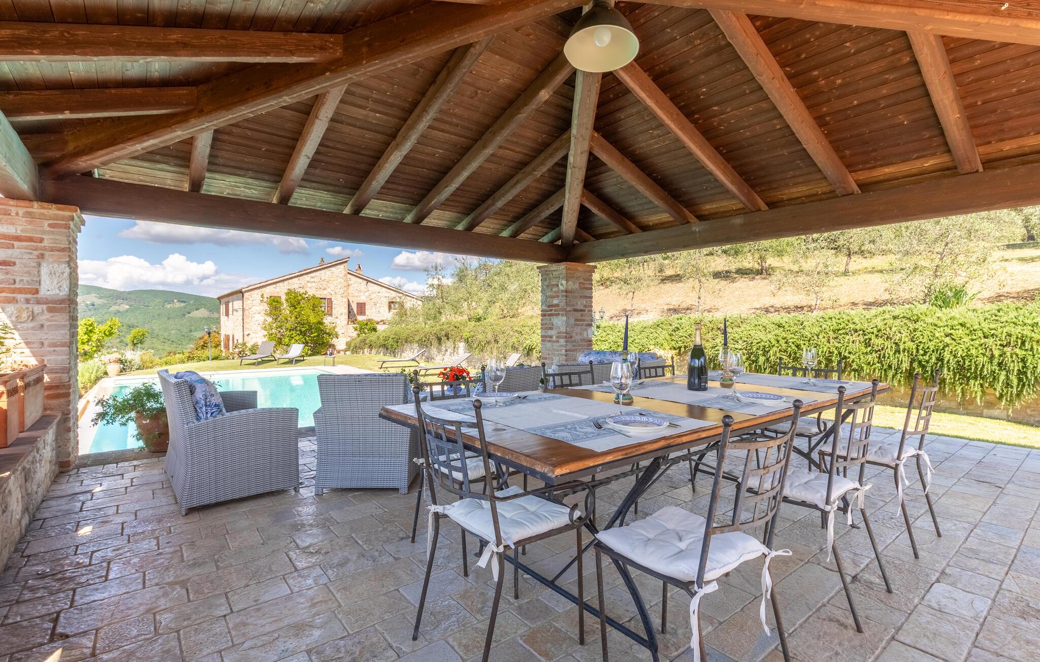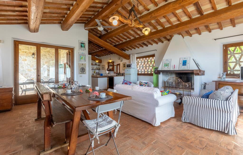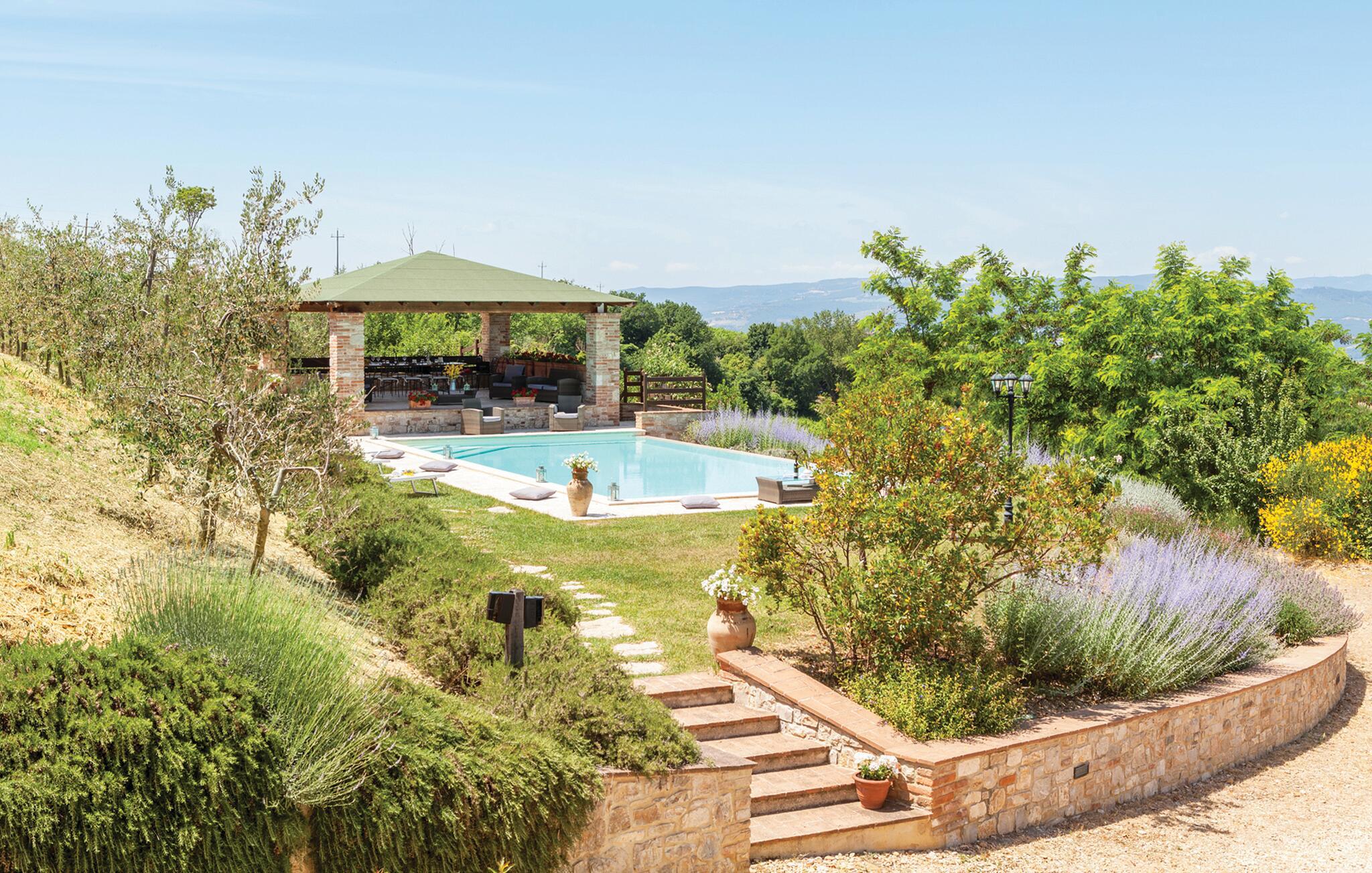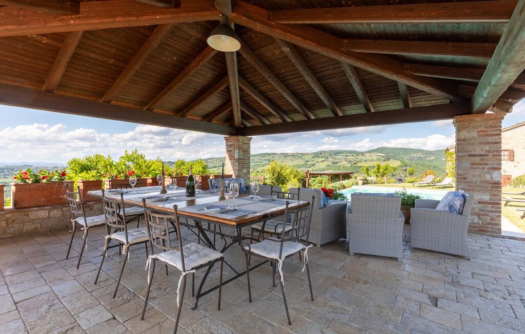 Hovedbygningen byder på den dejligste panoramaudsigt: Fra terrassen med havemøbler og pool kan I se Umbriens blide bakker. Kun få meter herfra ligger annekset, og i den tredje bygning bor husejerne af og til. Til eksklusiv rådighed for gæsterne i den velpassede have er overløbspoolen, den store panorama-pavillon til måltider i det fri op ad stengrill med udendørs køkken og pejs. I denne rustikke bolig kan I stadig se oprindelige, værdifulde materialer, møblerne er dels antikke og grillens fliser er fra Sicilien.