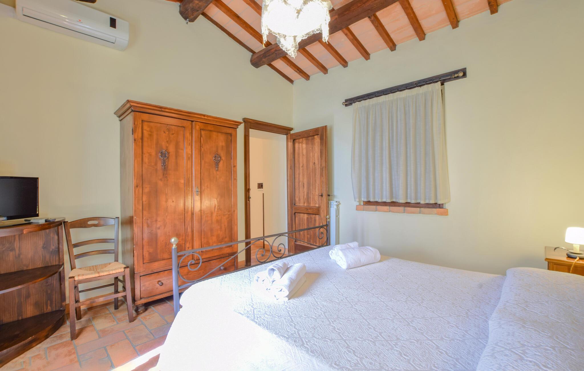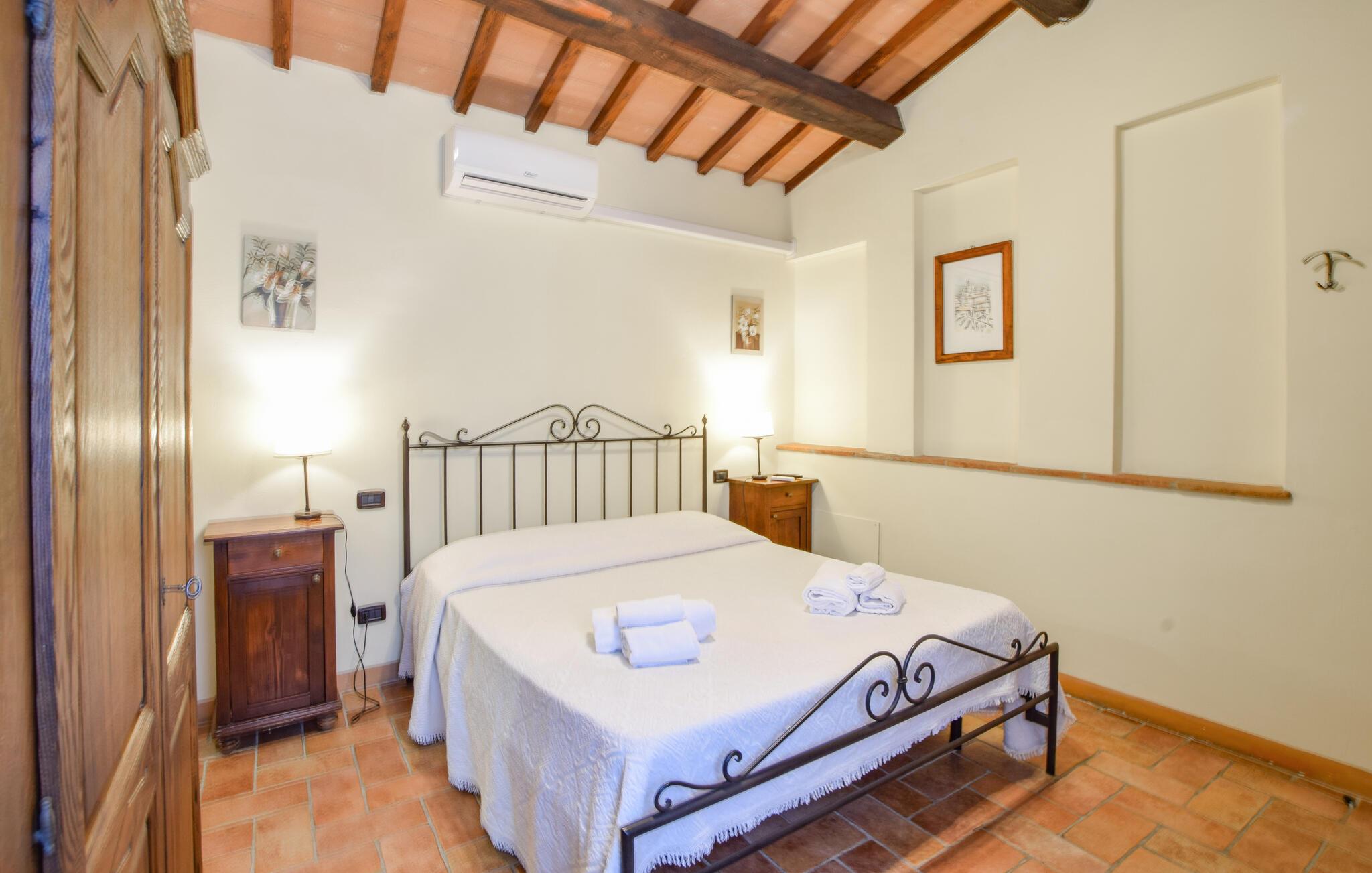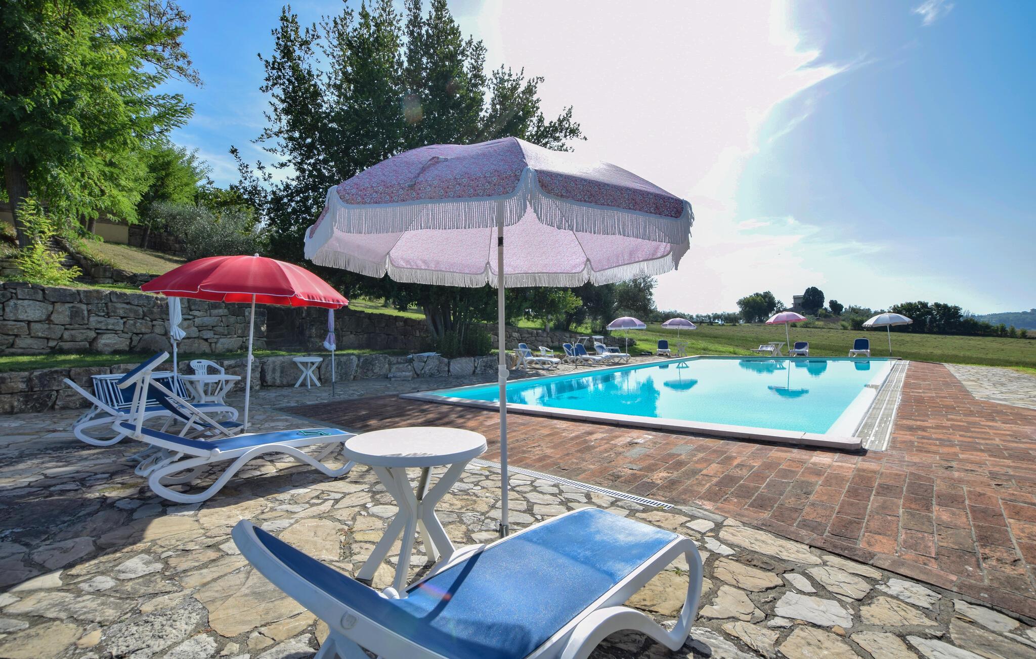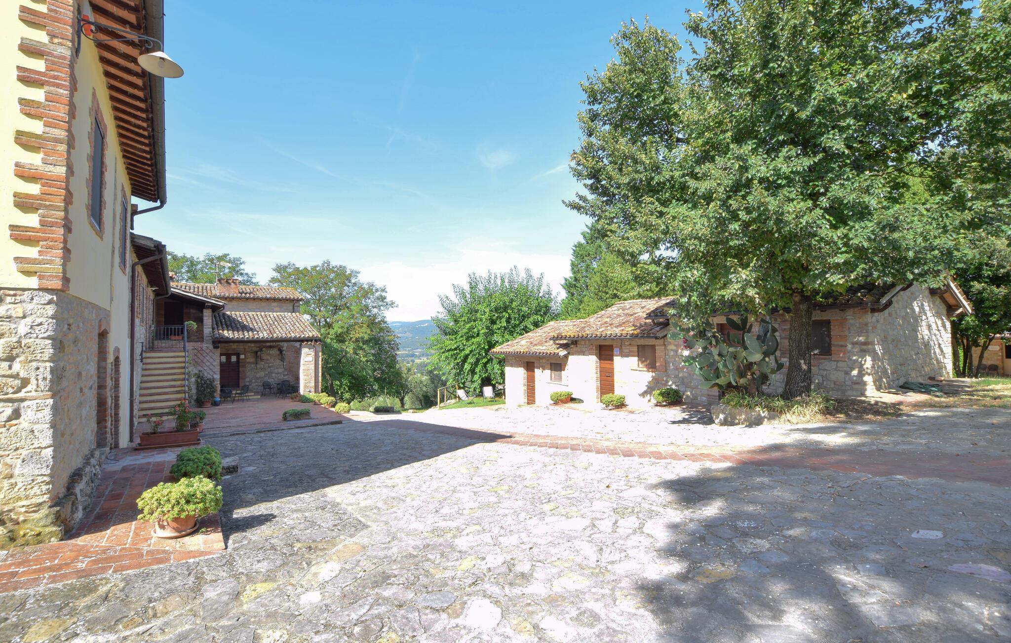 Oplev en afslappende ferie i denne ferielejlighed med fælles pool og historisk præg. Denne lejlighed er perfekt til en afslappende flugt fra hverdagen. Beliggende i et traditionelt bondehus i umbrisk landlig stil, byder den på imponerende træbjælkelofter og rustikke møbler. Slap af her med en aromatisk espresso, lyt til jeres yndlingsmusik, eller træn i fitnessrummet. Gå ud på den naturstensbelagte terrasse om morgenen og nyd en forfriskende dukkert i den store fælles swimmingpool. Slap af på en liggestol med udsigt over det smukke landskab og byen Todi. Om aftenen kan I bruge den fælles grill og afslutte dagen med en fin italiensk vin. Nyd lange vandreture eller cykelture gennem Umbriens bølgende bakker, der er oversået med olivenlunde og vinmarker. I Todi venter maleriske pladser, middelalderpaladser og en betagende udsigt fra bymurene over Tiberdalen på jer. Bliv fortryllet af de små gyder, caféer og kunsthåndværkerbutikker, der giver stedet sin særlige charme. Blandt cypresser, marker og rolige klostre vil I opleve den uspolerede skønhed i det umbriske landskab. Bemærk: Brug af det professionelle køkken med festlokale og indendørsspabad er tilgængelig efter anmodning og mod et gebyr.