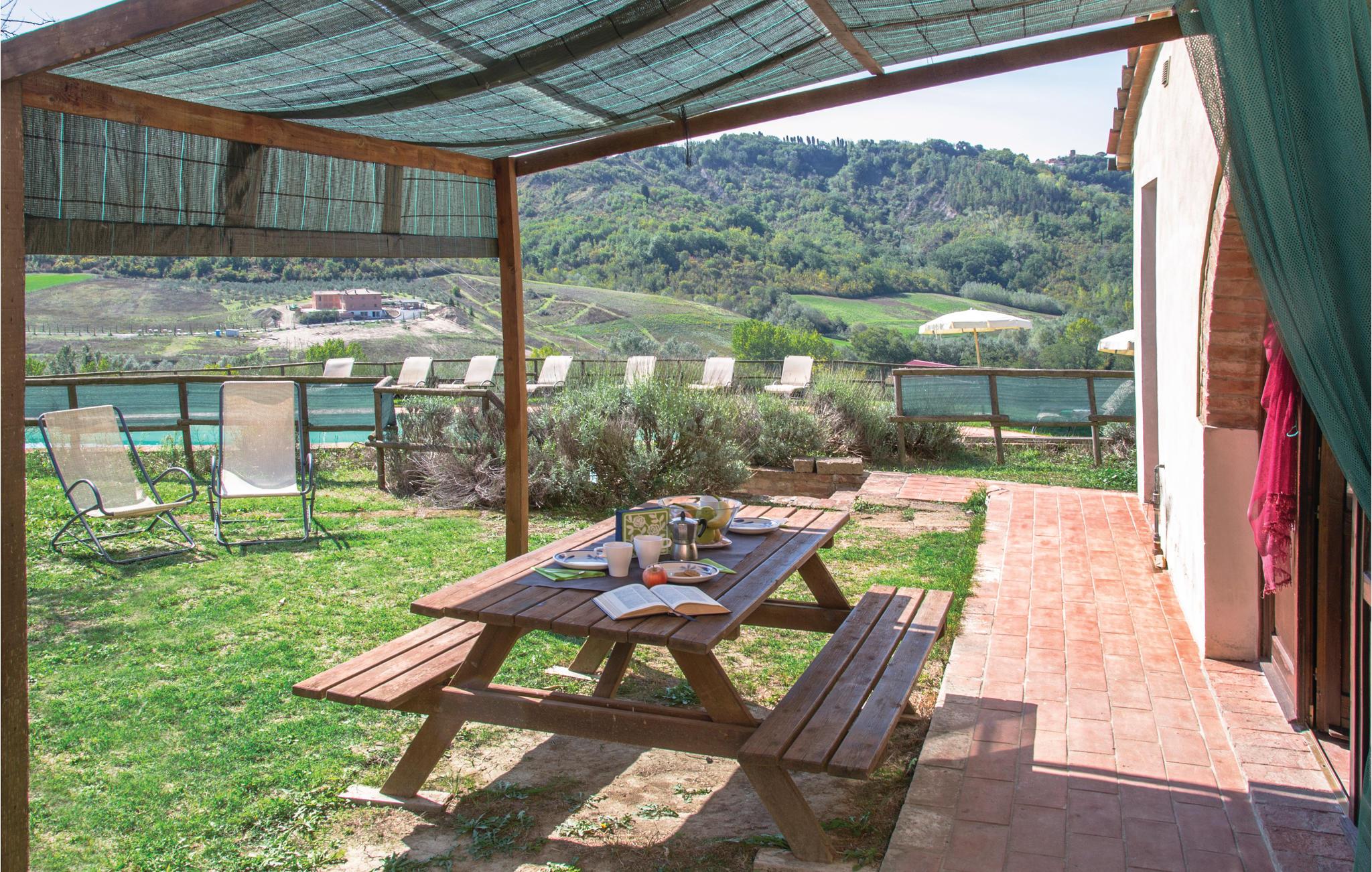 Feriehus med fælles pool i hjertet af Toscana på en agriturismo-gård mellem San Gimignano og Volterra. Huset ligger på en bjergskråning med vidunderlig udsigt over de omkringliggende dale. Gæsterne har adgang til en skøn overdækket og møbleret terrasse, hvor I kan spise ude og nyde udsigten over de toscanske vinmarker og olivenlunde. Placeringen af ??huset er ideel, hvis I vil besøge de mange kunstbyer og maleriske steder i området, såsom UNESCO-byen San Gimignano med det velbevarede centrum og en række gamle tårn. I Siena kan I besøge katedralen og den smukke Piazza del Campo. I Firenze kan I udforske den imponerende gamle bydel og domkirken, Michelangelos David, Ponte Vecchio og Uffizien. De af jer, der sætter pris på det lokale køkken og fremragende toscanske vine, kan se frem til de utallige vinkældre, charmerende trattorier og restauranter. 47 km til Pisa og det skæve tårn. 52 km til den dejlige by Lucca med de velbevarede gamle bymure.