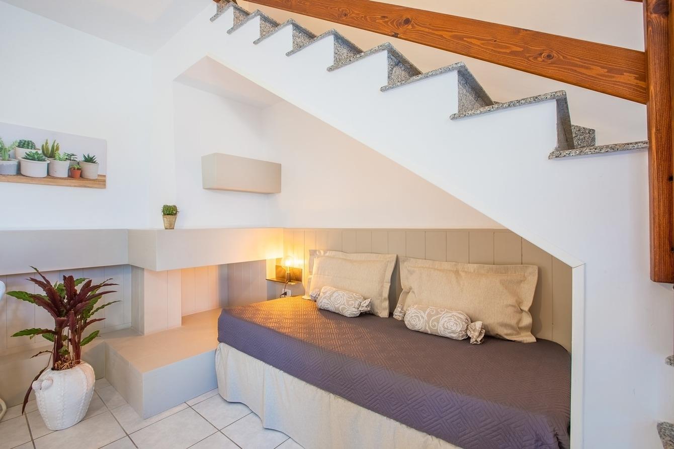 Es ist auf zwei Ebenen: Erdgeschoss mit Wohnzimmer, Küche, Einzelbett und Sofa.
